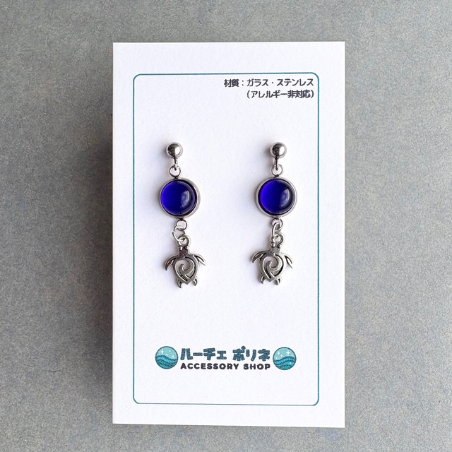 ■ホヌの揺れるピアス 深い海の中から水面を目指すウミガメのイメージとなるよう、濃い青の琉球ガラスの粒を使用しました。 ⸻ 【素材】 ・金属部分:ステンレス(アレルギー非対応) ・ガラス:琉球ガラス 【サイズ】 【ご注意】 ・ハンドメイド商品ですので、色合いやテクスチャーに個体差があります。 ・お使いのモニター環境により、実物と色味が異なって見える場合があります。 ・琉球ガラスは特有の気泡や内包物を含んでいます。傷のように見えることもありますが、それも魅力の一つとしてお楽しみください。