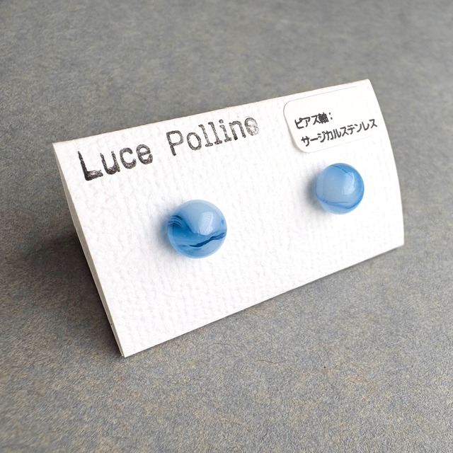 ■波模様の粒 奥行きのある水色のガラスの粒の表面には、紫色のラインが模様を描きます。 日常に使いやすい小さめサイズです。 直径約7.0mm ーーー 【素材】 ・琉球ガラス、サージカルステンレス 【ご注意】 ・ハンドメイド商品ですので、色合いやテクスチャーに個体差があります。 ・ガラス製品ですので、劣化や変色の心配もなく、長くお楽しみいただけます。 ・お使いのモニター環境により、実物と色味が異なって見える場合があります。 ・琉球ガラスには特有の気泡や内包物が含まれています。傷のように見えることもありますが、それもこの商品の魅力としてお楽しみください。