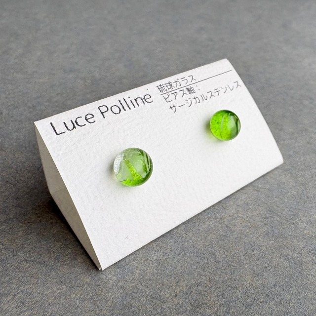 透明な部分と明るい緑色のバランスが良い琉球ガラスのピアスです。 直径約6.9mm ーーー 【素材】 ・琉球ガラス、サージカルステンレス 【ご注意】 ・ハンドメイド商品ですので、色合いやテクスチャーに個体差があります。 ・ガラス製品ですので、劣化や変色の心配もなく、長くお楽しみいただけます。 ・お使いのモニター環境により、実物と色味が異なって見える場合があります。 ・ガラスには特有の気泡や内包物が含まれています。傷のように見えることもありますが、それもこの商品の魅力としてお楽しみください。