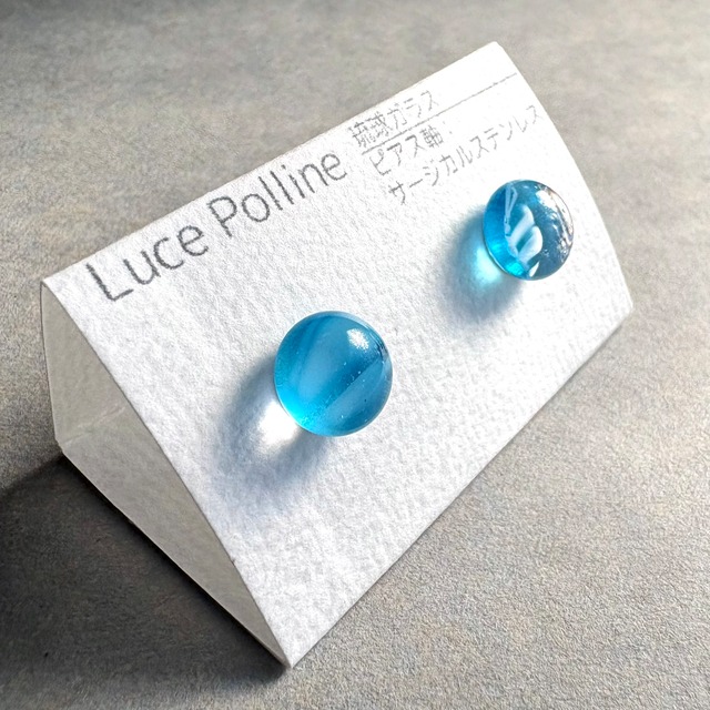 水色と青と紺色が複雑な模様を描くピアスです。 透明部分が多いので実際のサイズよりも小さく軽く見えます。 直径約 9.8mm ーーー 【素材】 ・琉球ガラス、サージカルステンレス 【ご注意】 ・ハンドメイド商品ですので、色合いやテクスチャーに個体差があります。 ・ガラス製品ですので、劣化や変色の心配もなく、長くお楽しみいただけます。 ・お使いのモニター環境により、実物と色味が異なって見える場合があります。 ・ガラスには特有の気泡や内包物が含まれています。傷のように見えることもありますが、それもこの商品の魅力としてお楽しみください。