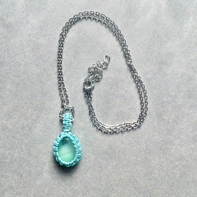 ■水平線のペンダント 琉球ガラスの個性的な粒をマクラメ編みで包んでペンダントにしました。 ペンダントトップ長 39.4mm ーーー 【素材】 ・琉球ガラス、ワックスコード(細)、合皮ネックレス45cm 【ご注意】 ・ハンドメイド商品ですので、色合いやテクスチャーに個体差があります。 ・ガラス製品ですので、劣化や変色の心配もなく、長くお楽しみいただけます。 ・お使いのモニター環境により、実物と色味が異なって見える場合があります。 ・ガラスには特有の気泡や内包物が含まれています。傷のように見えることもありますが、それもこの商品の魅力としてお楽しみください。