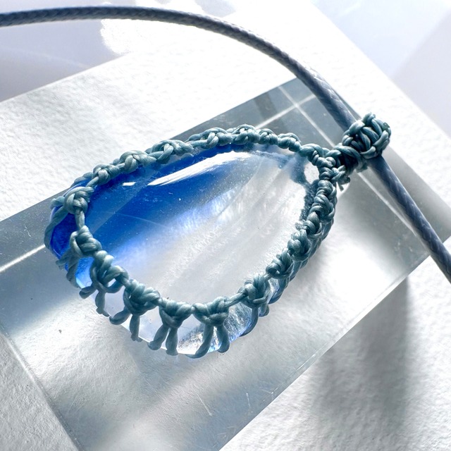 ■空の雫のペンダント 琉球ガラスの個性的な粒をマクラメ編みで包んでペンダントにしました。 ペンダントトップ長 37.8mm ーーー 【素材】 ・琉球ガラス、ワックスコード(細)、合皮ネックレス45cm 【ご注意】 ・ハンドメイド商品ですので、色合いやテクスチャーに個体差があります。 ・ガラス製品ですので、劣化や変色の心配もなく、長くお楽しみいただけます。 ・お使いのモニター環境により、実物と色味が異なって見える場合があります。 ・ガラスには特有の気泡や内包物が含まれています。傷のように見えることもありますが、それもこの商品の魅力としてお楽しみください。