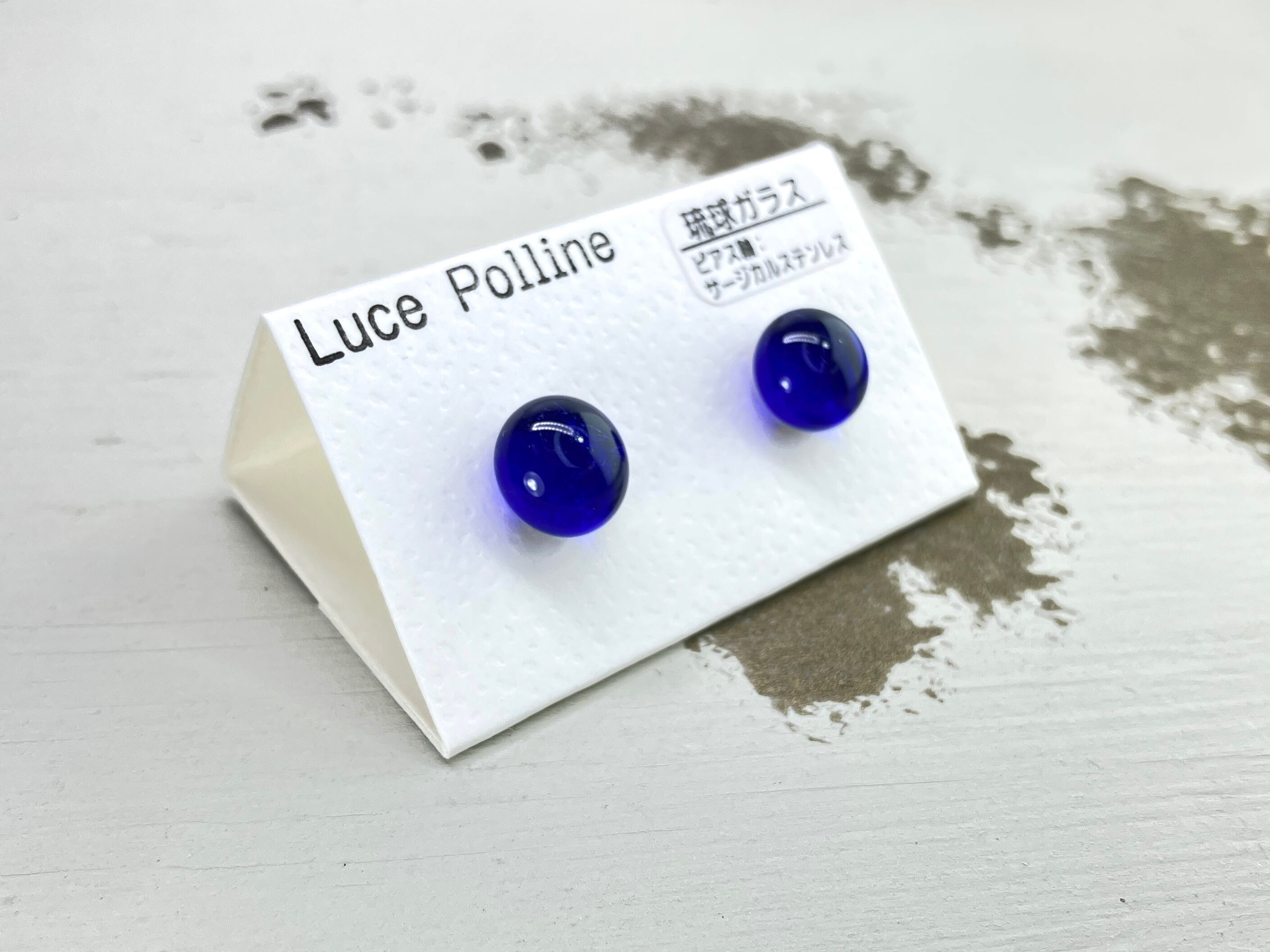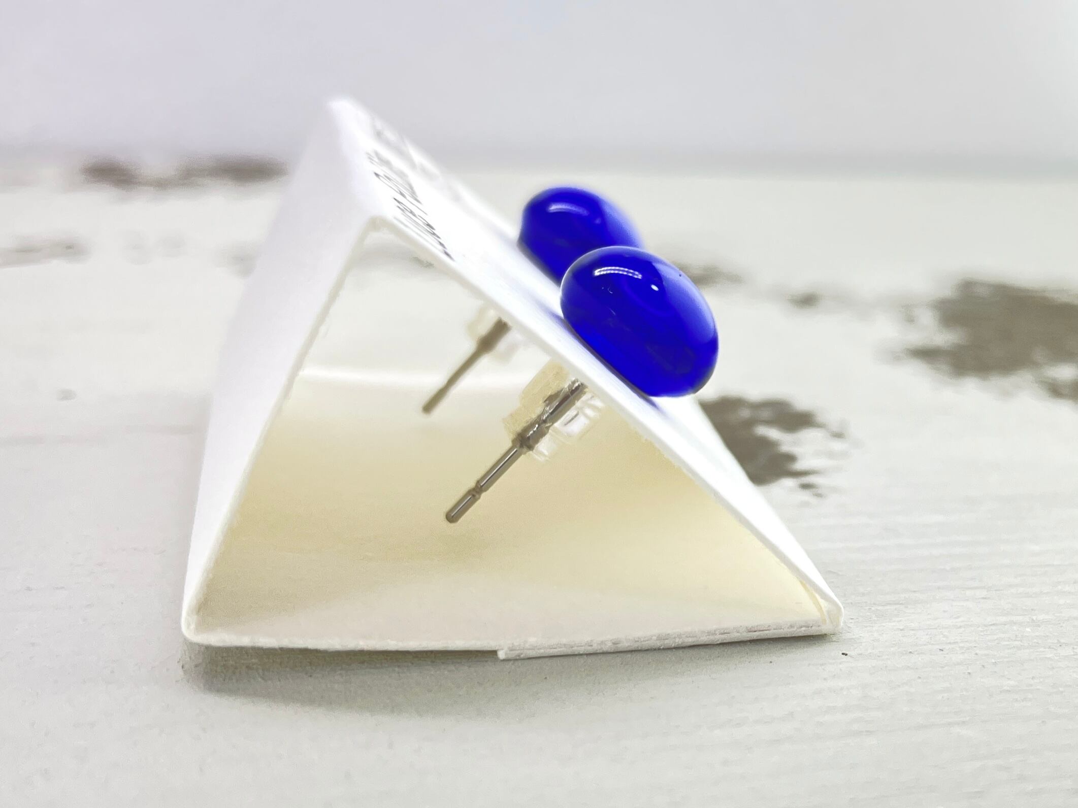 夜の海をイメージした透明な藍色の琉球ガラスを使用した「夜の海の粒」ピアスです。光が当たると、深い藍色の輝きが耳元で神秘的な印象を与えてくれます。