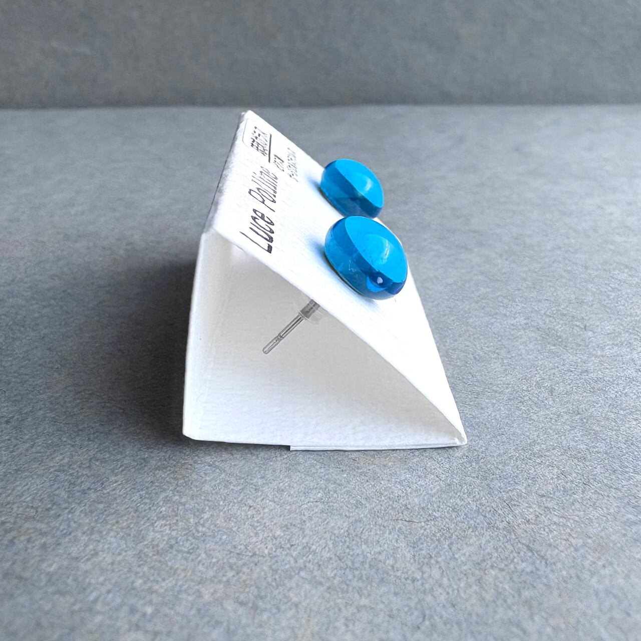 澄み切った水面を見上げるスキューバダイビングをイメージした琉球ガラスの「ダイビングブルーの粒」ピアスです。光が当たると、明るく透明なブルーが耳元で輝き、爽やかな印象を与えてくれます。