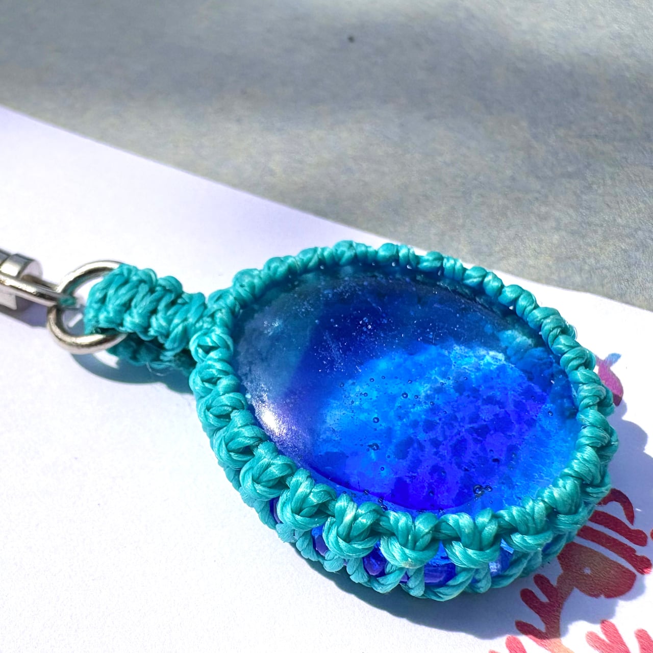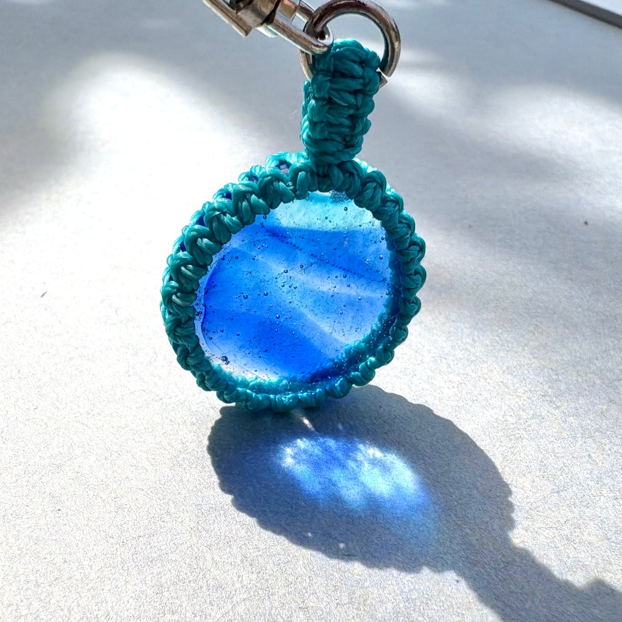 鮮やかな琉球ガラスのチャームは、まるで太陽の光を浴びた海の結晶のように輝きます。