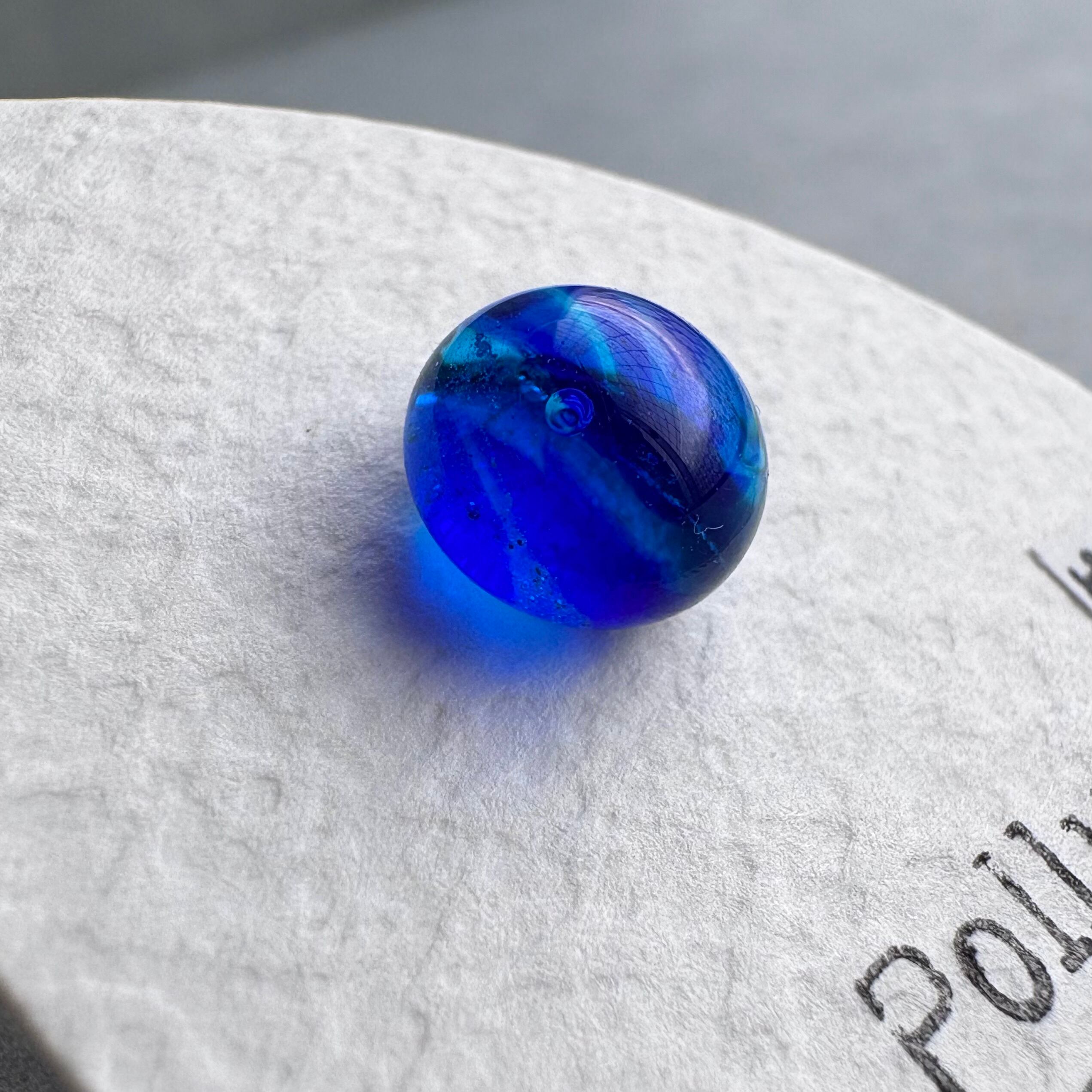 透明な青いガラスの中に濃淡の青いガラスが流れているガラスの粒です。