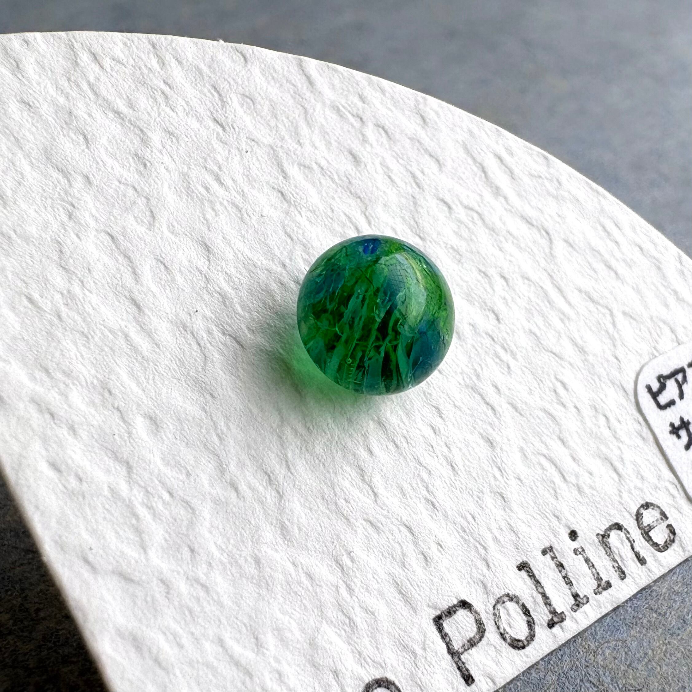 透明な緑色のガラスの中に濃い緑のたくさんのラインが流れていて、水の中でたゆたう水草のようなガラスの粒です。