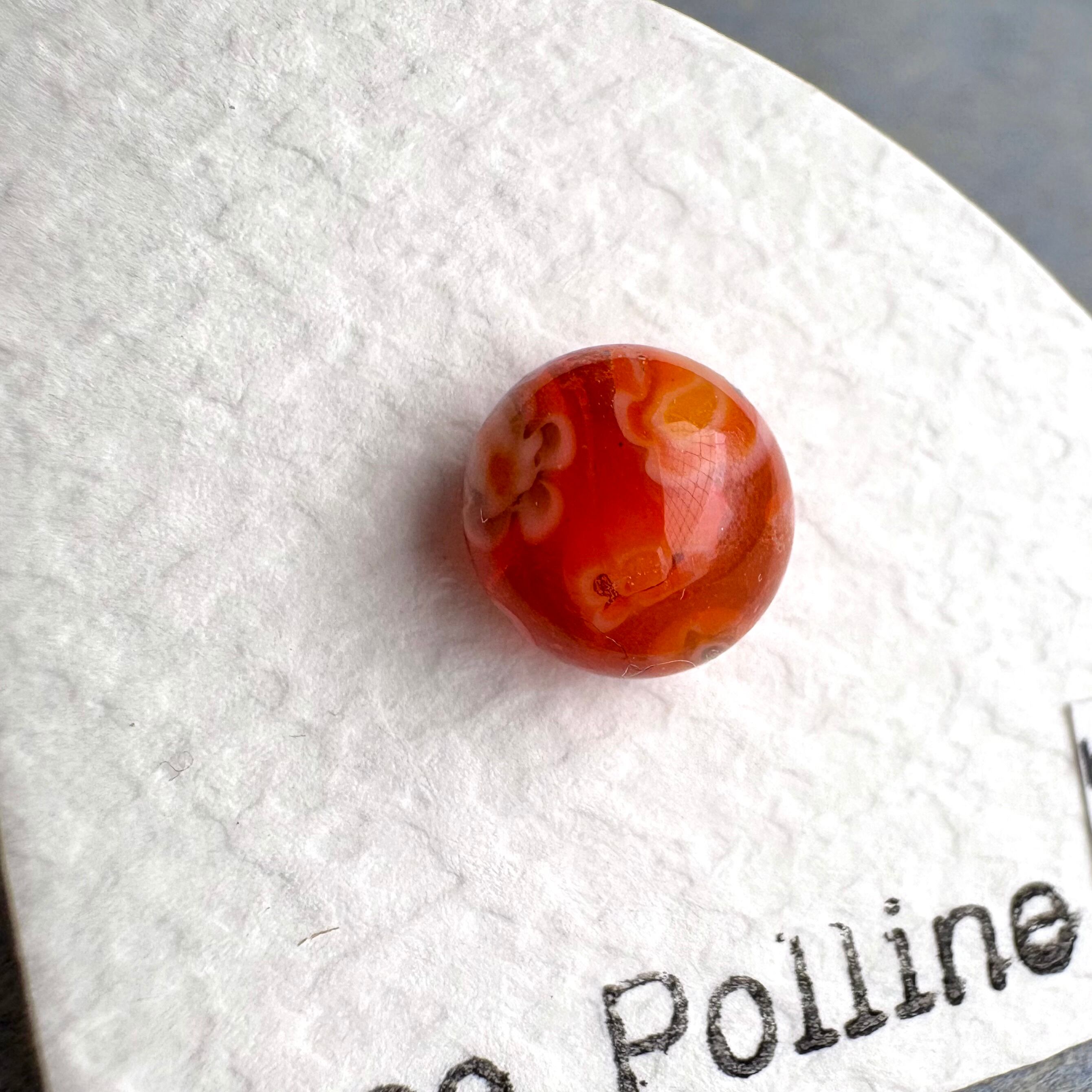 濃い透明なオレンジのガラスの中にいくつもの花がゆらめくガラスの粒です。