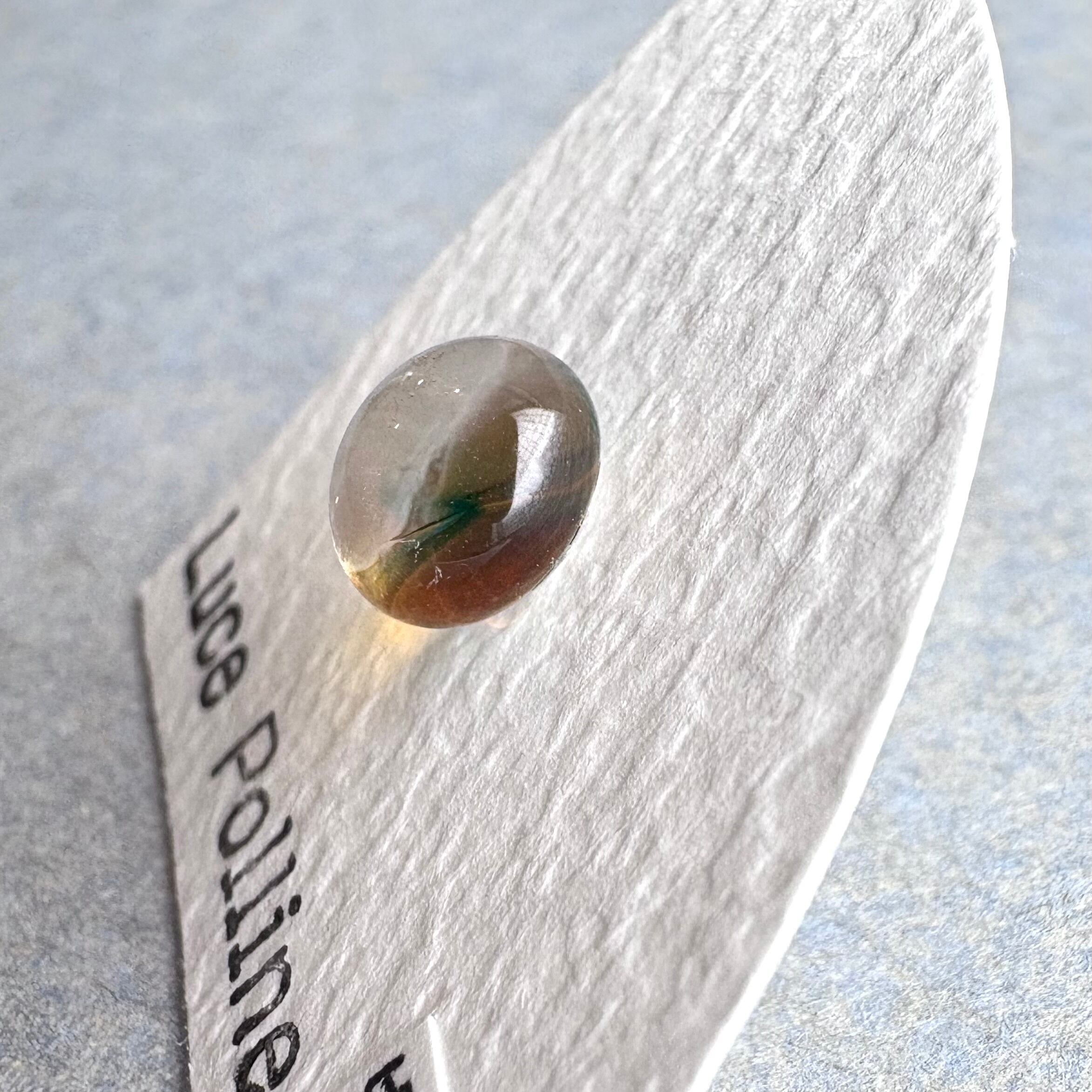 透明なガラスの底に茶色とかすかに青が流れているガラスの粒です。
