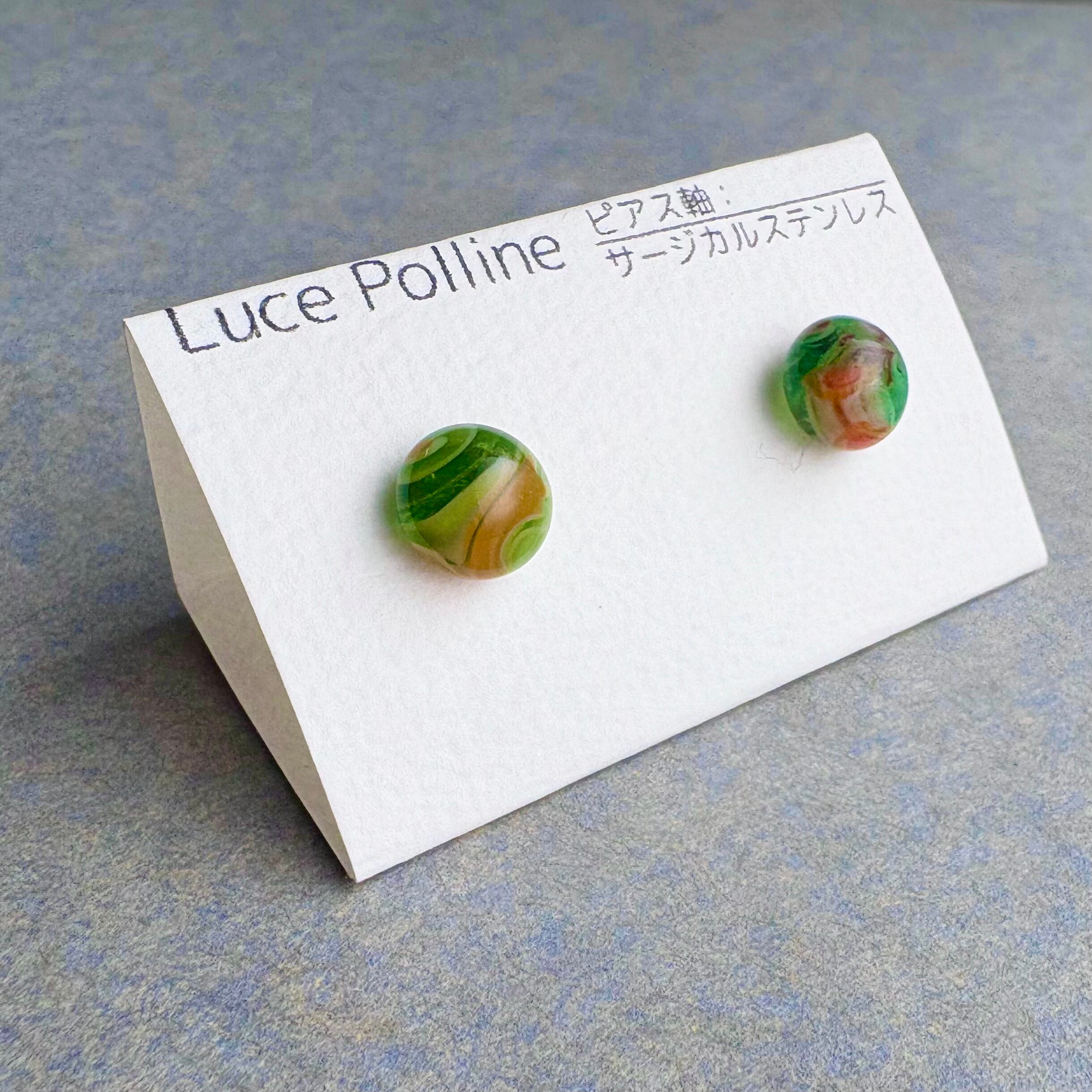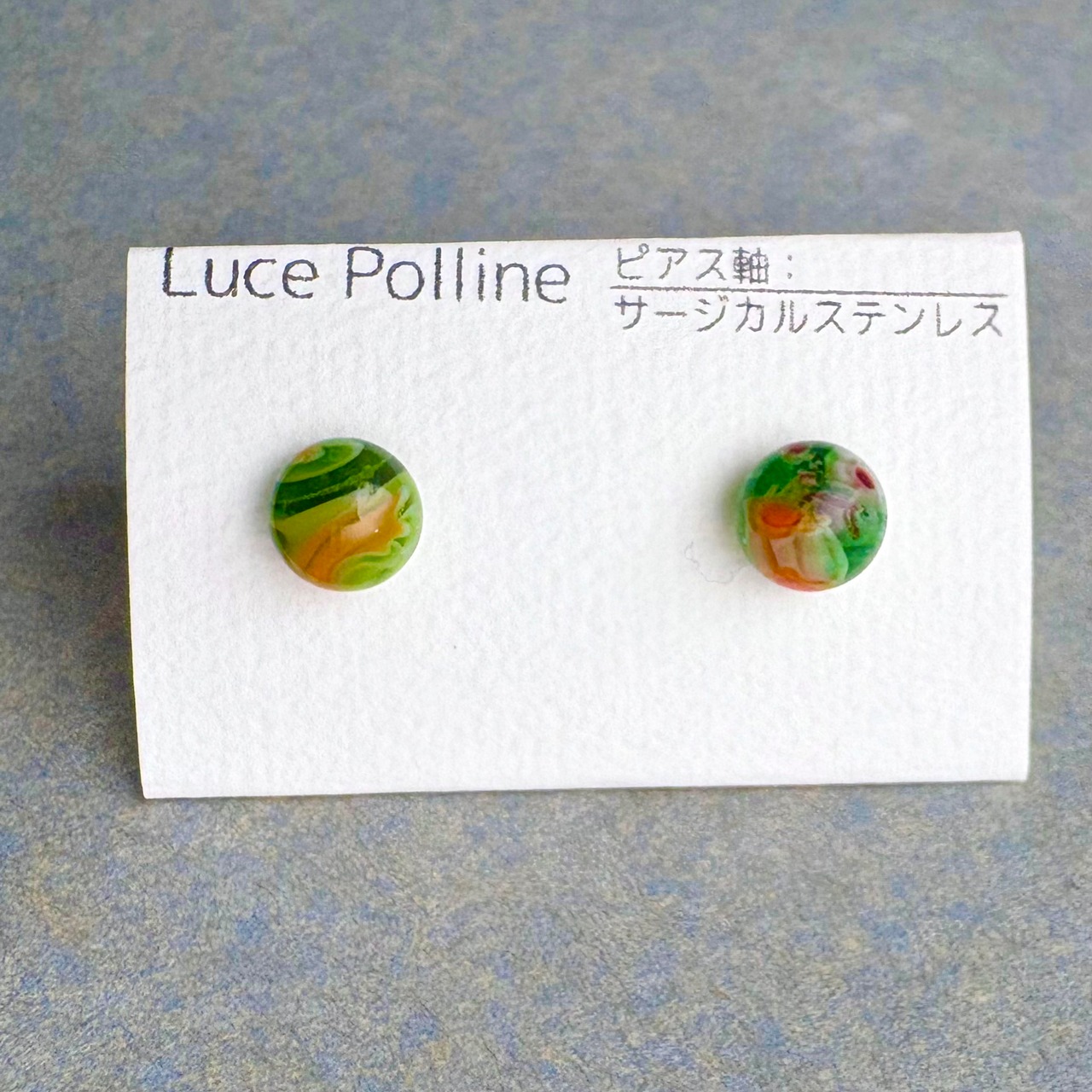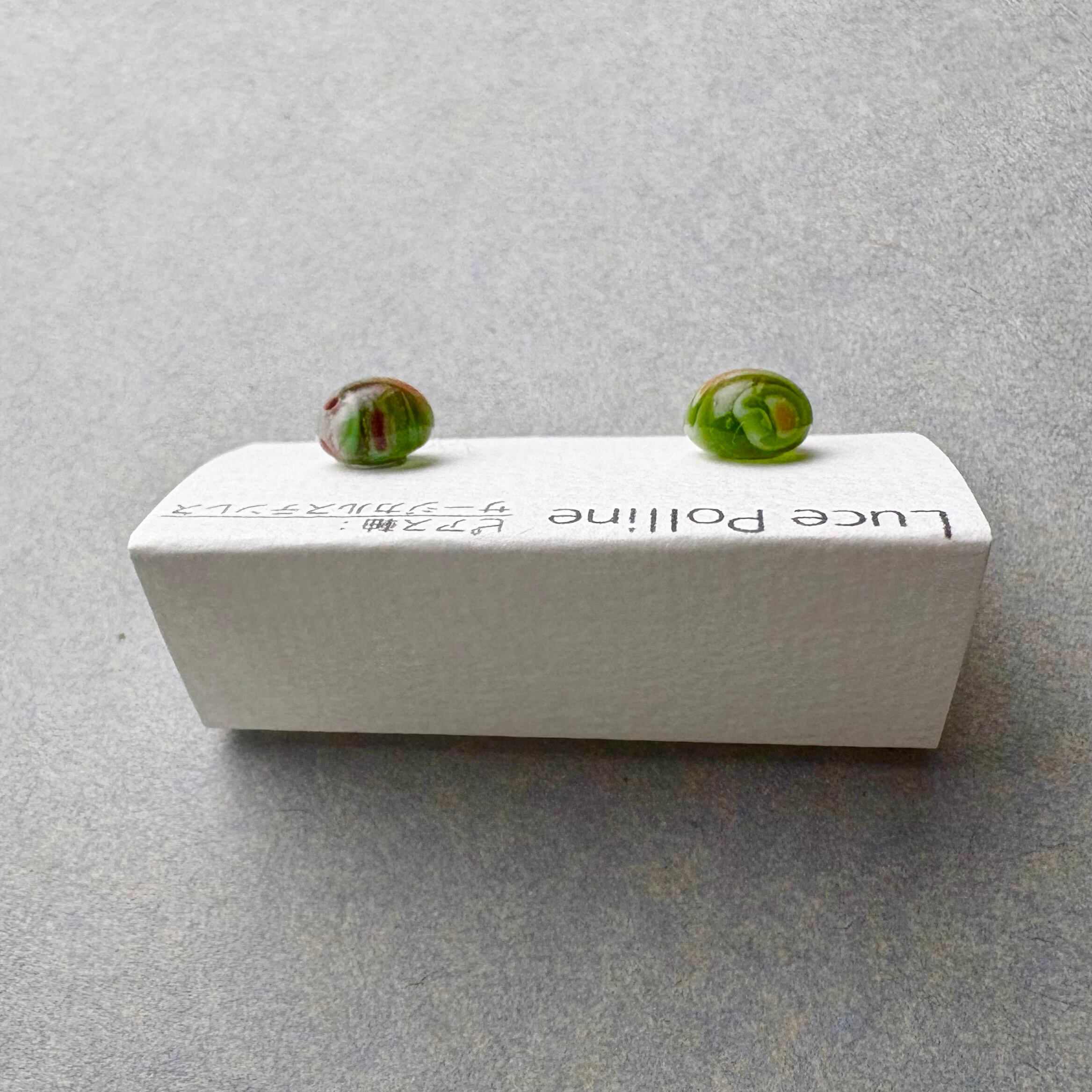 緑色に人参のようなオレンジ色、トマトの赤などが混じるガラスの粒です。