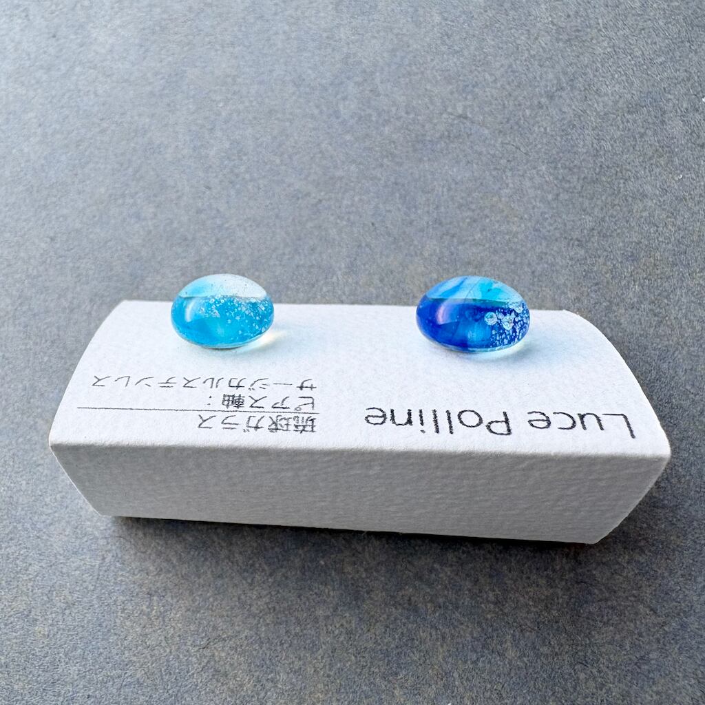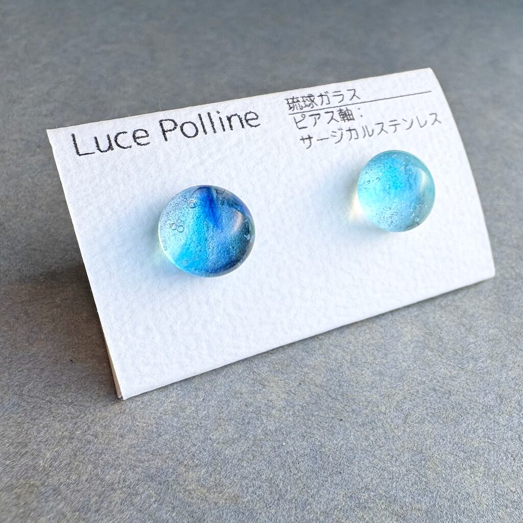 淡いブルーに気泡が混じり、夏の日の水遊びを思わせるガラスの粒です。