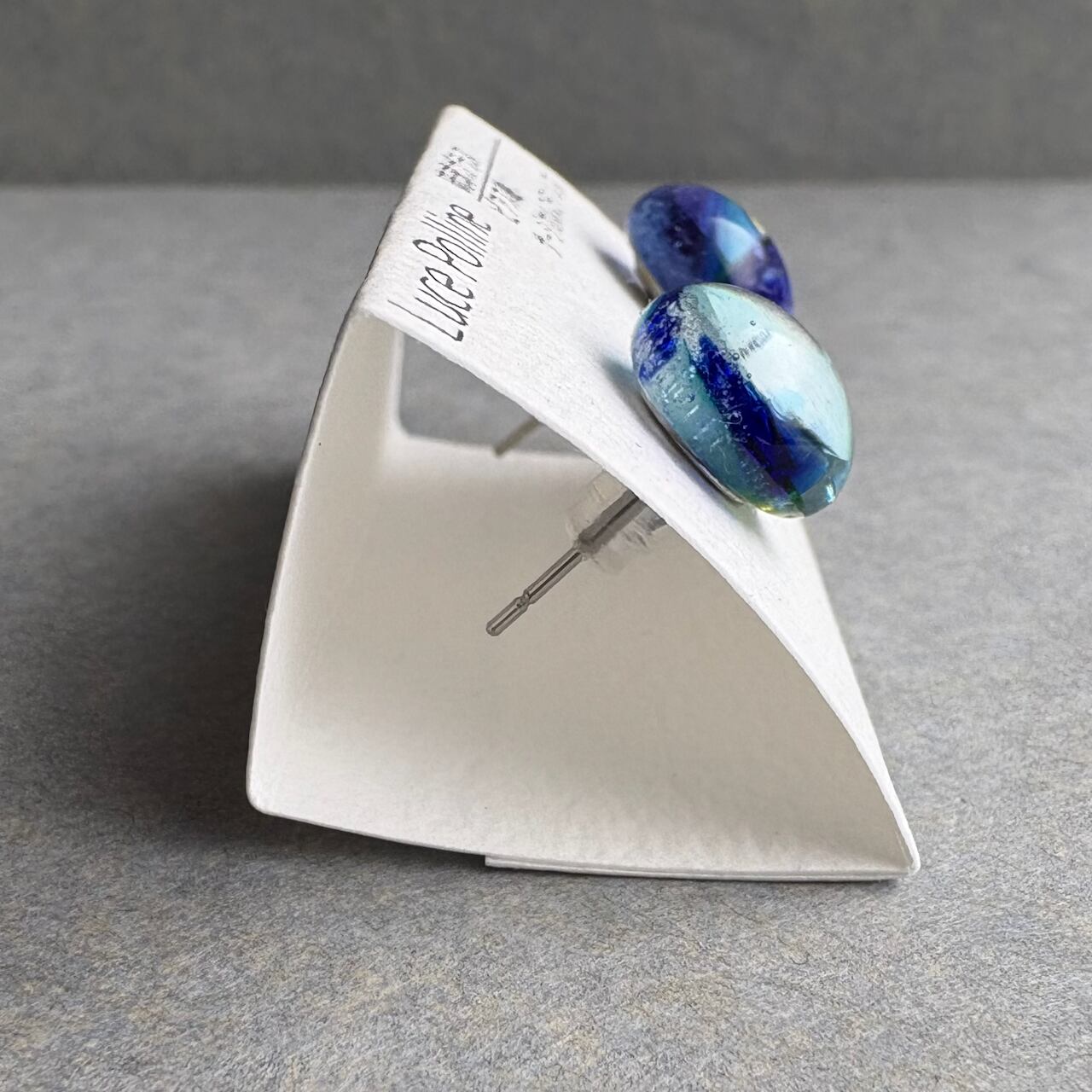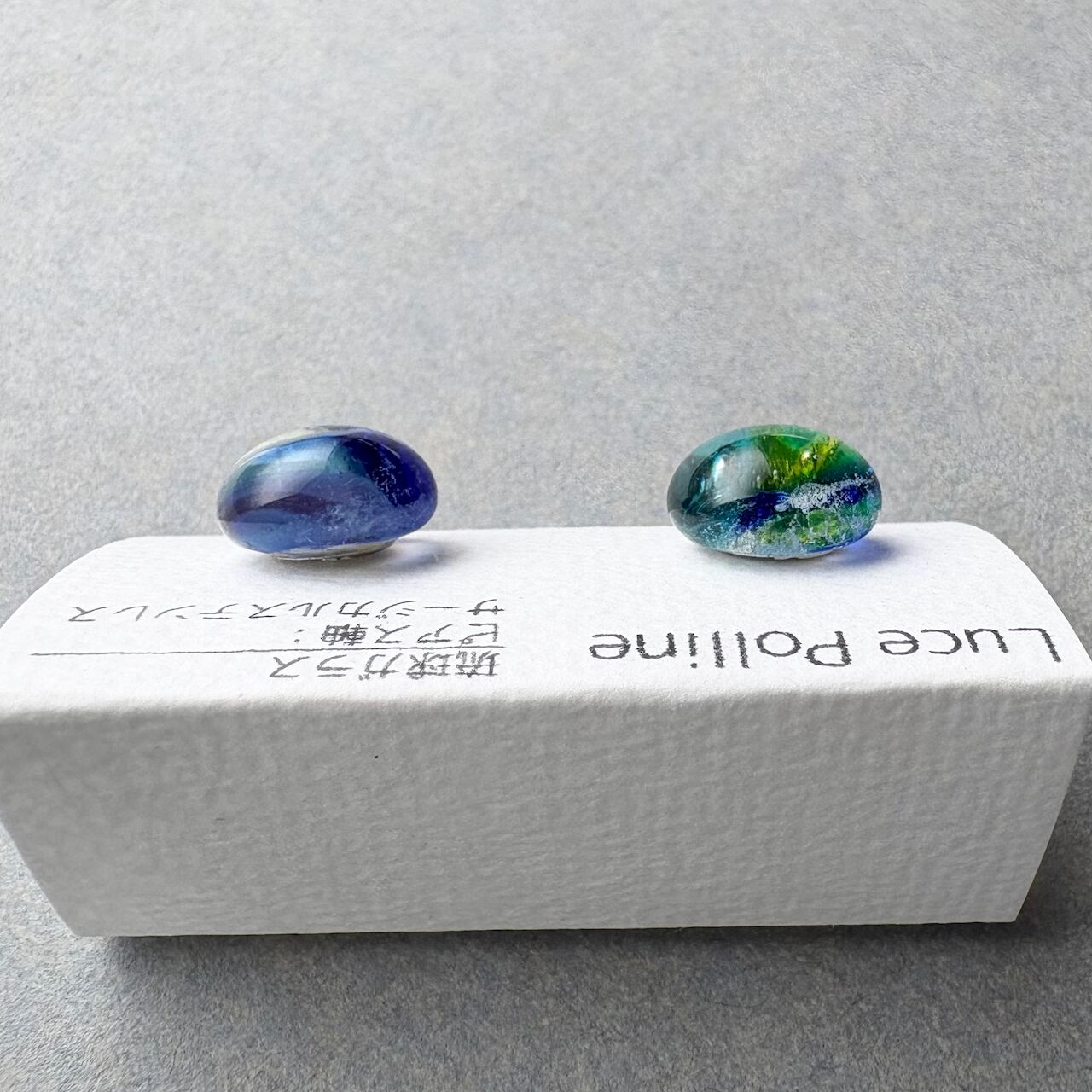 濃い青に緑や気泡が混じる複雑な模様のガラスの粒です。