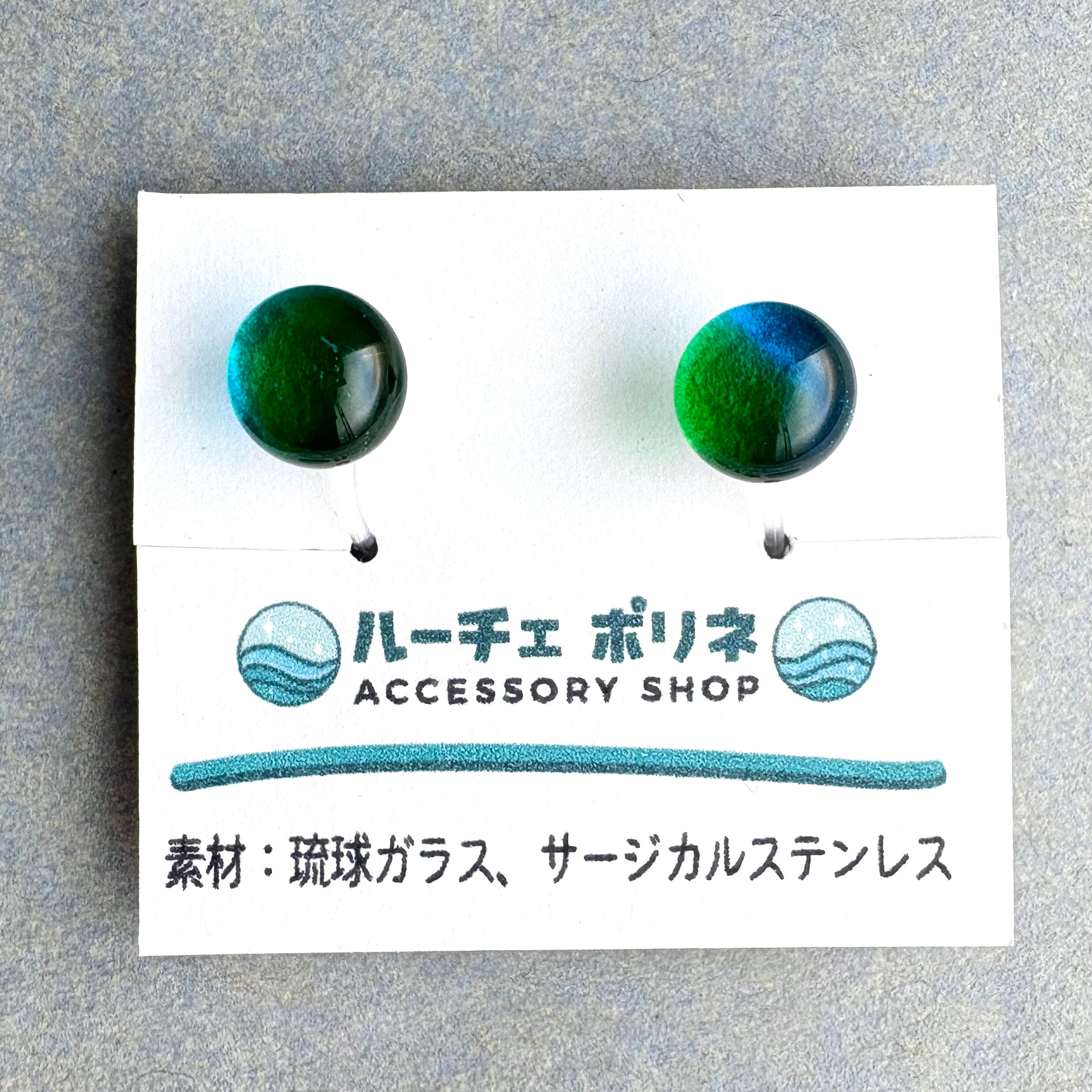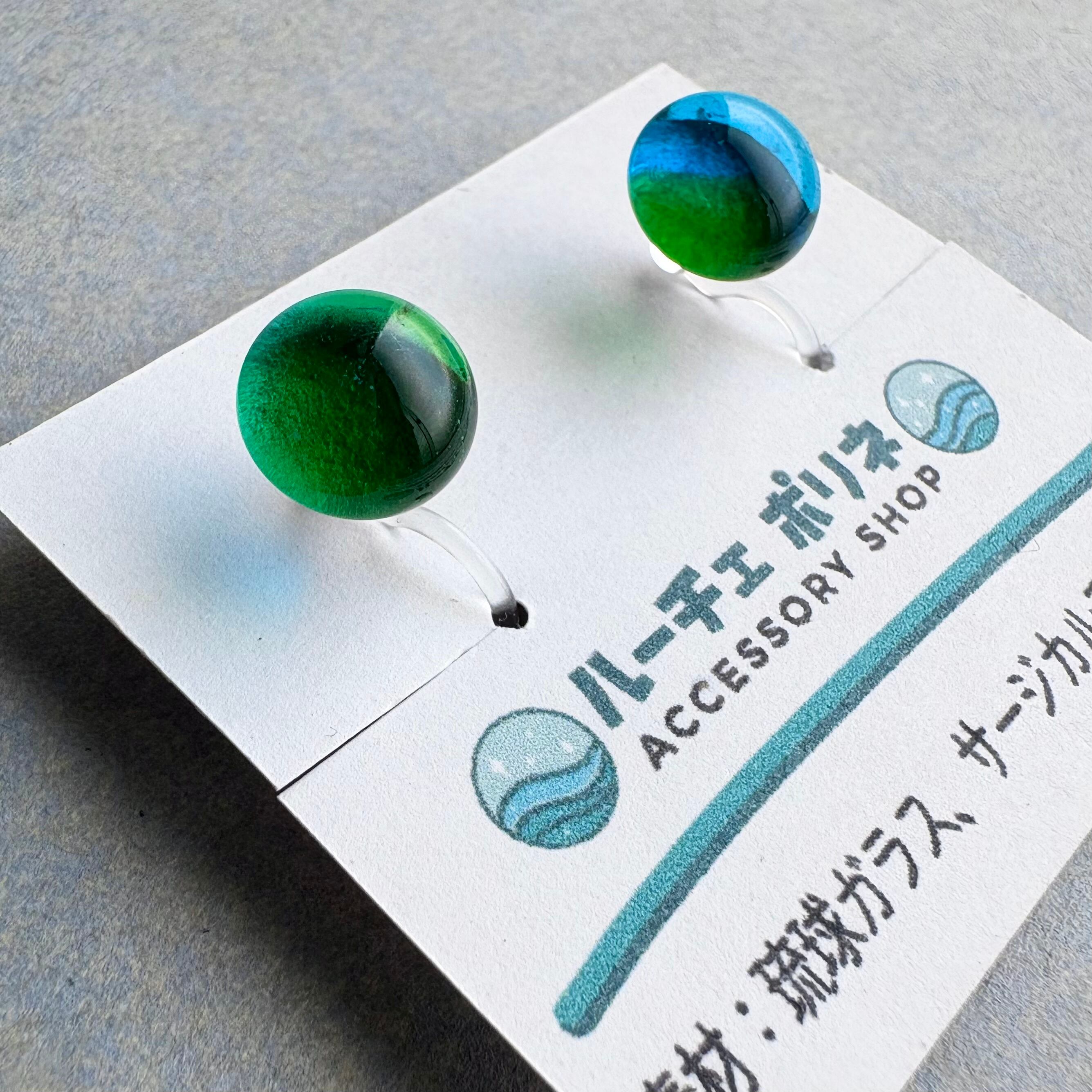 琉球ガラスの粒を樹脂製のノンホールピアスに仕立てました。