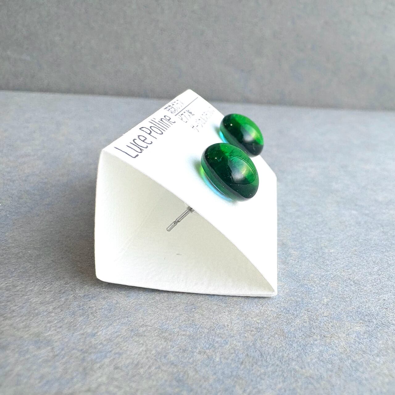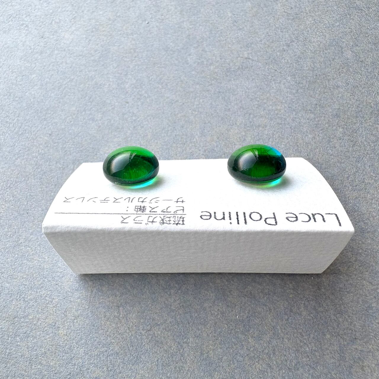 しっとりとした緑色にわずかに水色が混じり、覗き込むと森の香りがしてきそうなガラスの粒です。