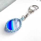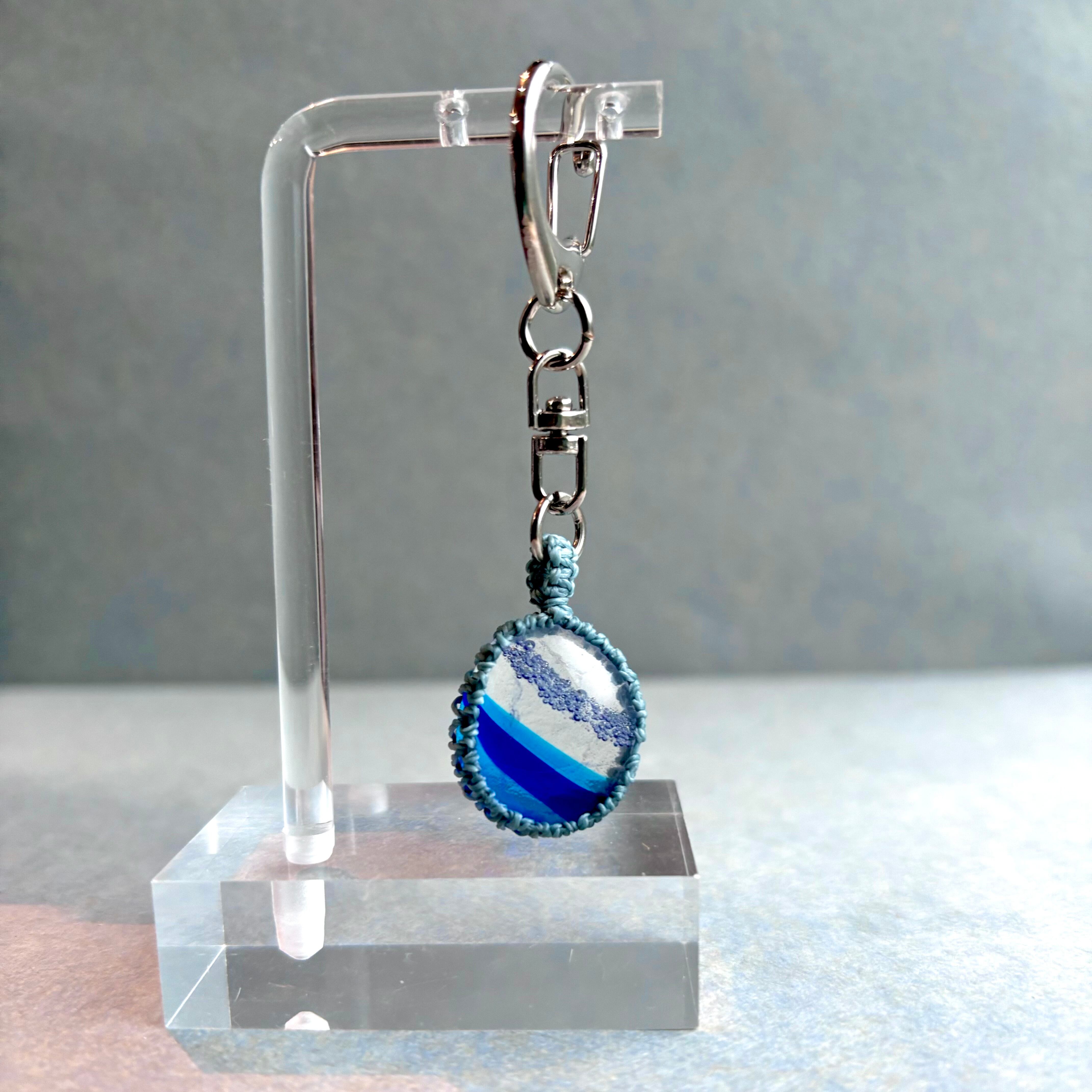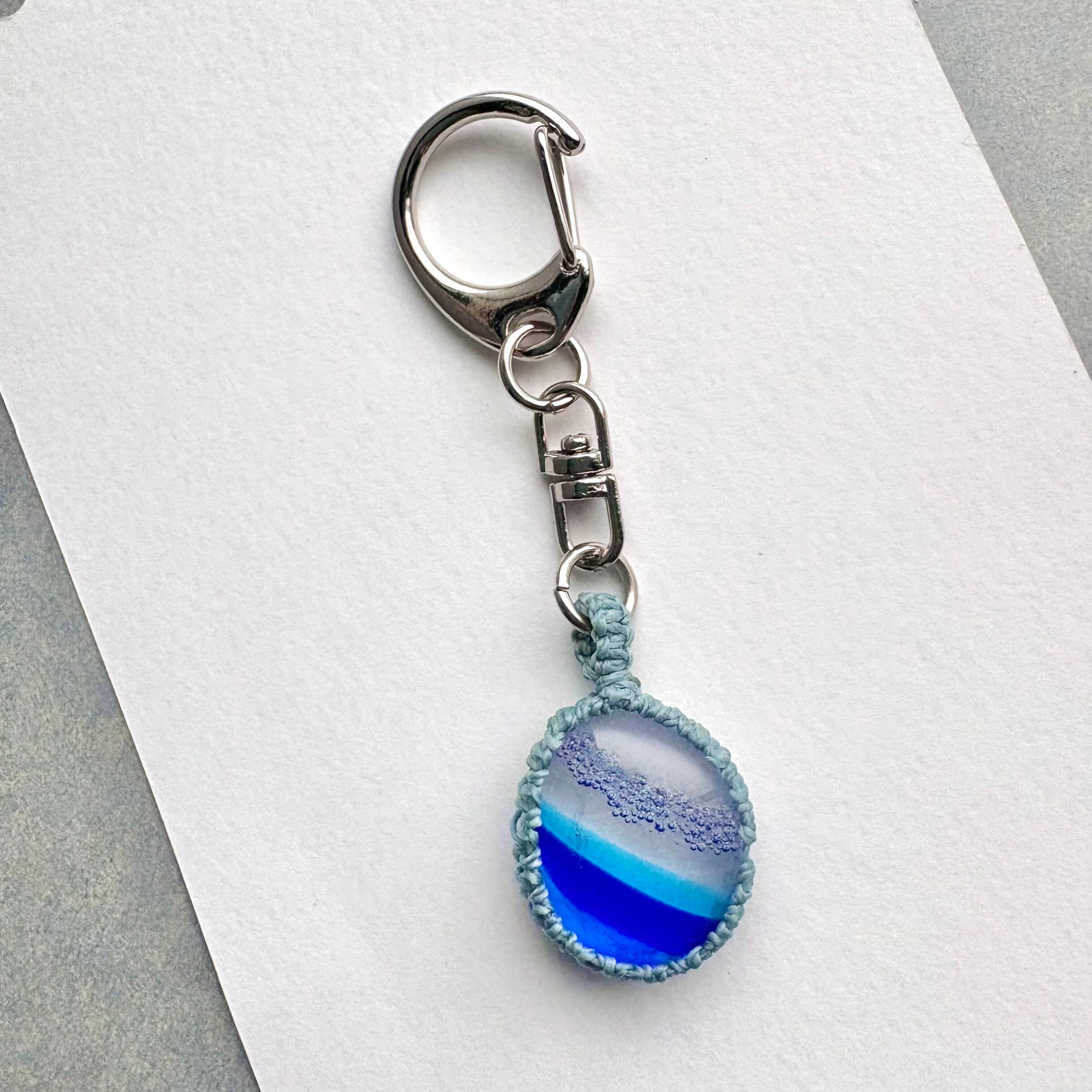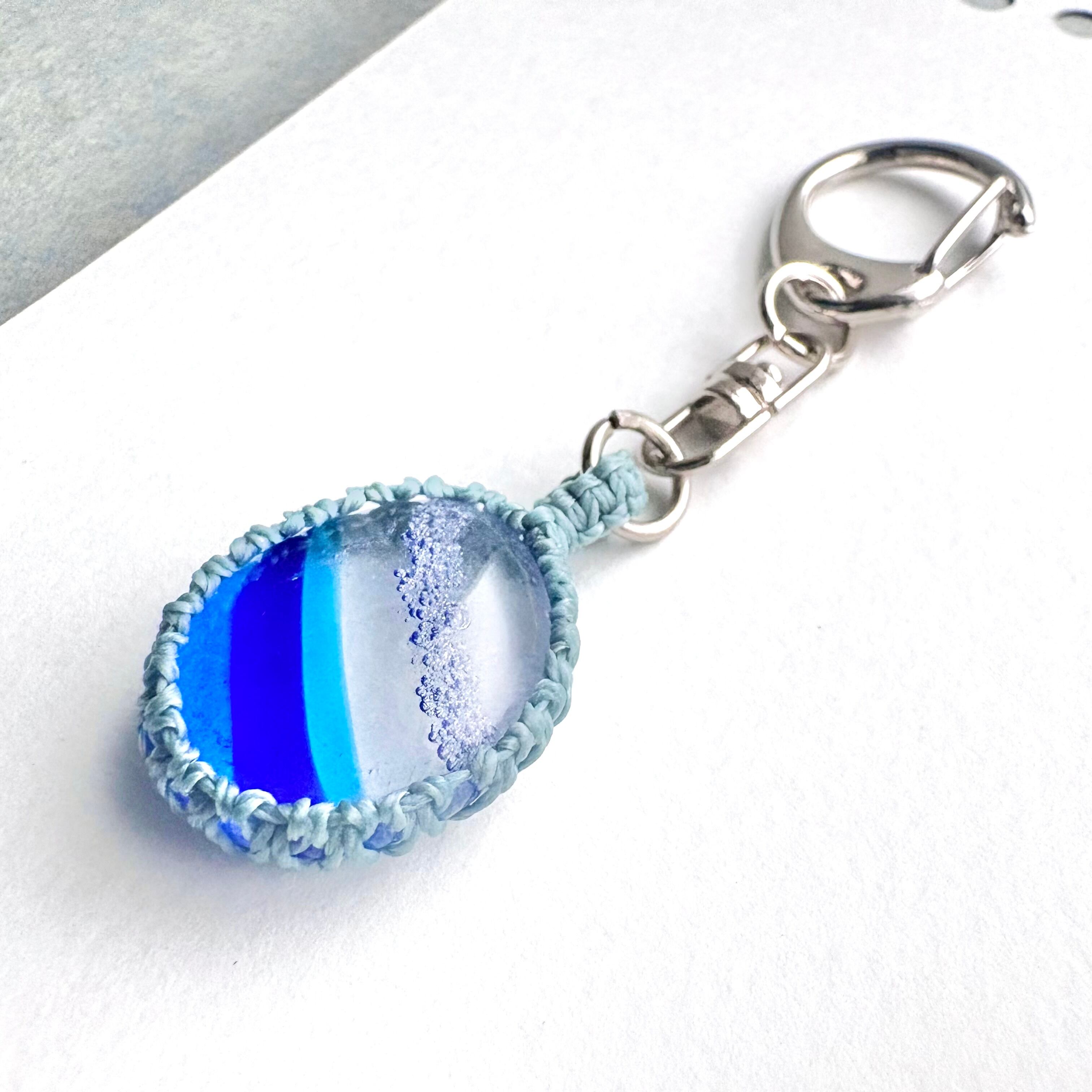 琉球ガラスの個性的な粒をマクラメ編みで包んでチャームにしました。