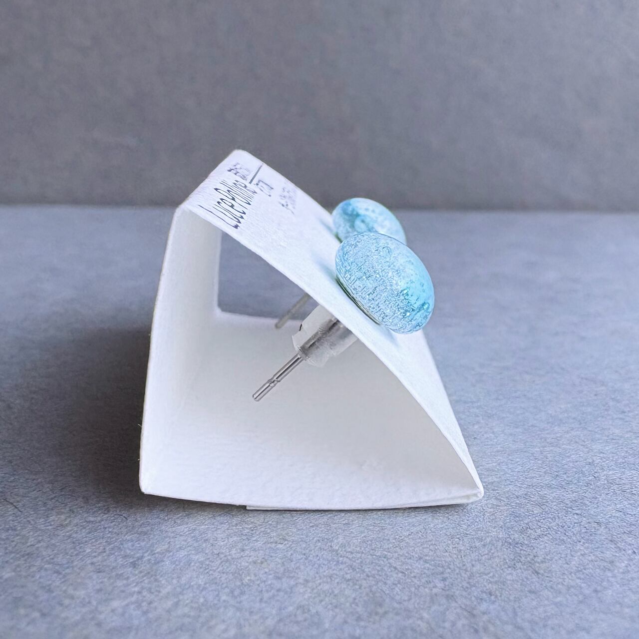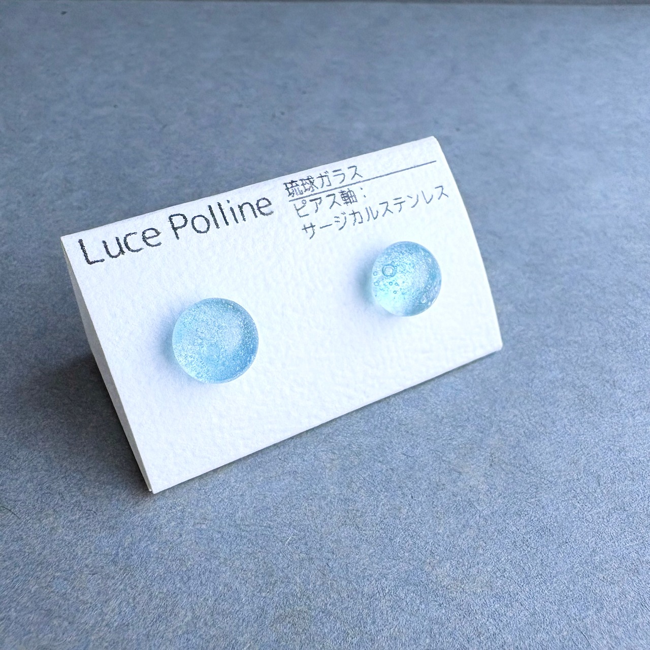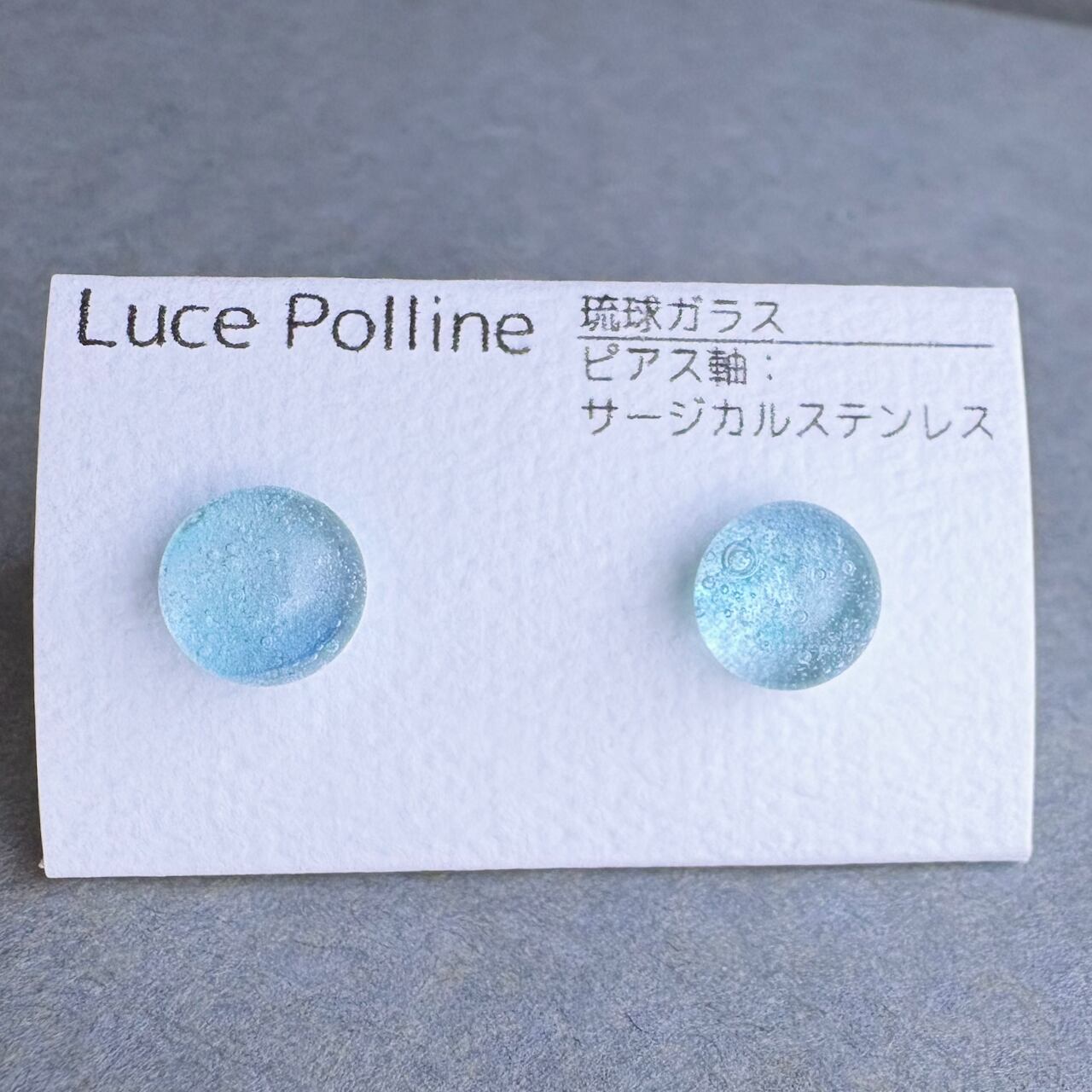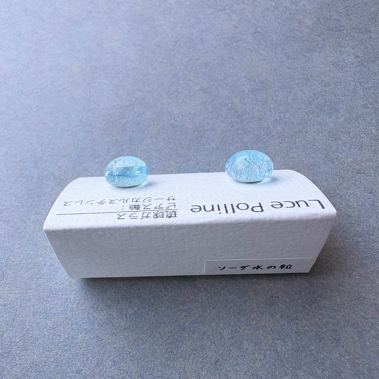 全体的に淡い水色のガラスに気泡をたくさん抱えたガラスの粒のピアスです。