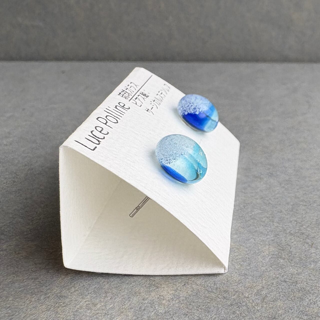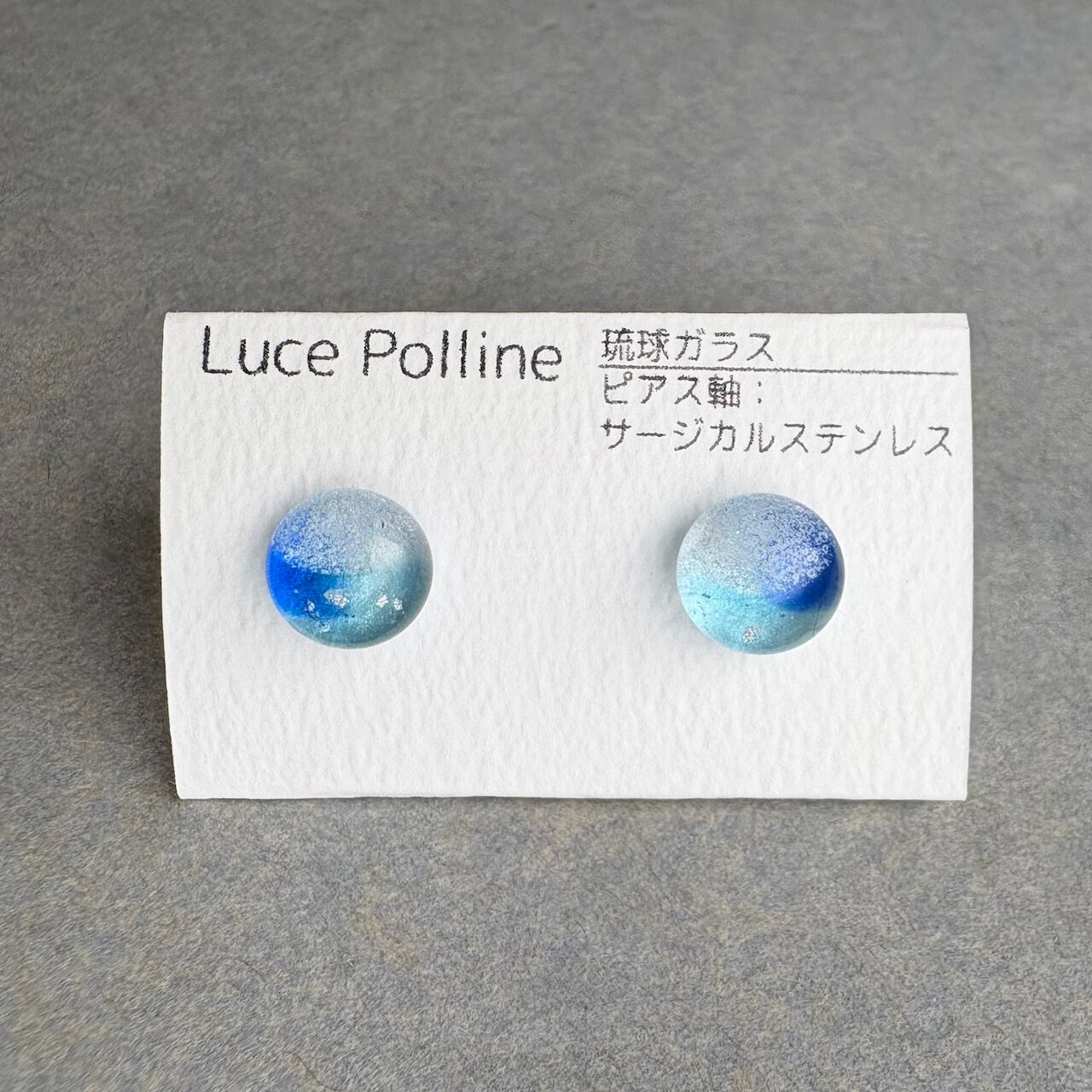 2色のブルーに銀彩が浮かび、涼し気な気泡をまとったガラスの粒です。