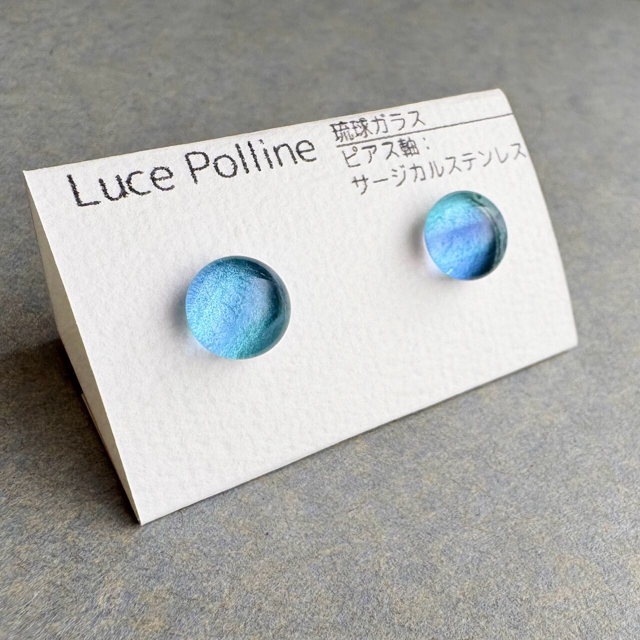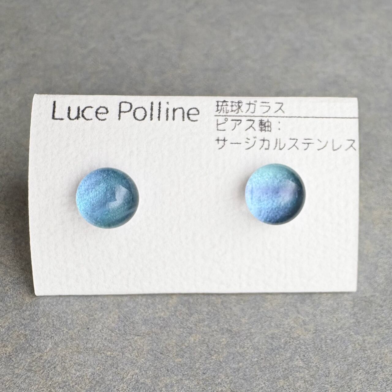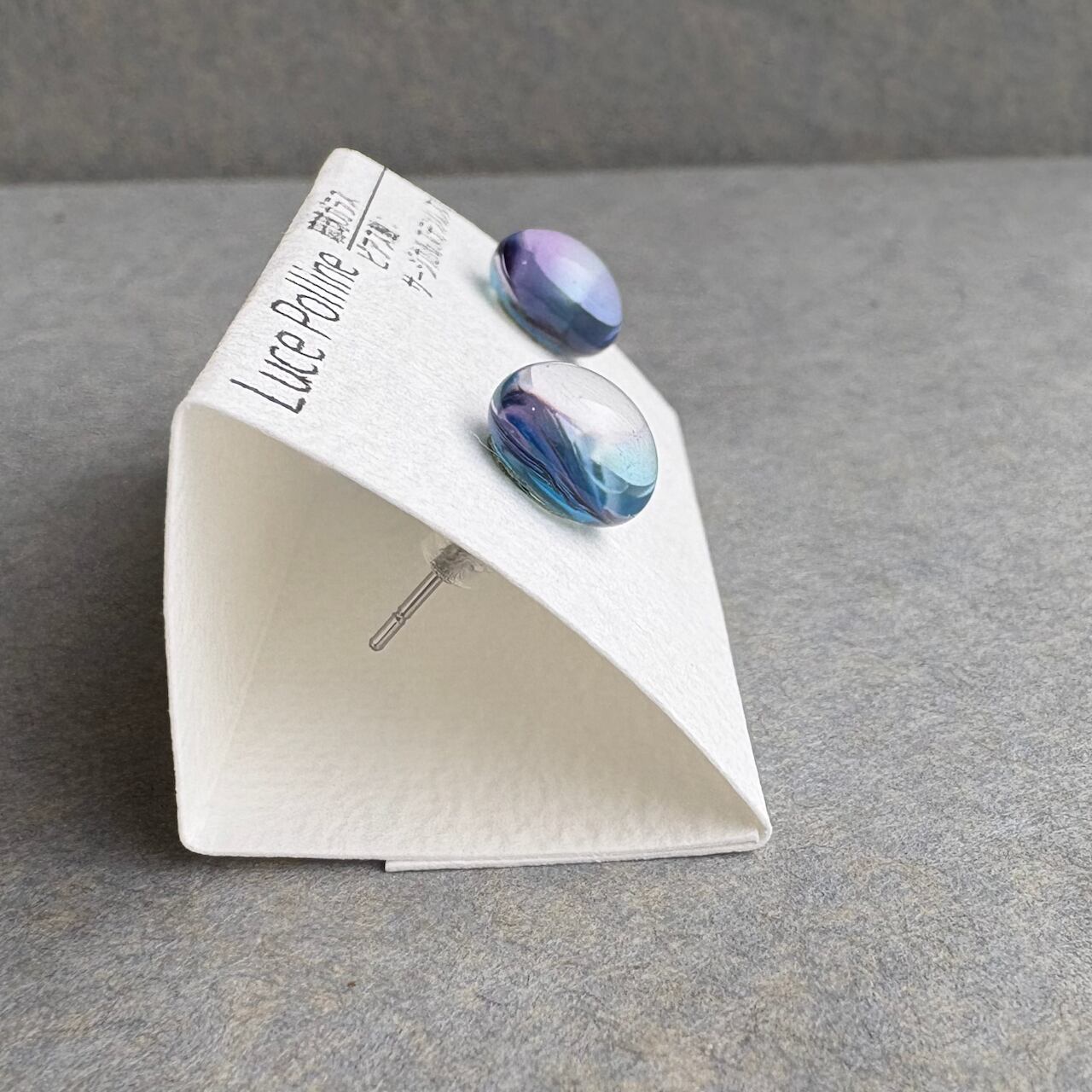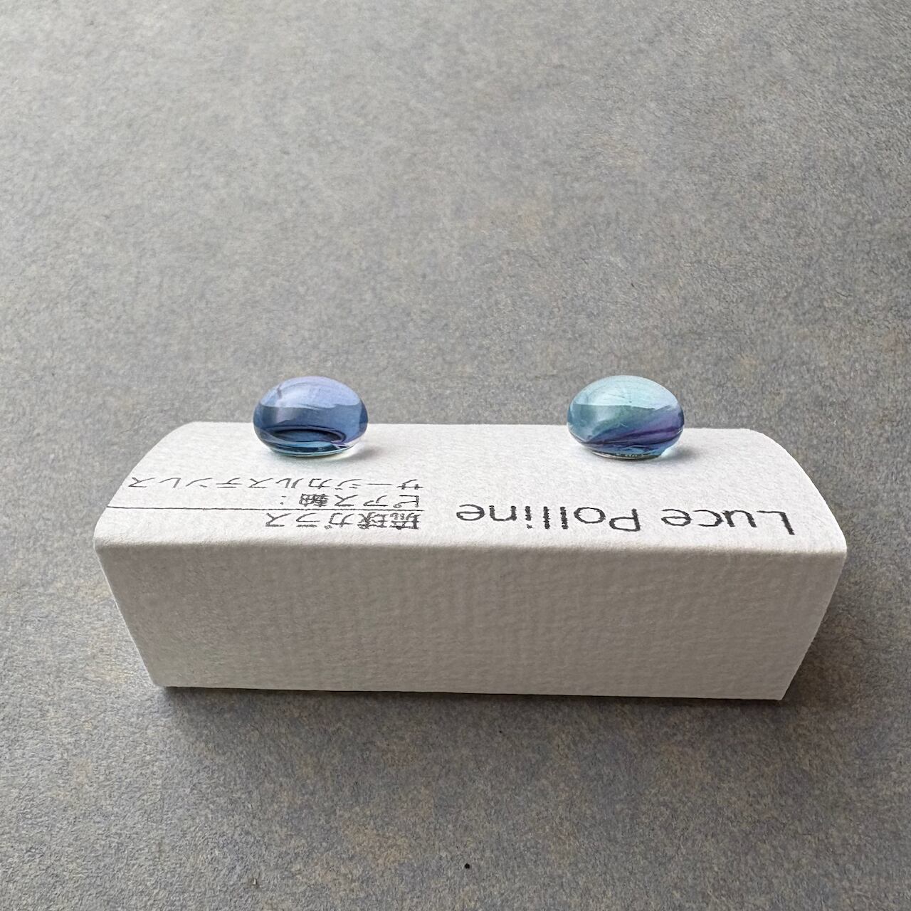 水色のガラスの奥に紫色がうっすらと流れる琉球ガラスの粒です。