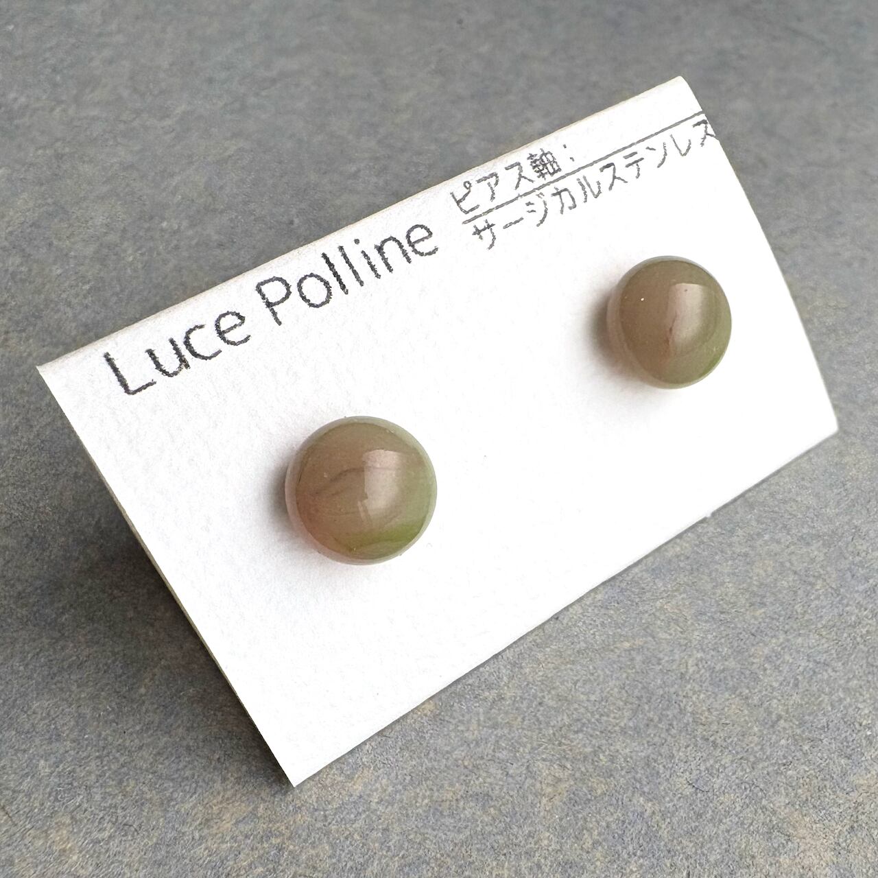 カーキにベージュ、うっすらとピンクが混じるような不思議な色合いのピアスです、