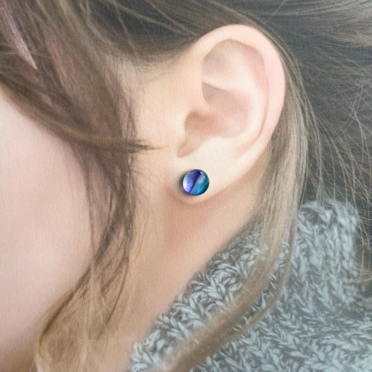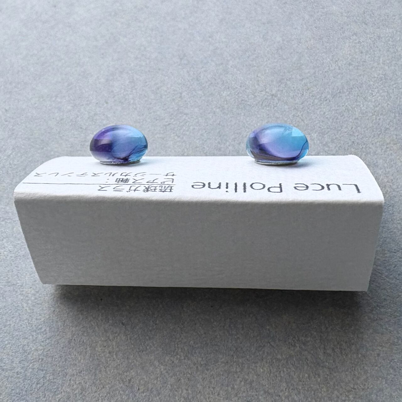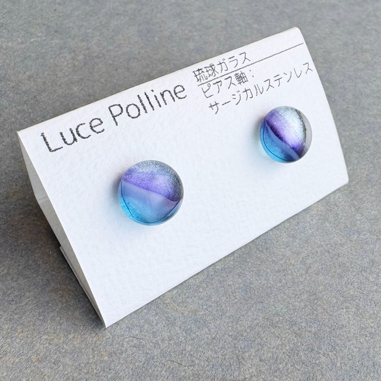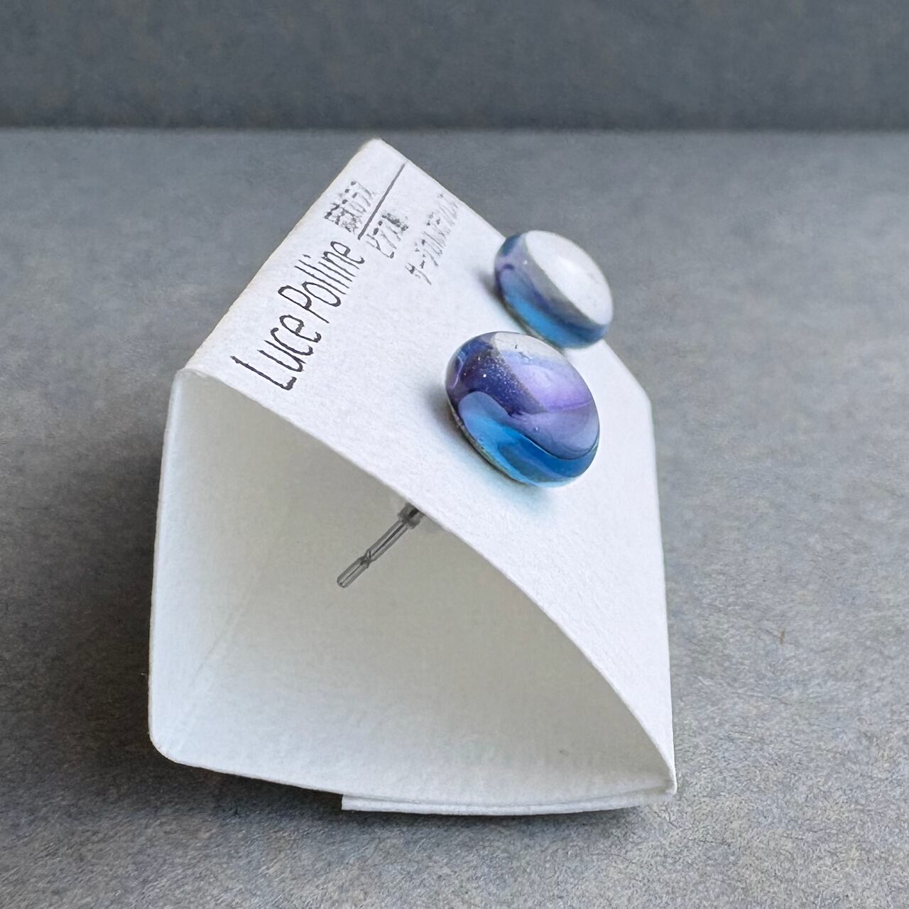 透明なガラスと水色のガラスの間に紫色のラインが揺れる琉球ガラスのピアスです。