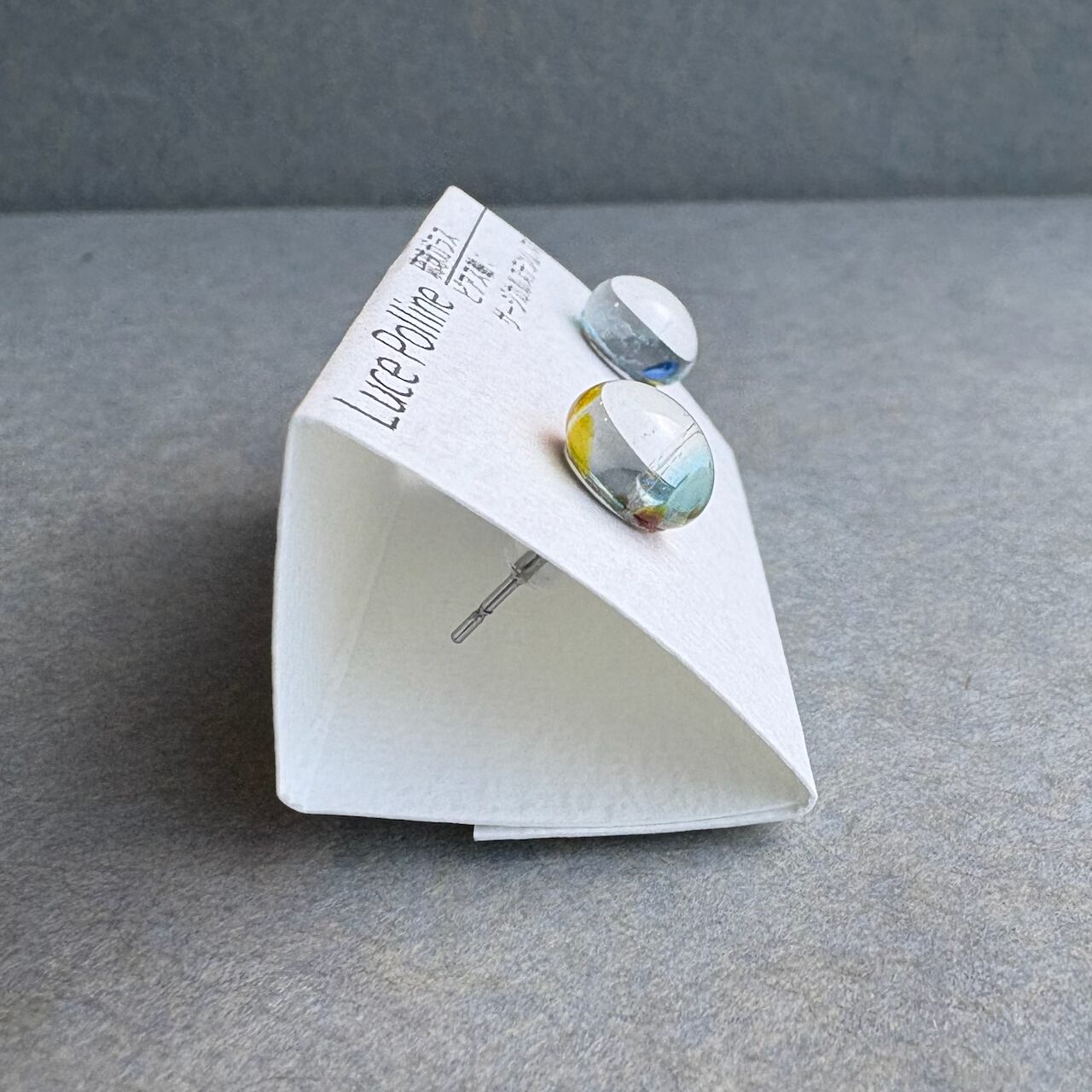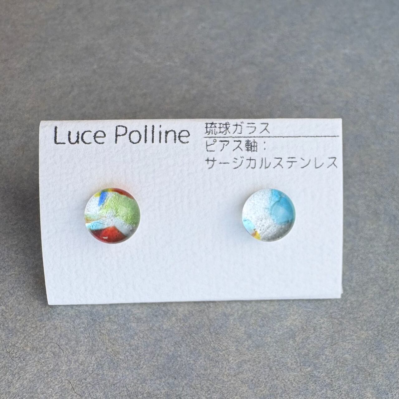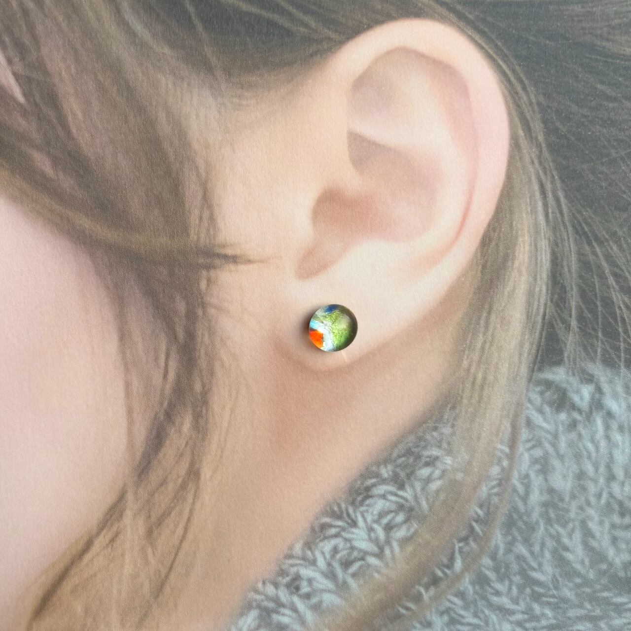 透明なガラスの中に、賑やかな秋の彩りを含んだ琉球ガラスのピアスです。