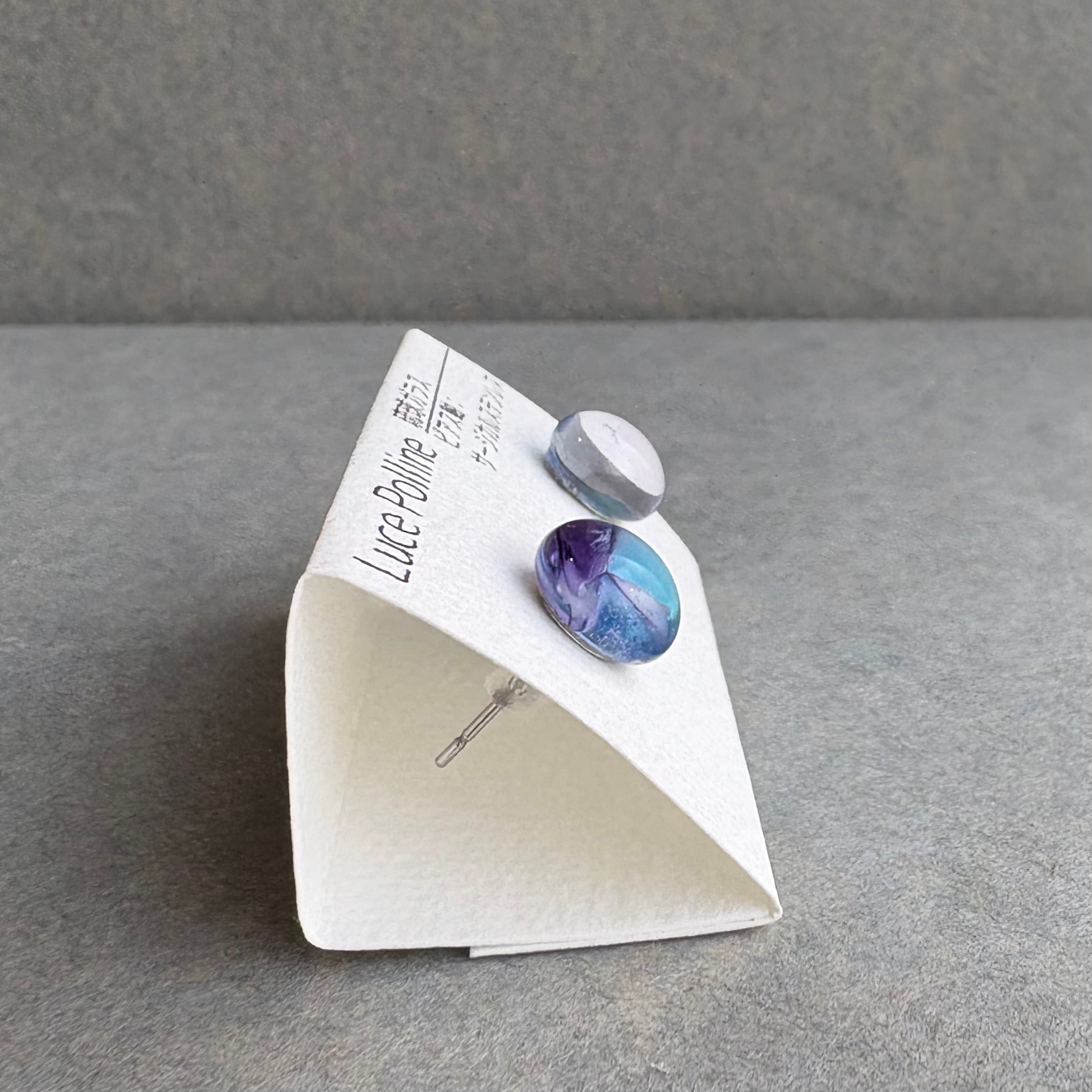アシンメトリーな淡い紫色の琉球ガラスのピアスです。