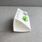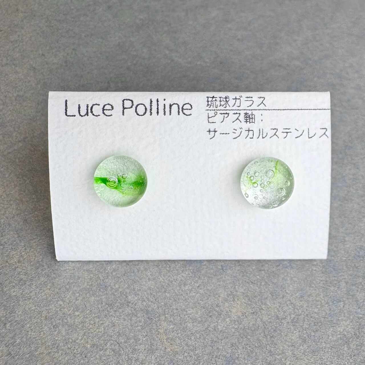透明なガラスを主体に、緑色と気泡を含んで、肌寒い秋の朝、草の葉の縁を纏う水滴のような琉球ガラスの粒です。