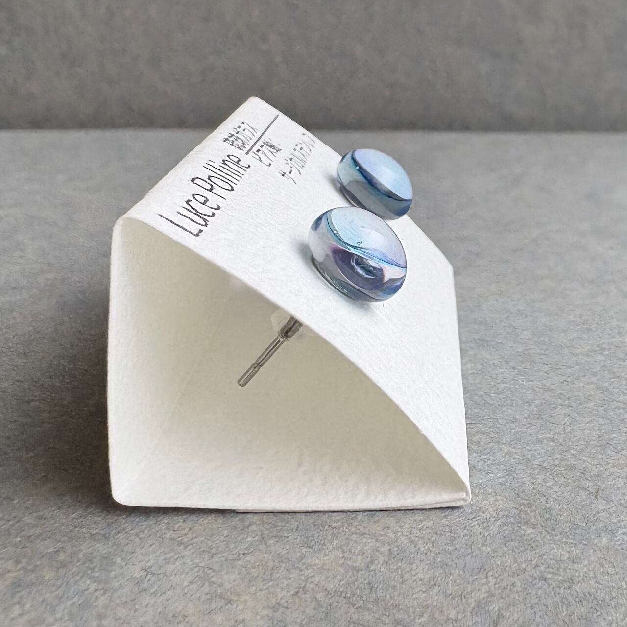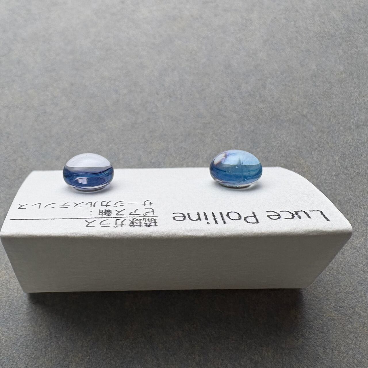 透明感たっぷりな淡い水色と淡い紫が重なるガラスの粒です。