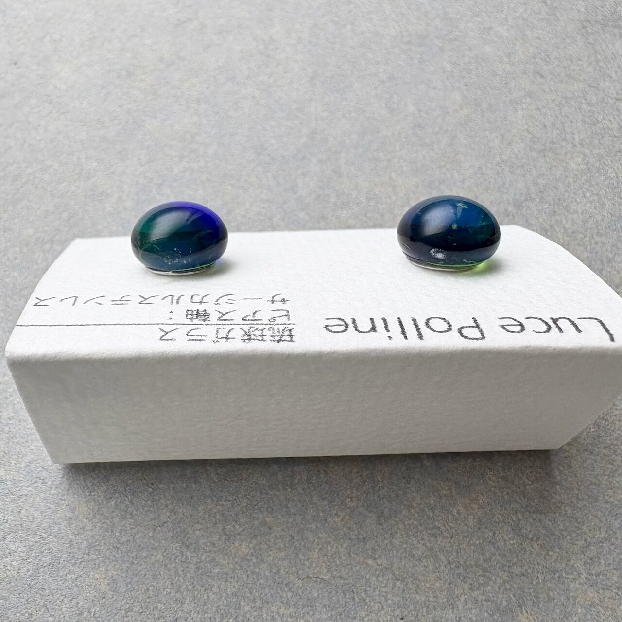透明感のある緑色のガラスと、藍色のガラスが折り重なるガラスの粒です。