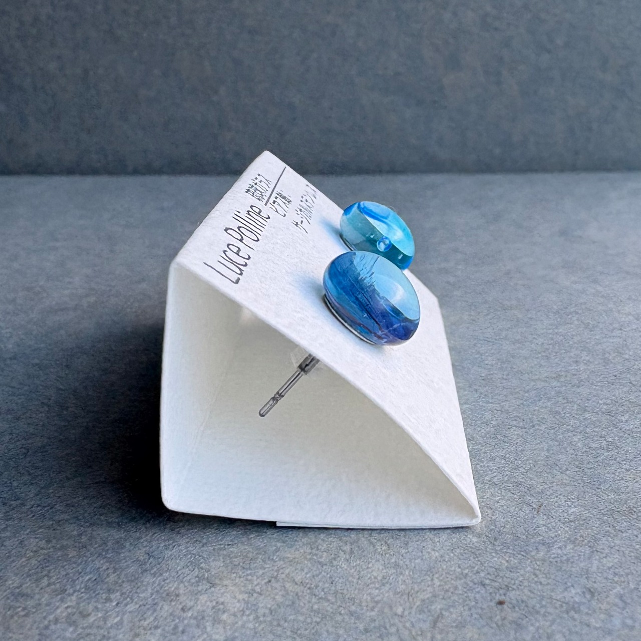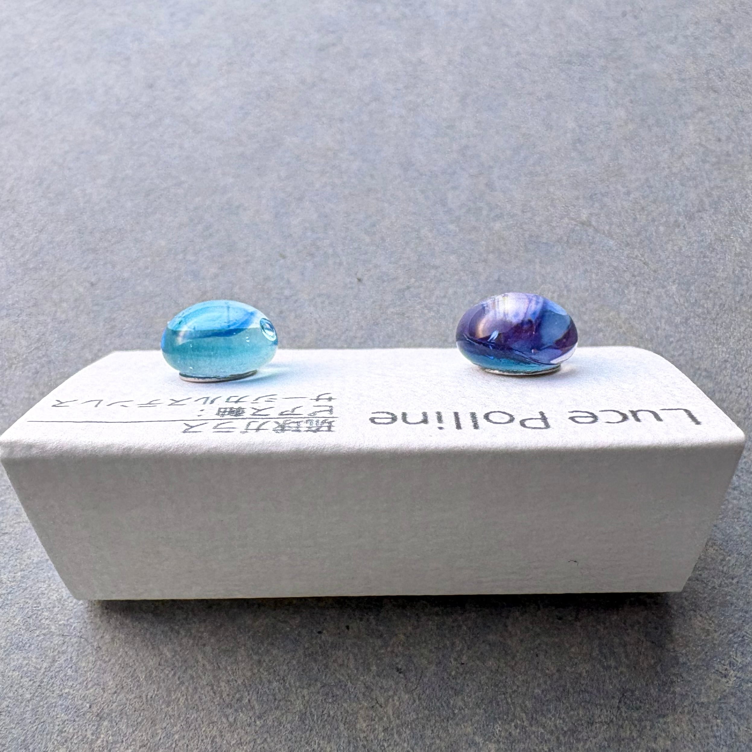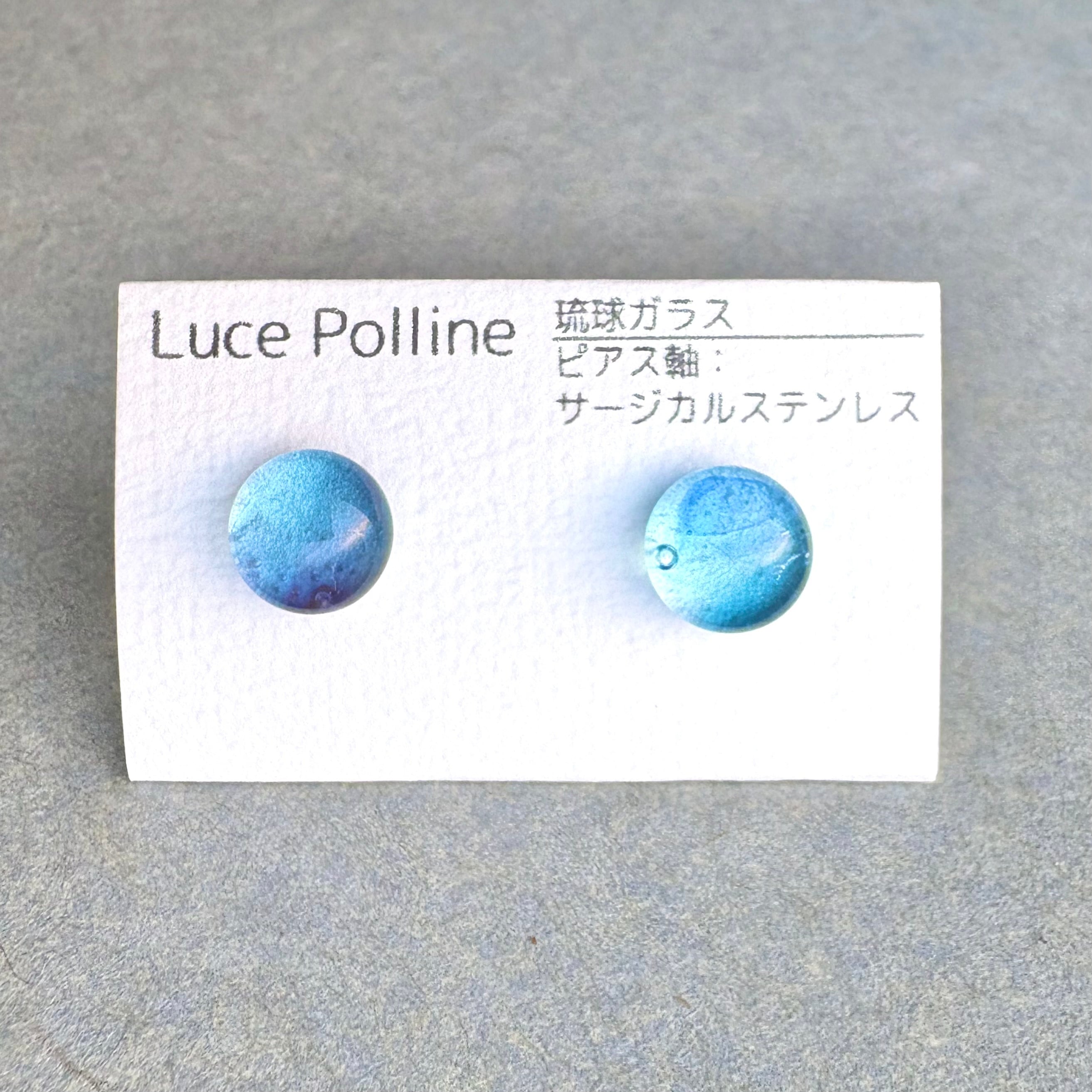 淡い水色にほんのすこし紫色が影を落とした琉球ガラスのピアスです。