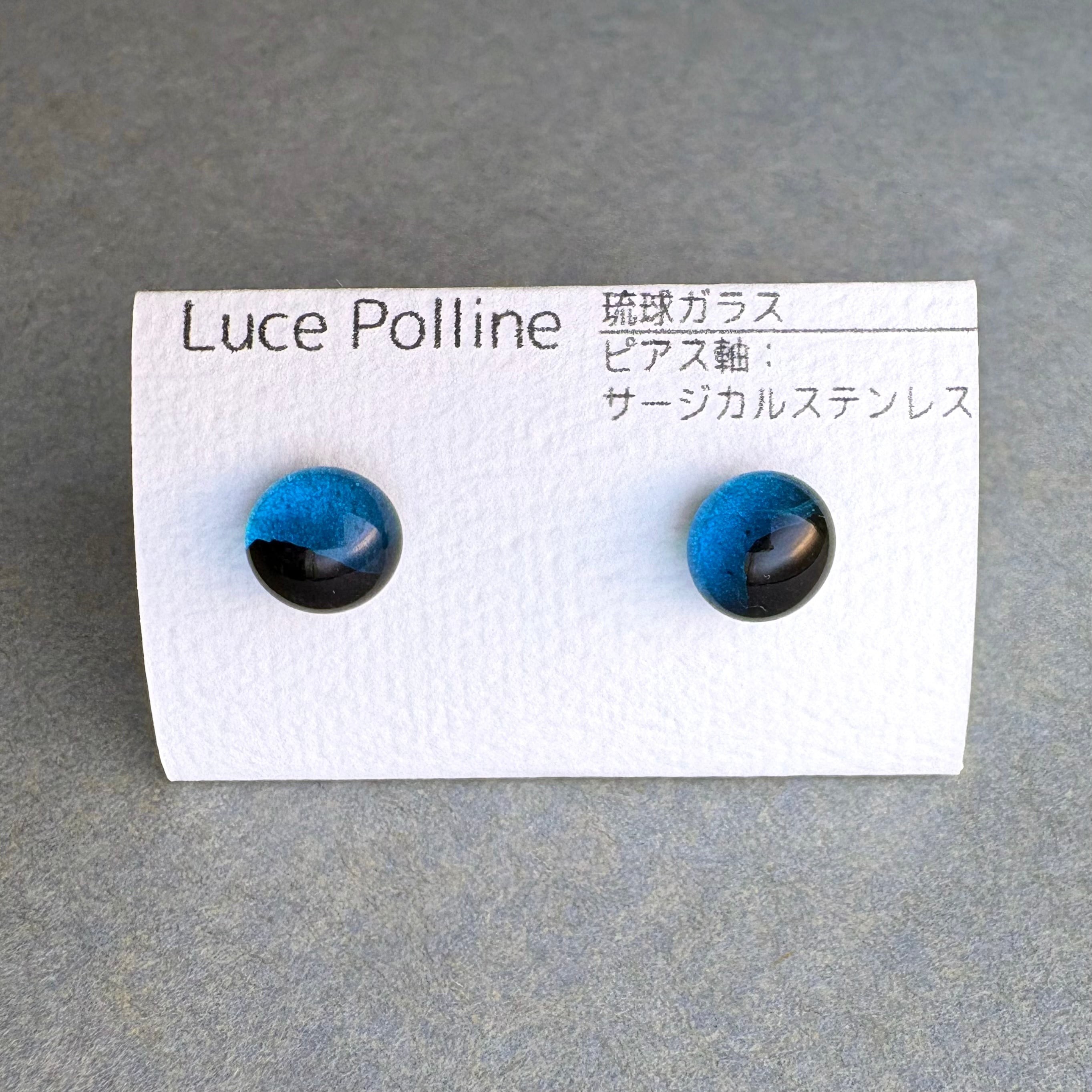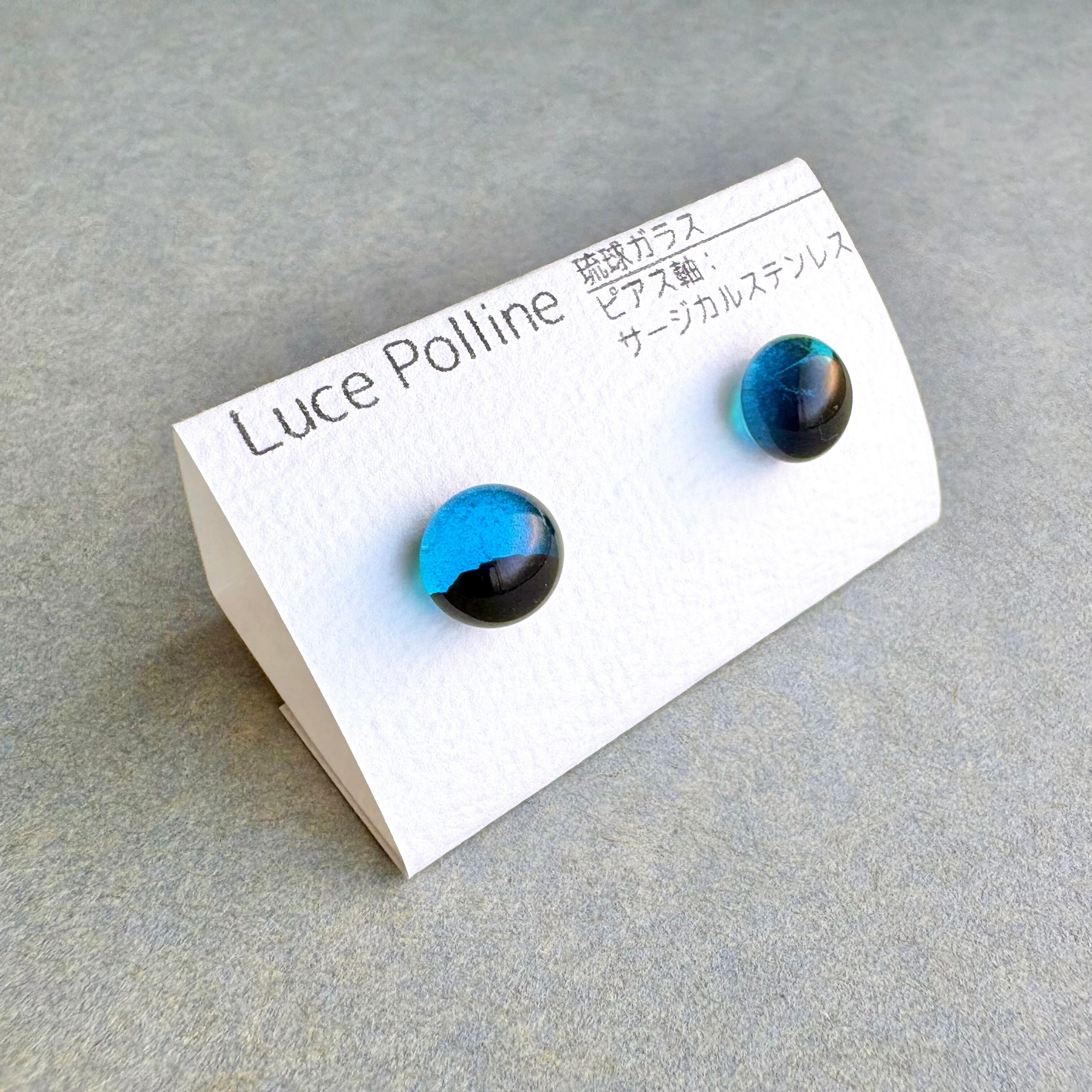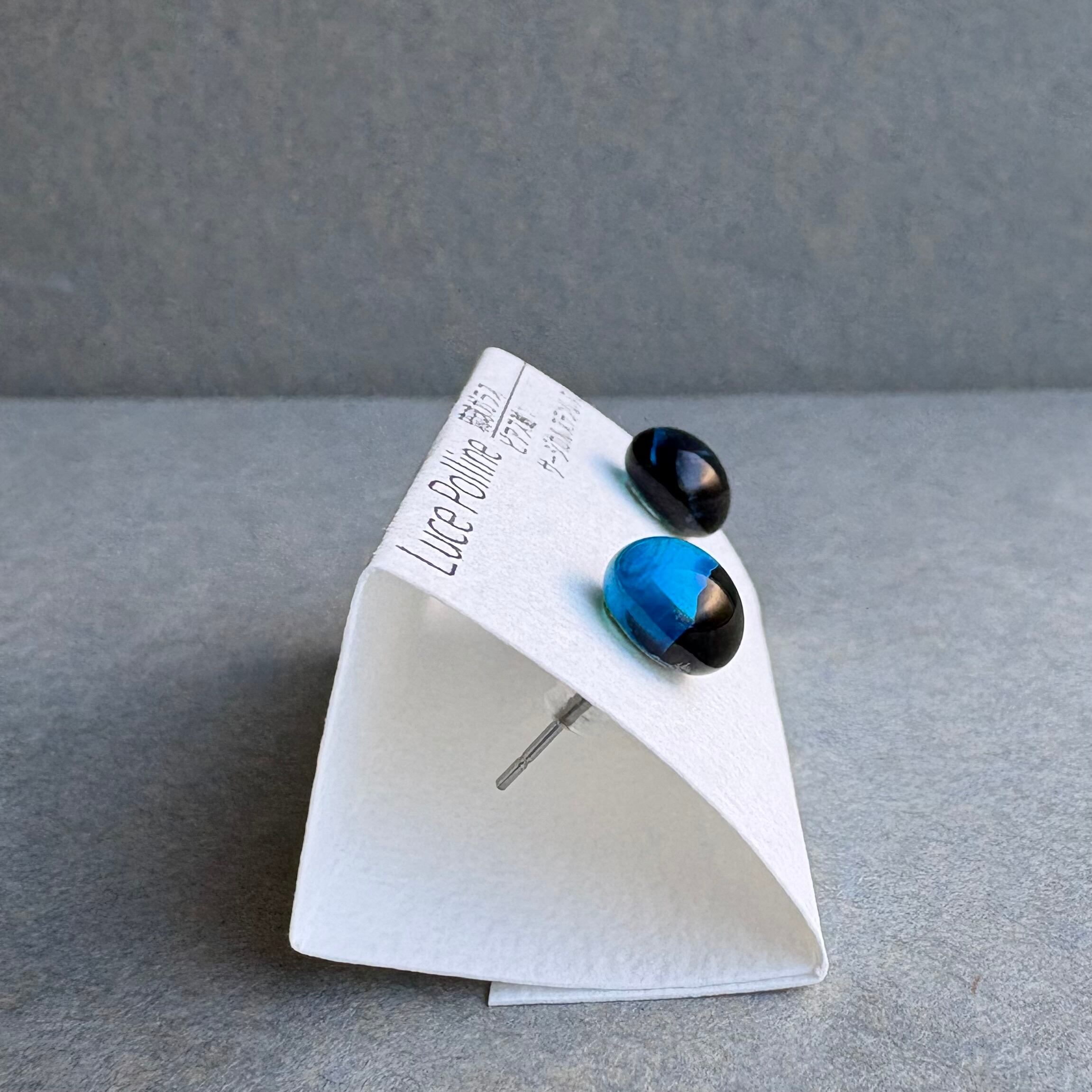透明な濃い青と不透明な黒のツートンカラーの琉球ガラスのピアスです。