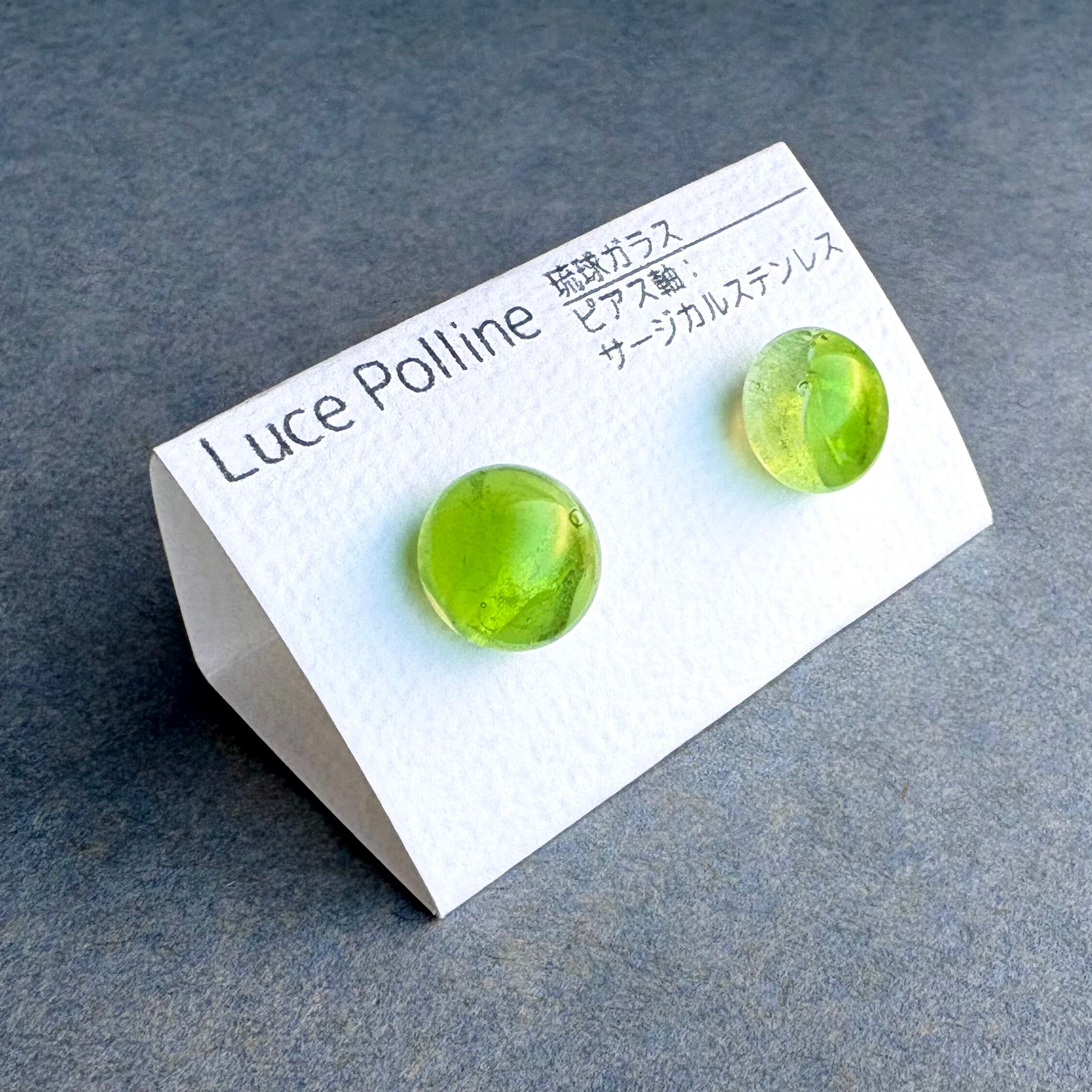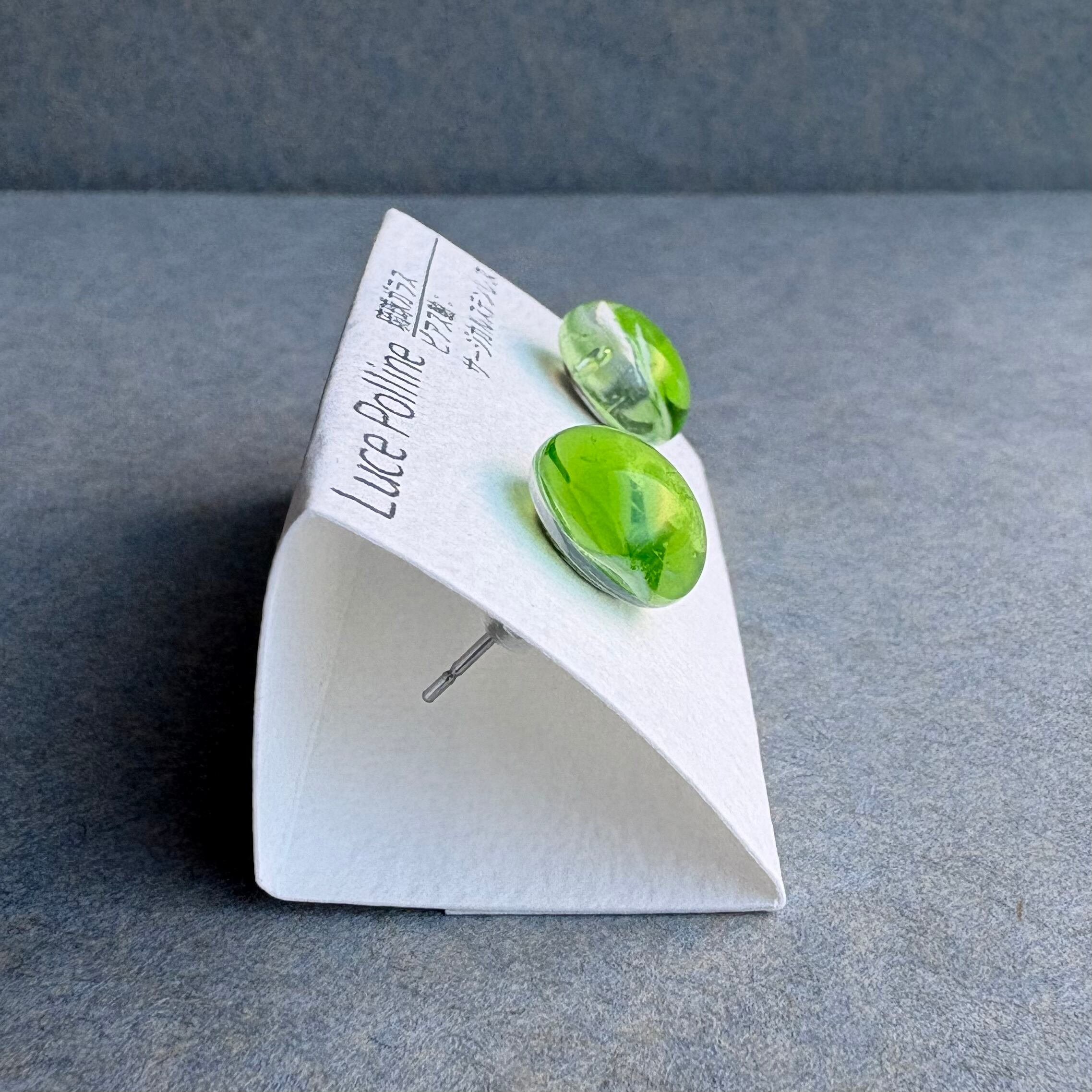 透明なガラスの中に沈む黄緑色が浅瀬のサンゴ礁を思わせる琉球ガラスのピアスです。