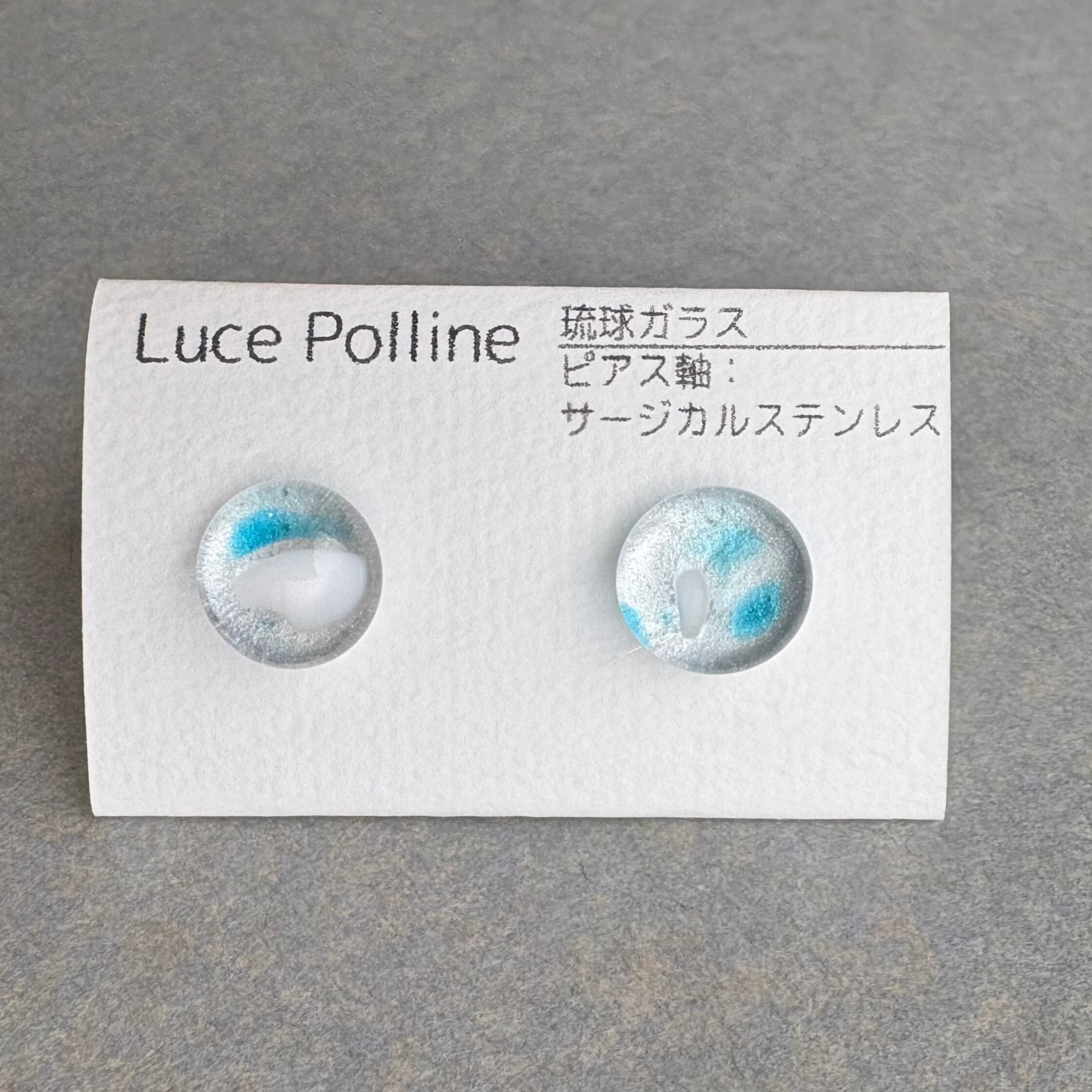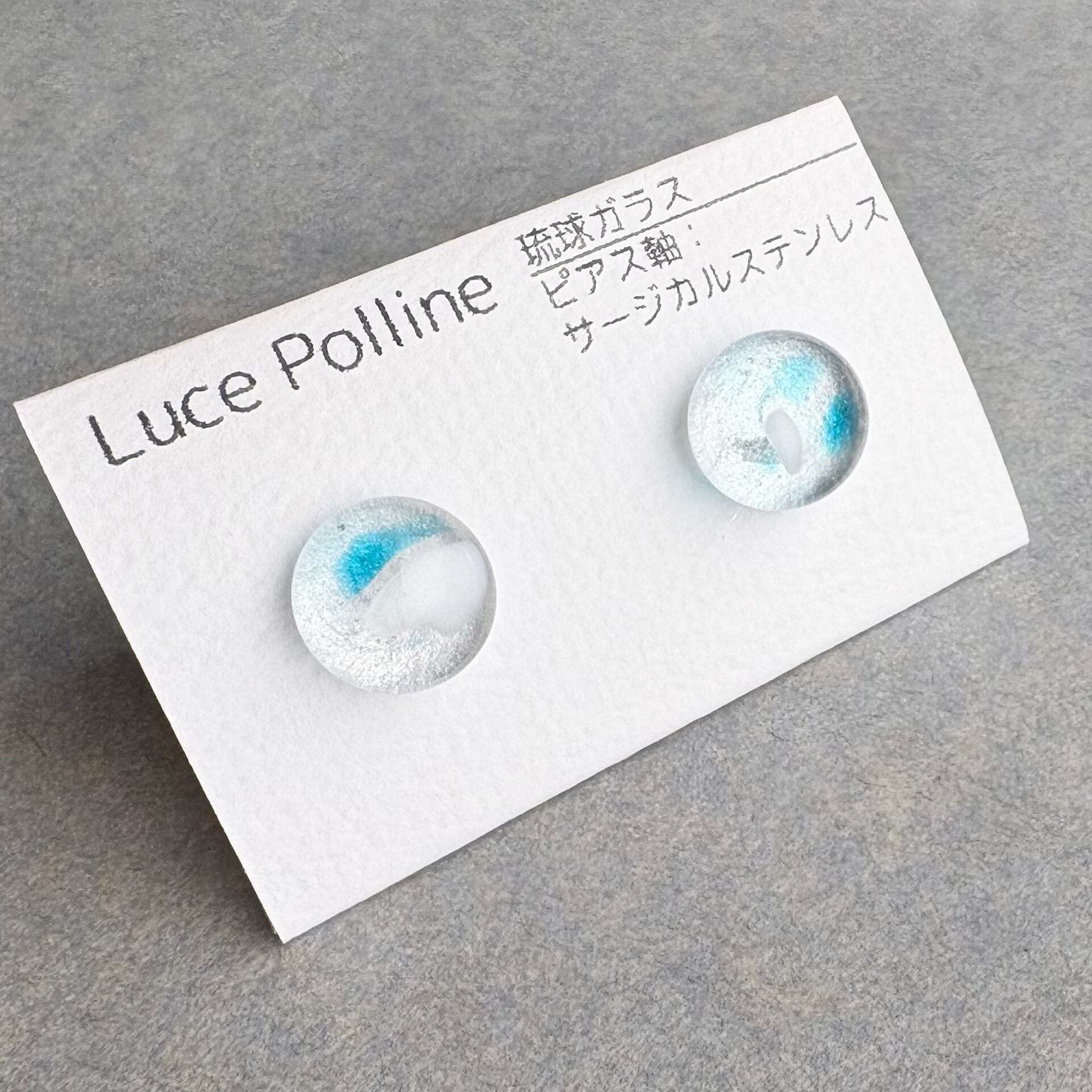 透明なガラスに青と白の模様がある琉球ガラスの粒です。