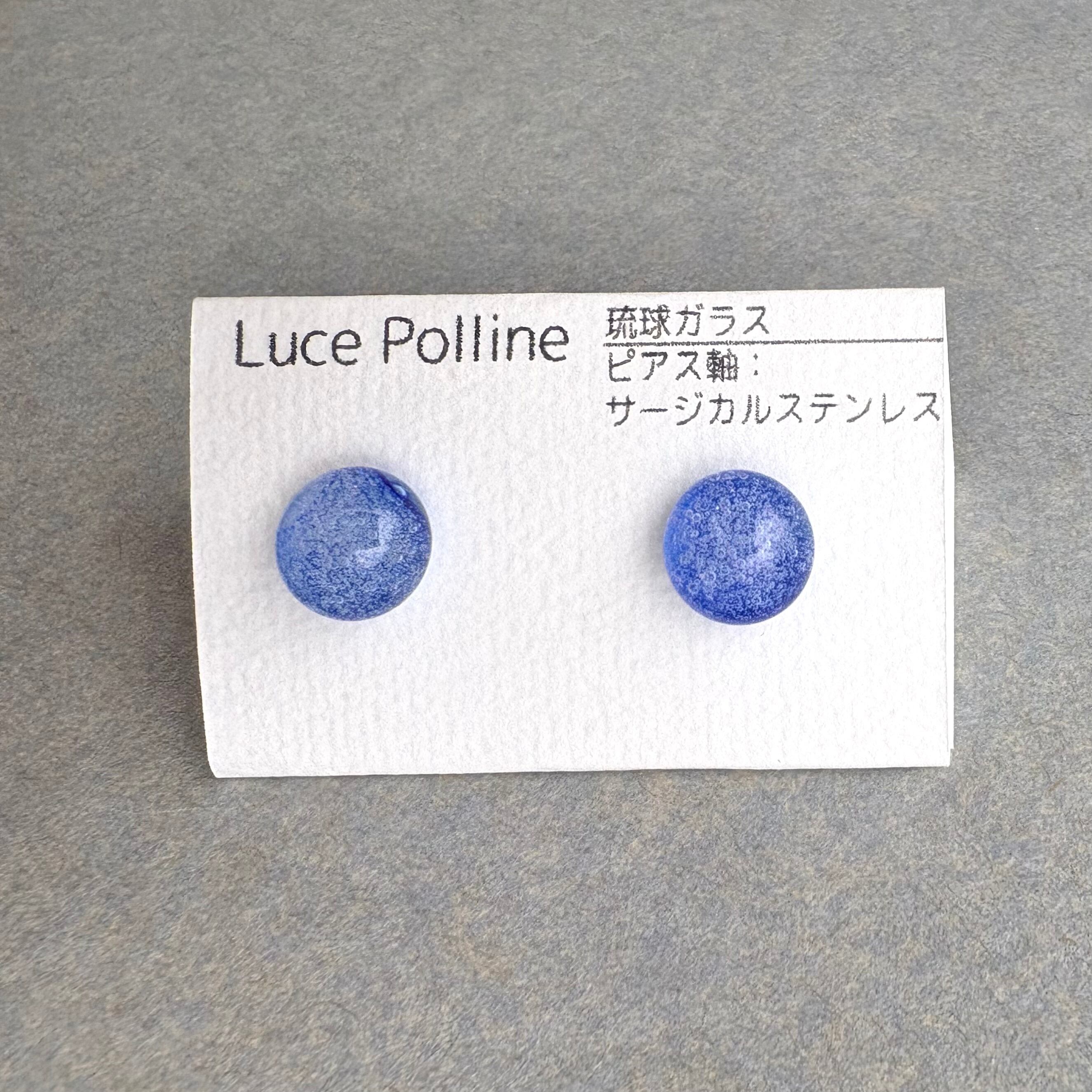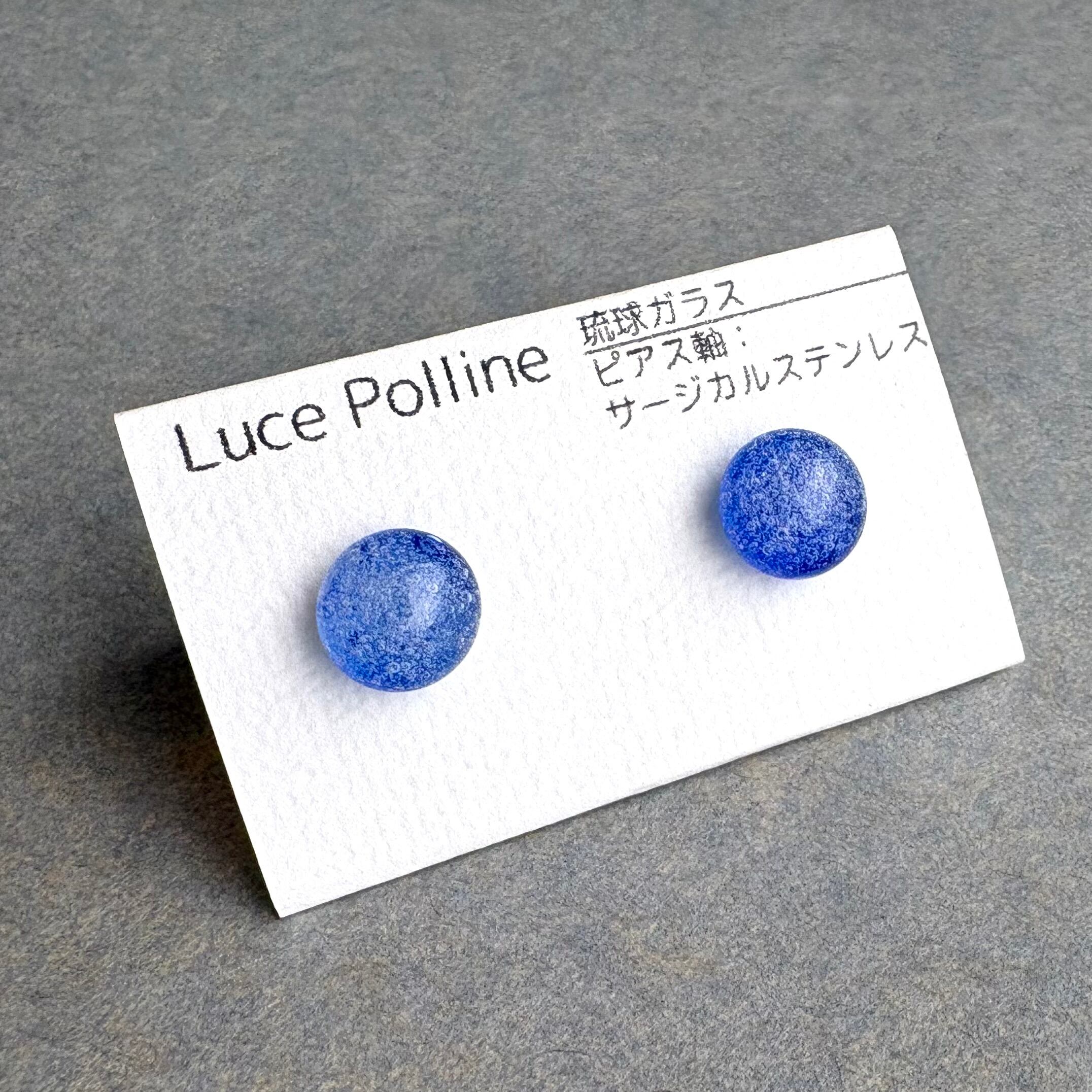 濃い青のガラスにたっぷりと気泡を盛った琉球ガラスのピアスです。
