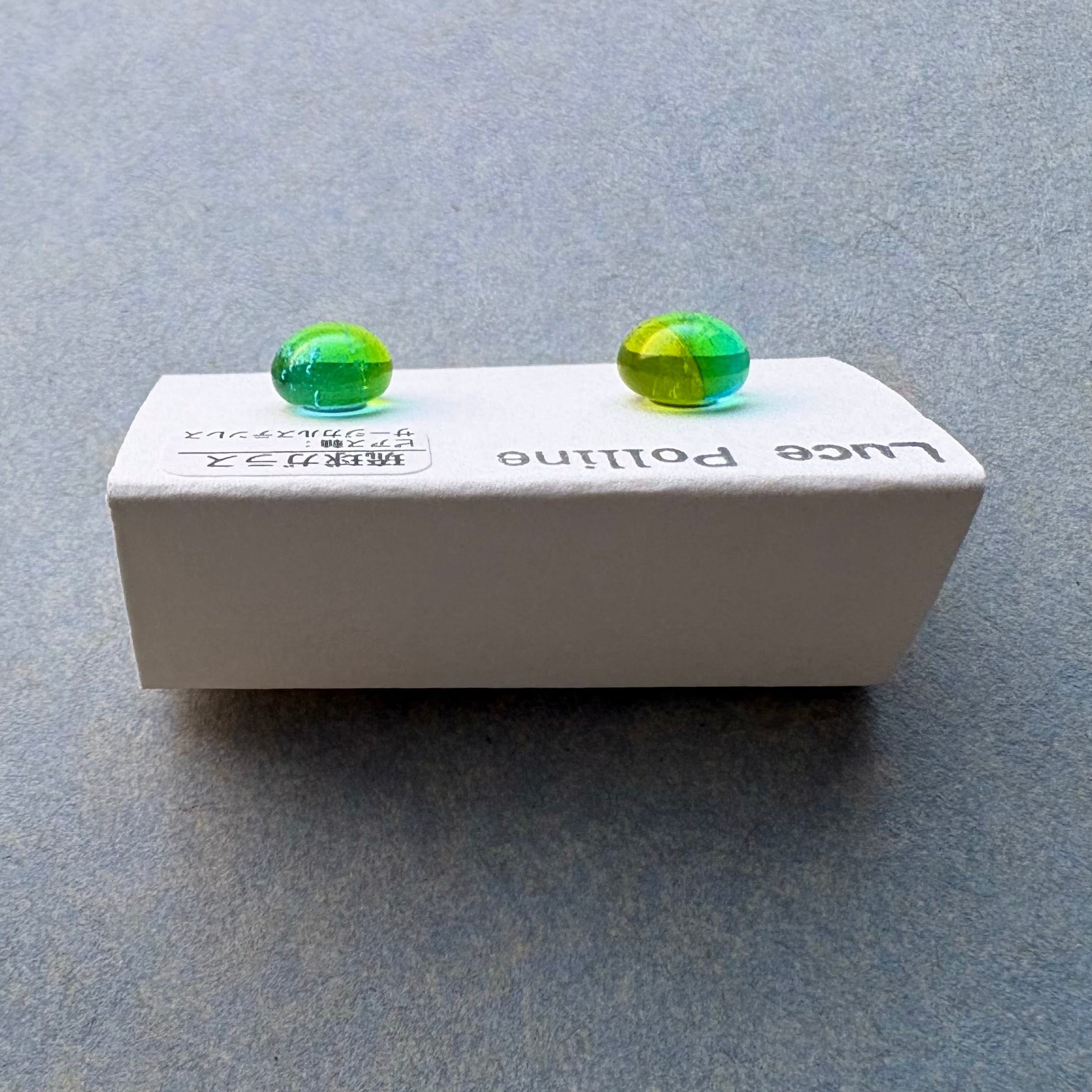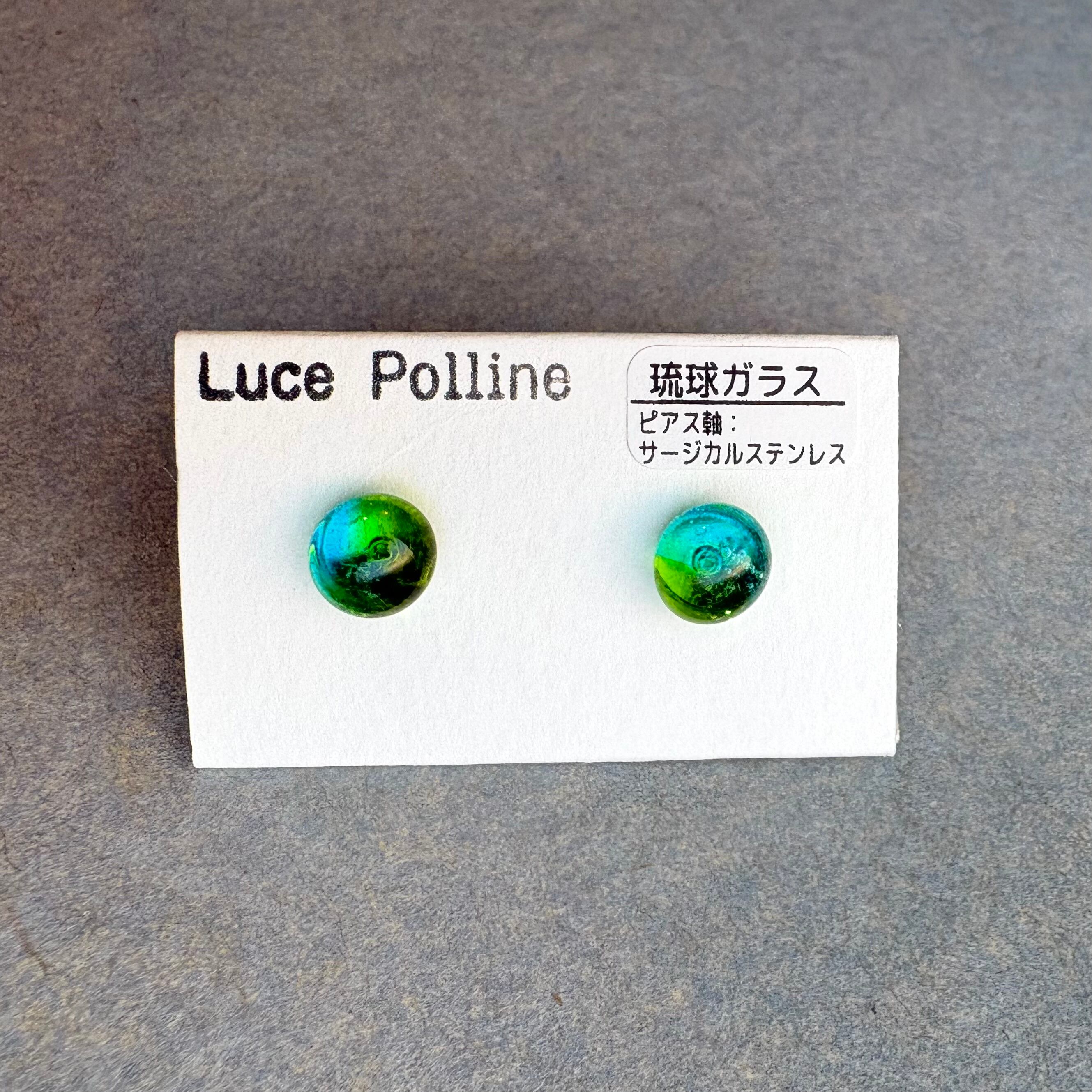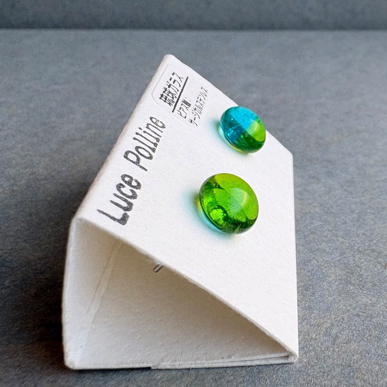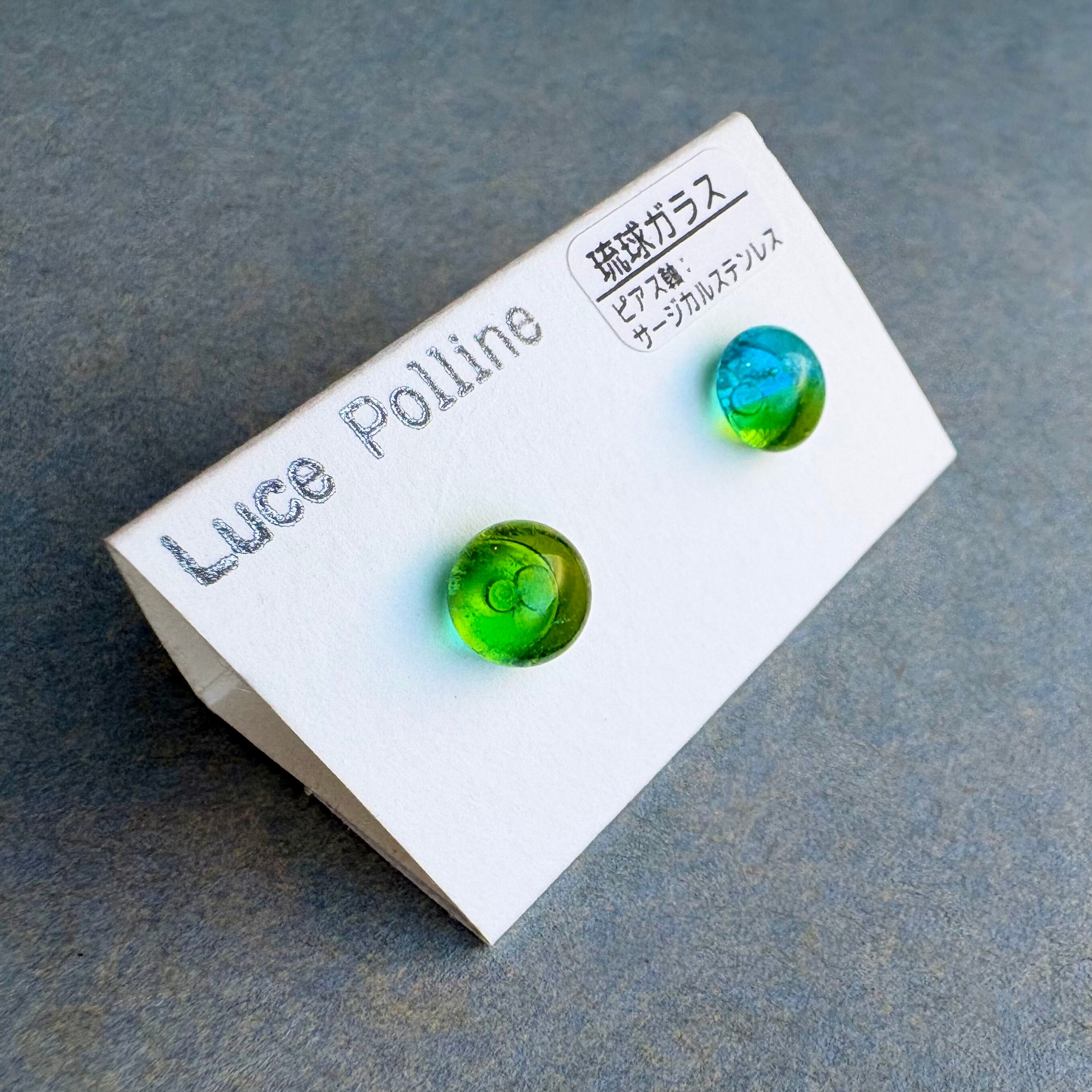 透明な青と緑が混じり合い、見る方向で色味の変わる琉球ガラスの粒です。