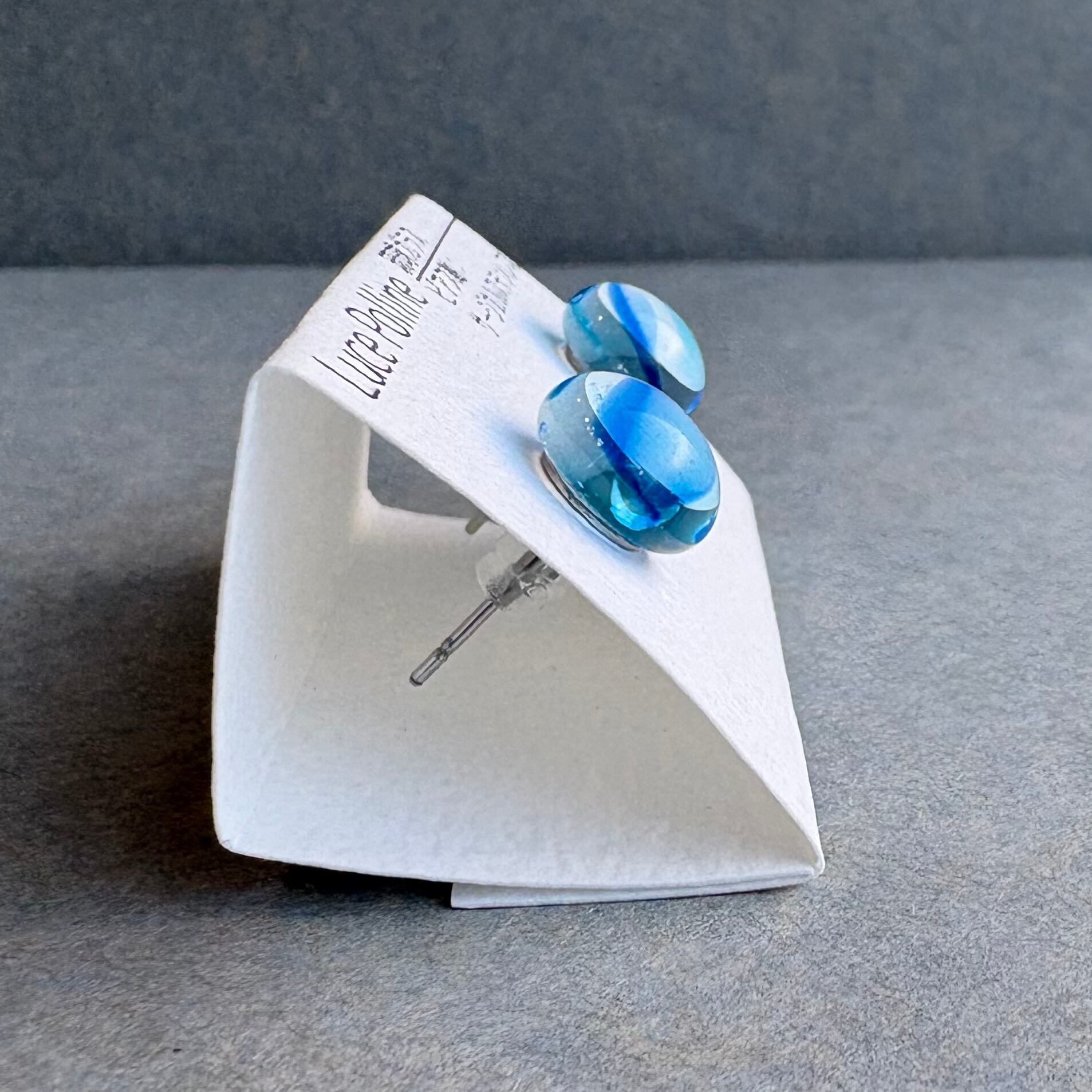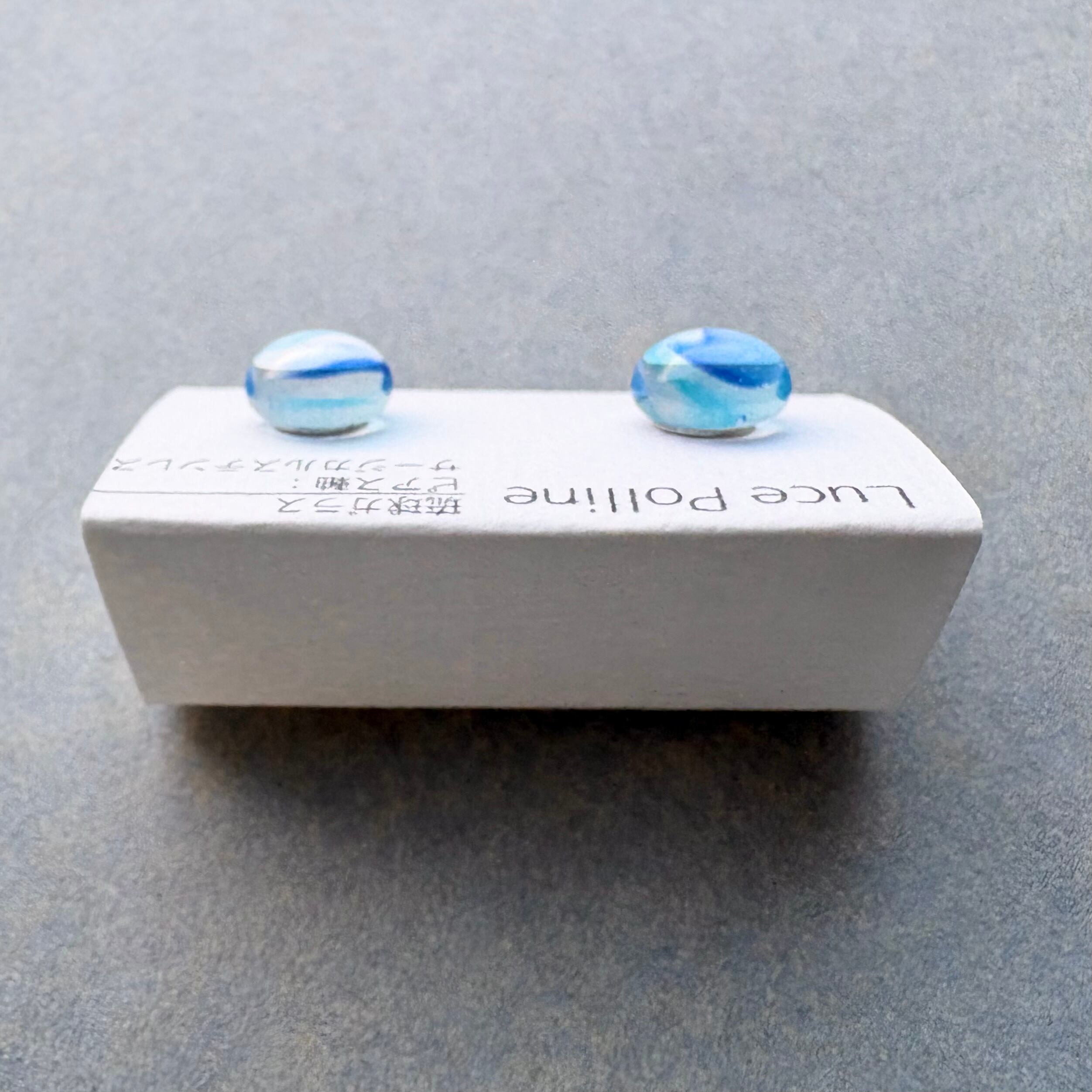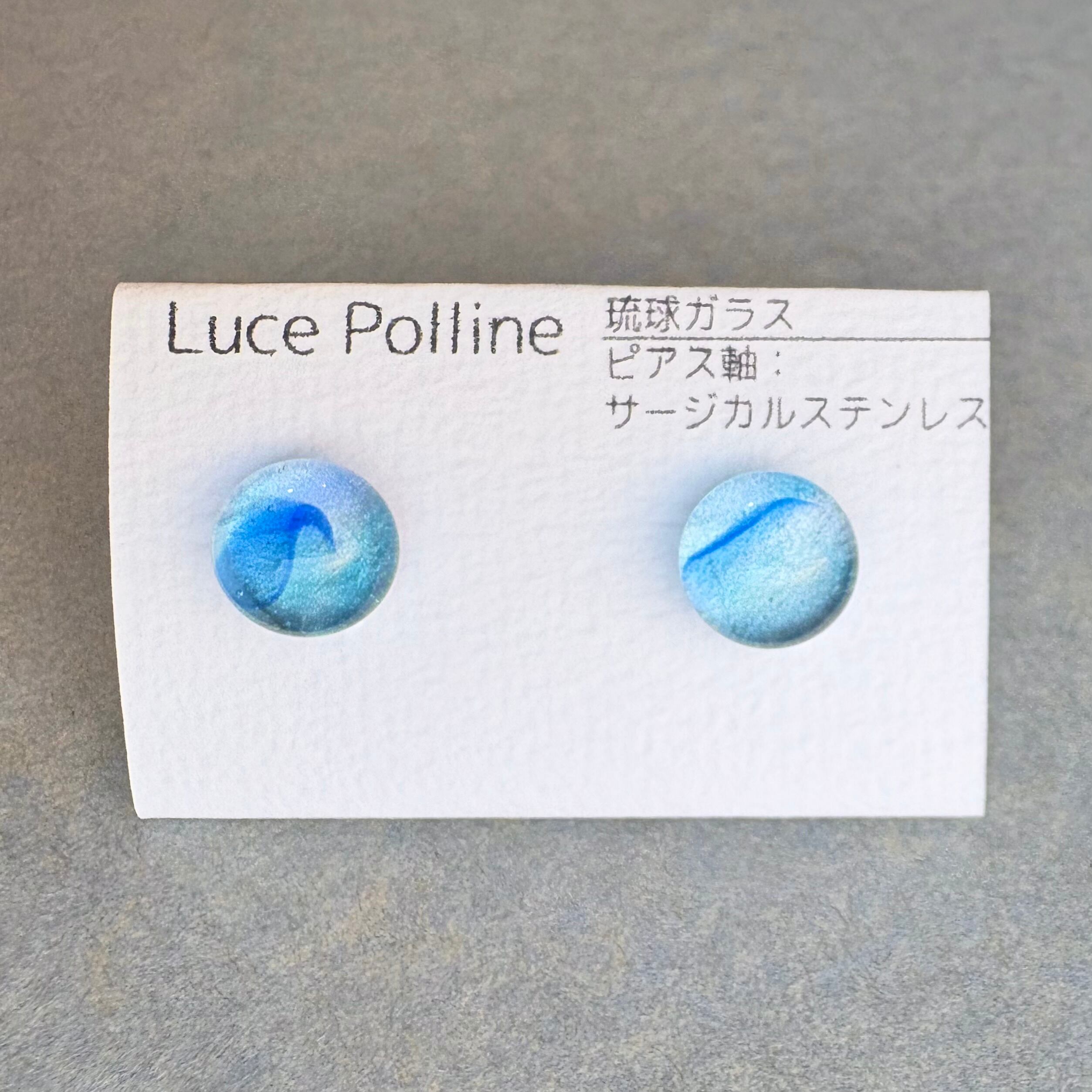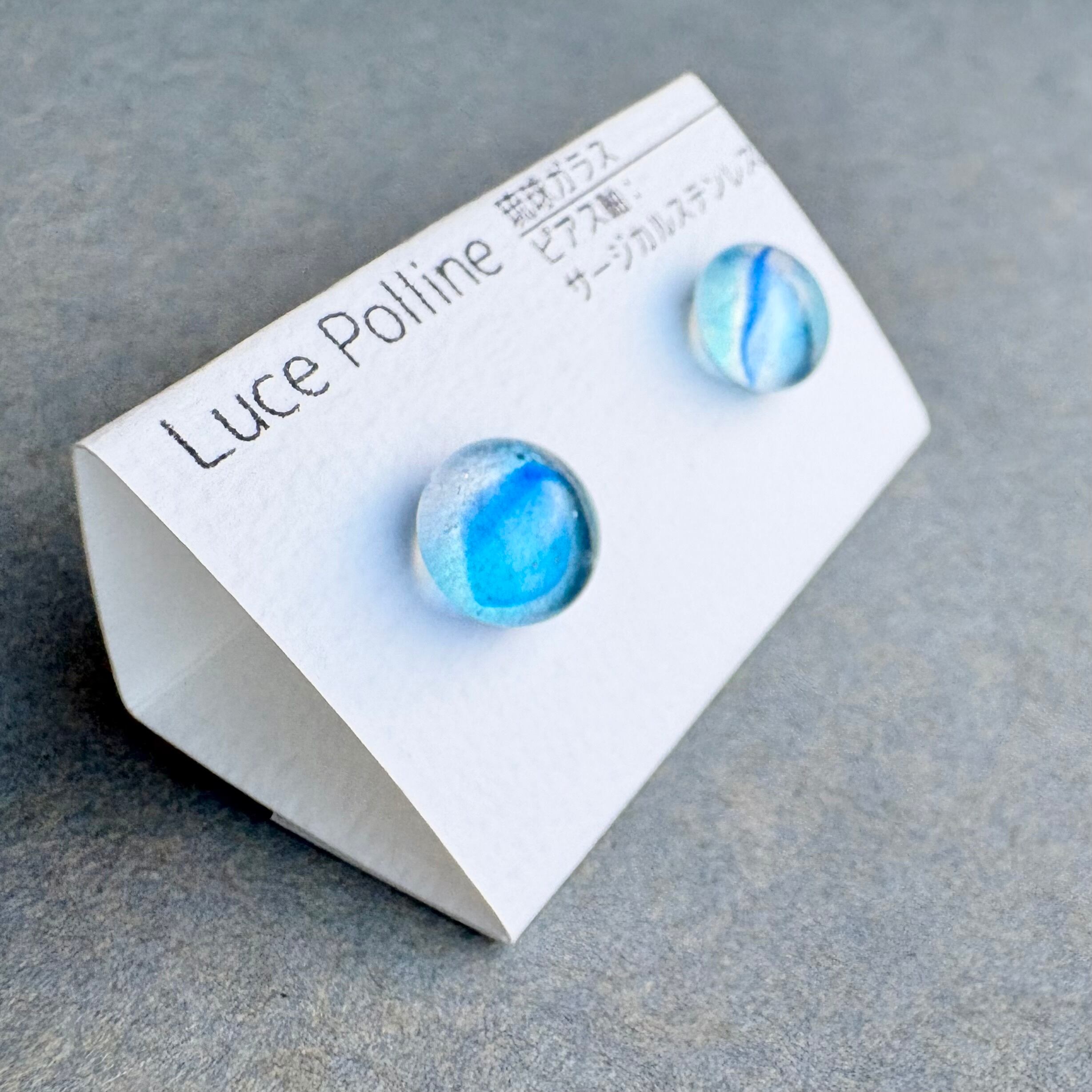 透明な水色のガラスに舞うように青が流れる琉球ガラスの粒です。