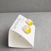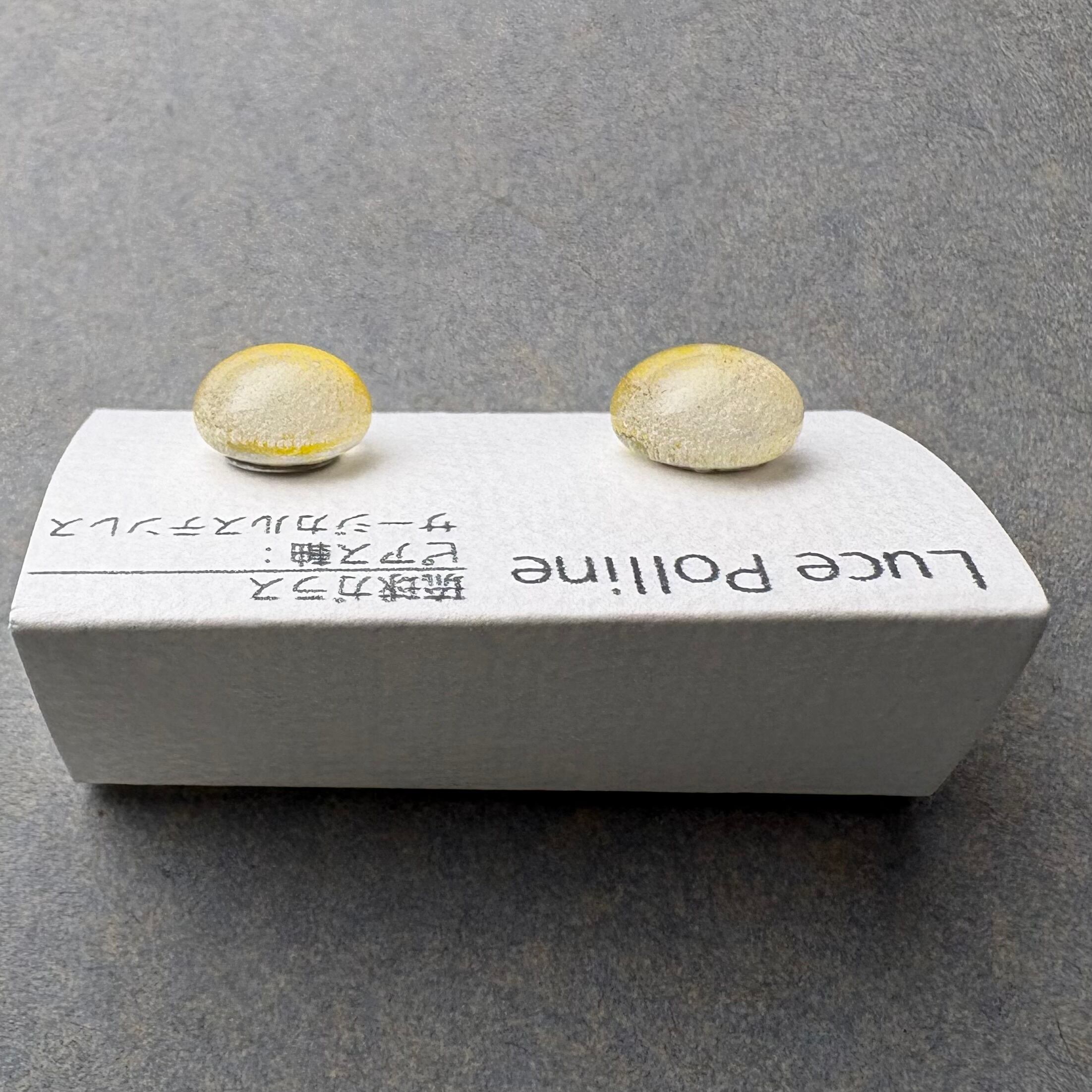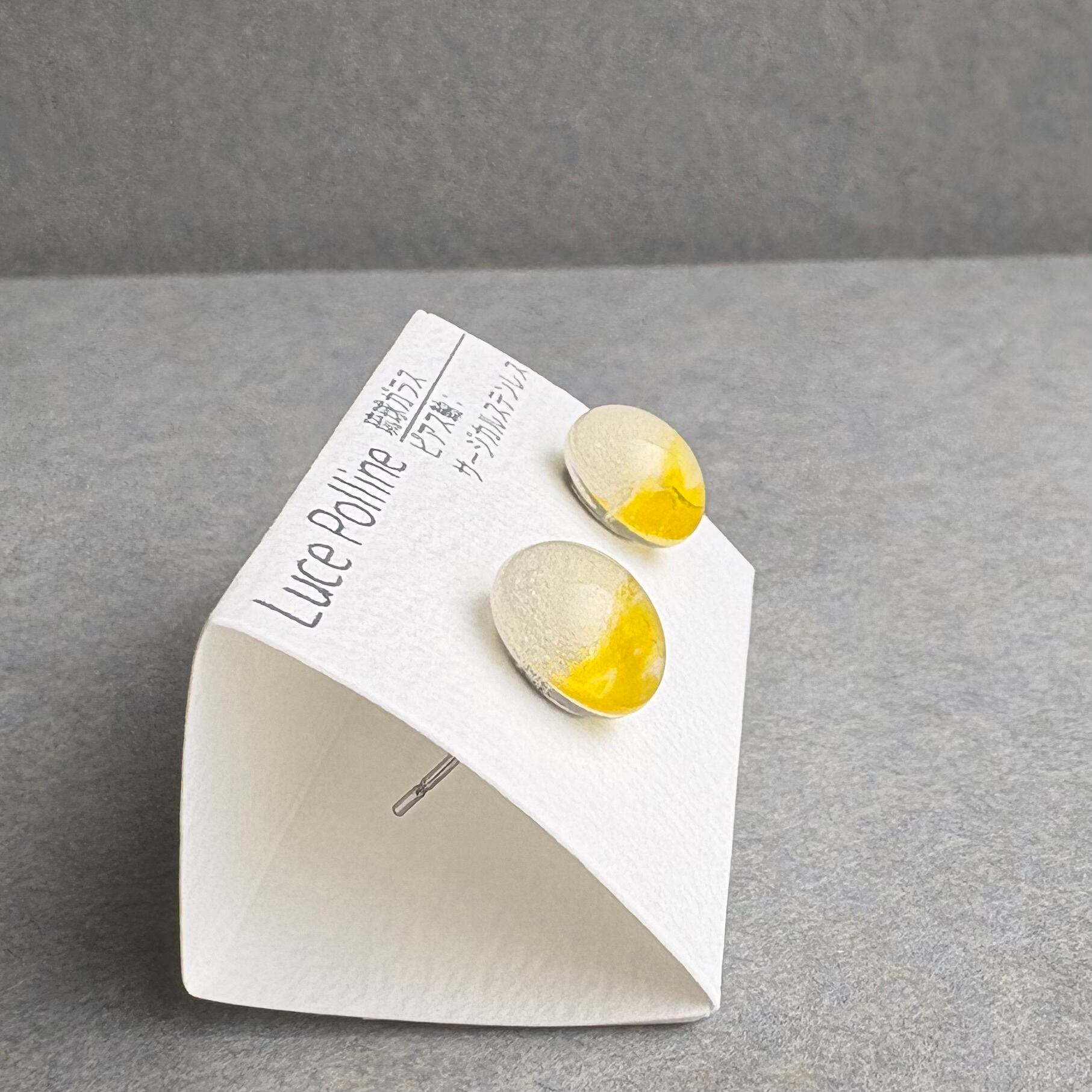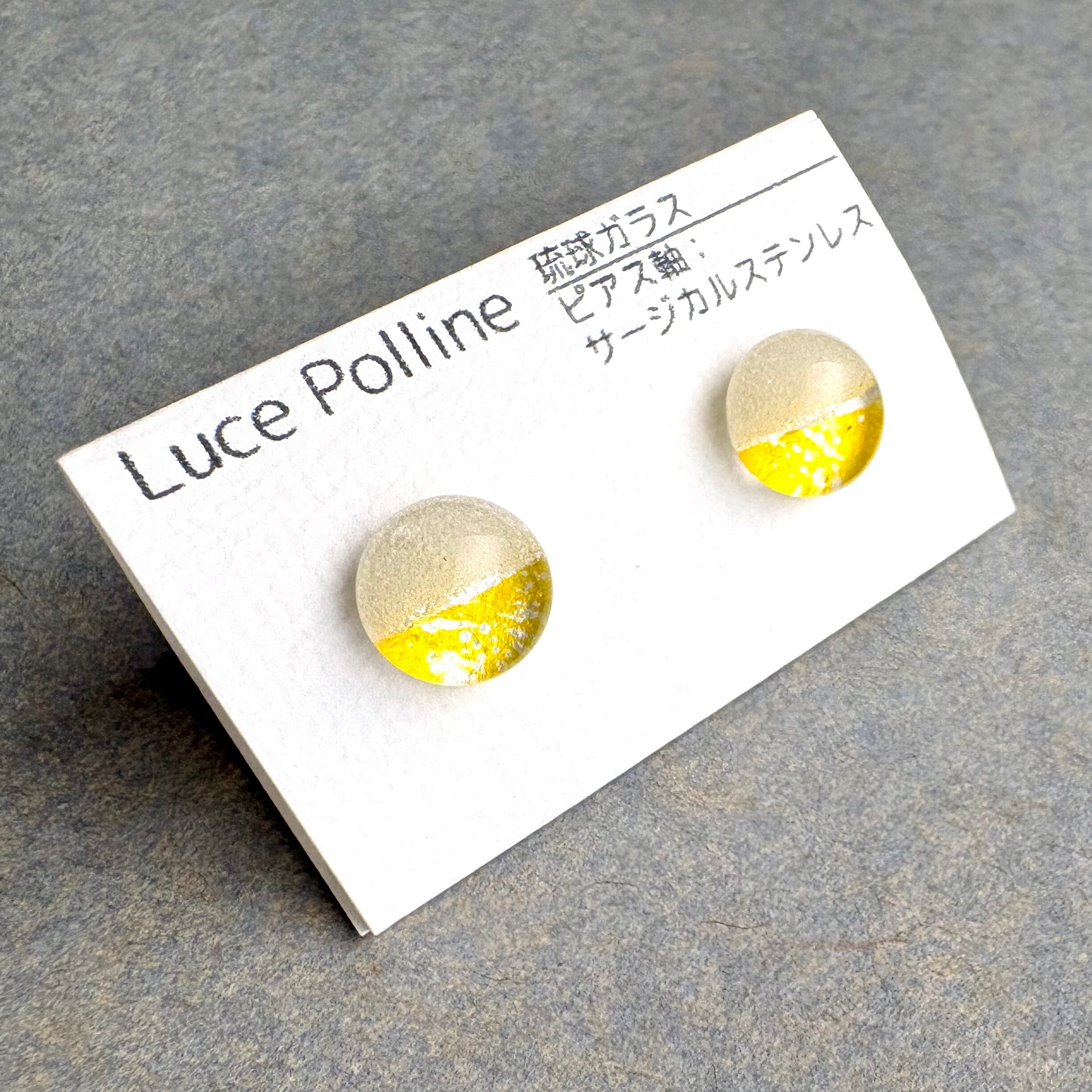 透明な黄色と泡のガラスを組み合わせたら、グラスに注いだビールのようなガラスの粒になりました。琉球ガラスの粒です。