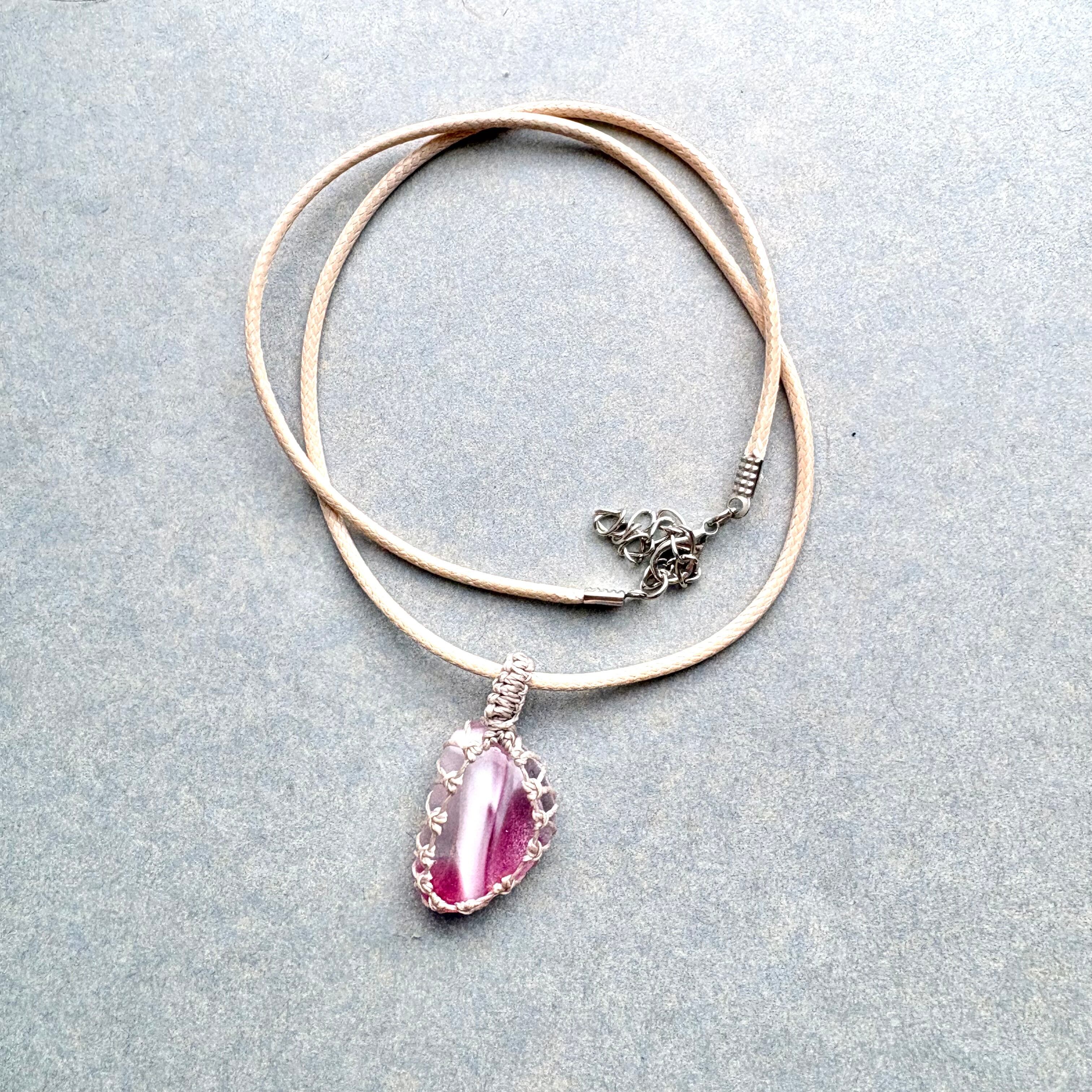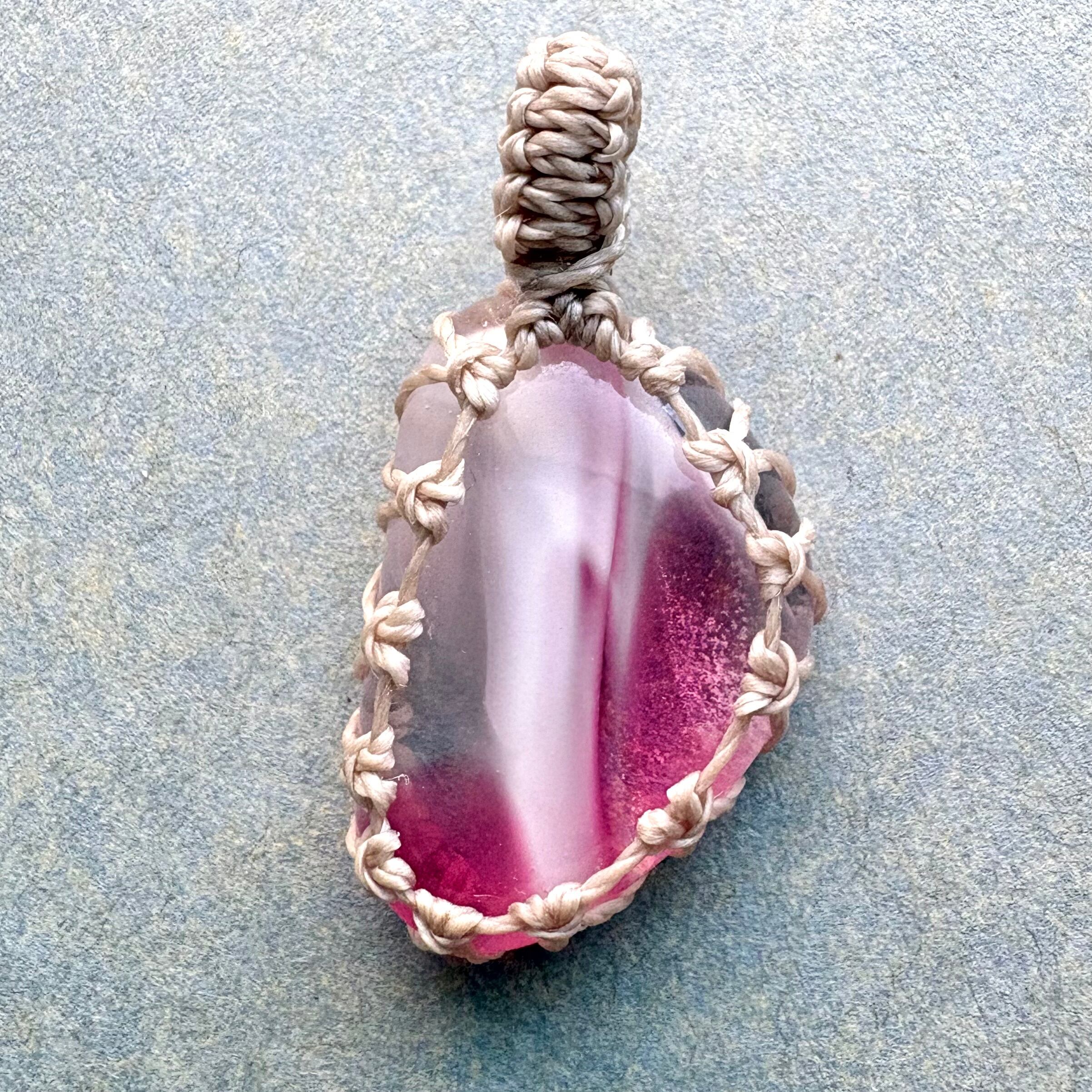 琉球ガラスの個性的な粒をマクラメ編みで包んでペンダントにしました。