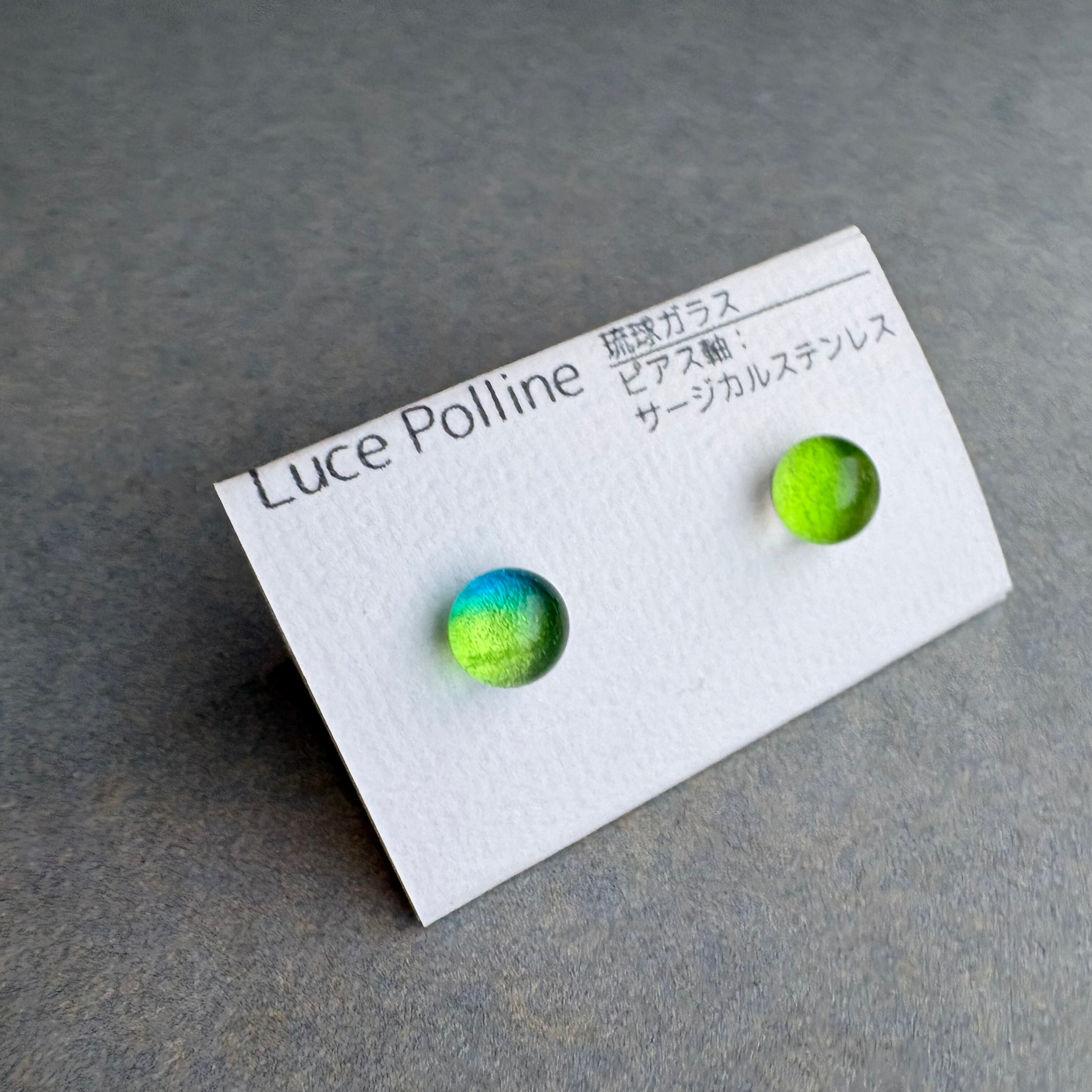 透明な緑色に、ほんのわずかに水色のガラスがかかり、朝露をイメージさせる琉球ガラスの粒です