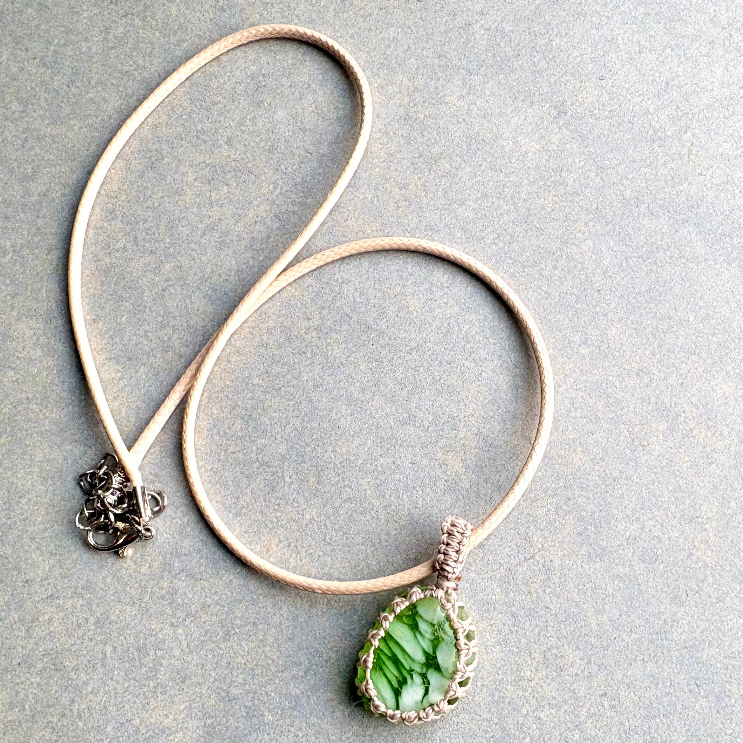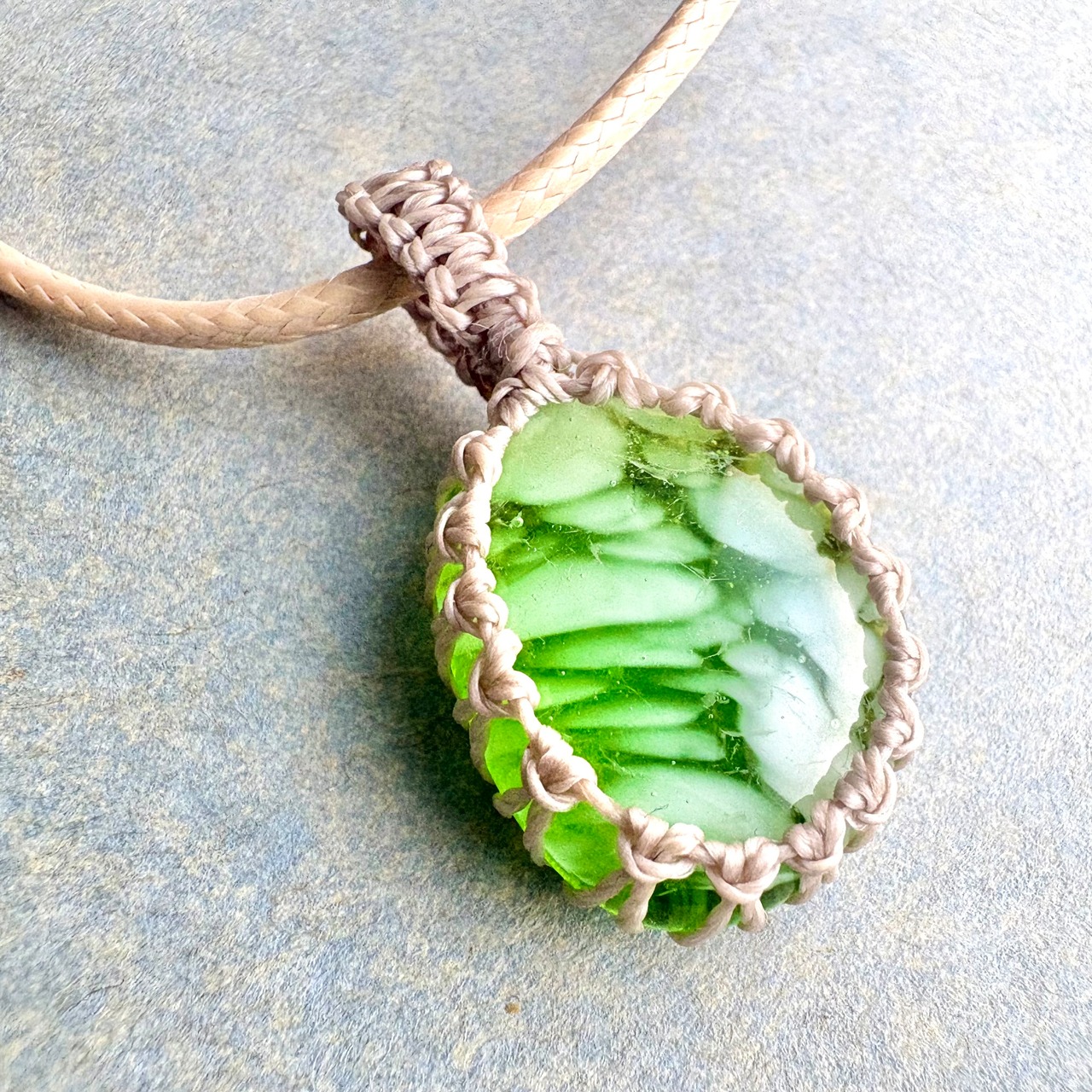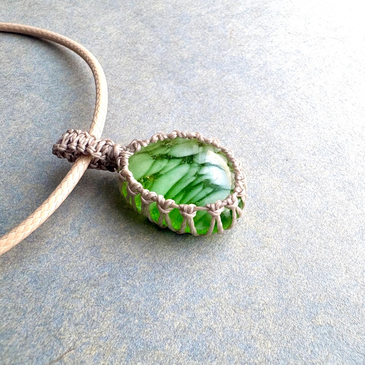 琉球ガラスの個性的な粒をマクラメ編みで包んでペンダントにしました。