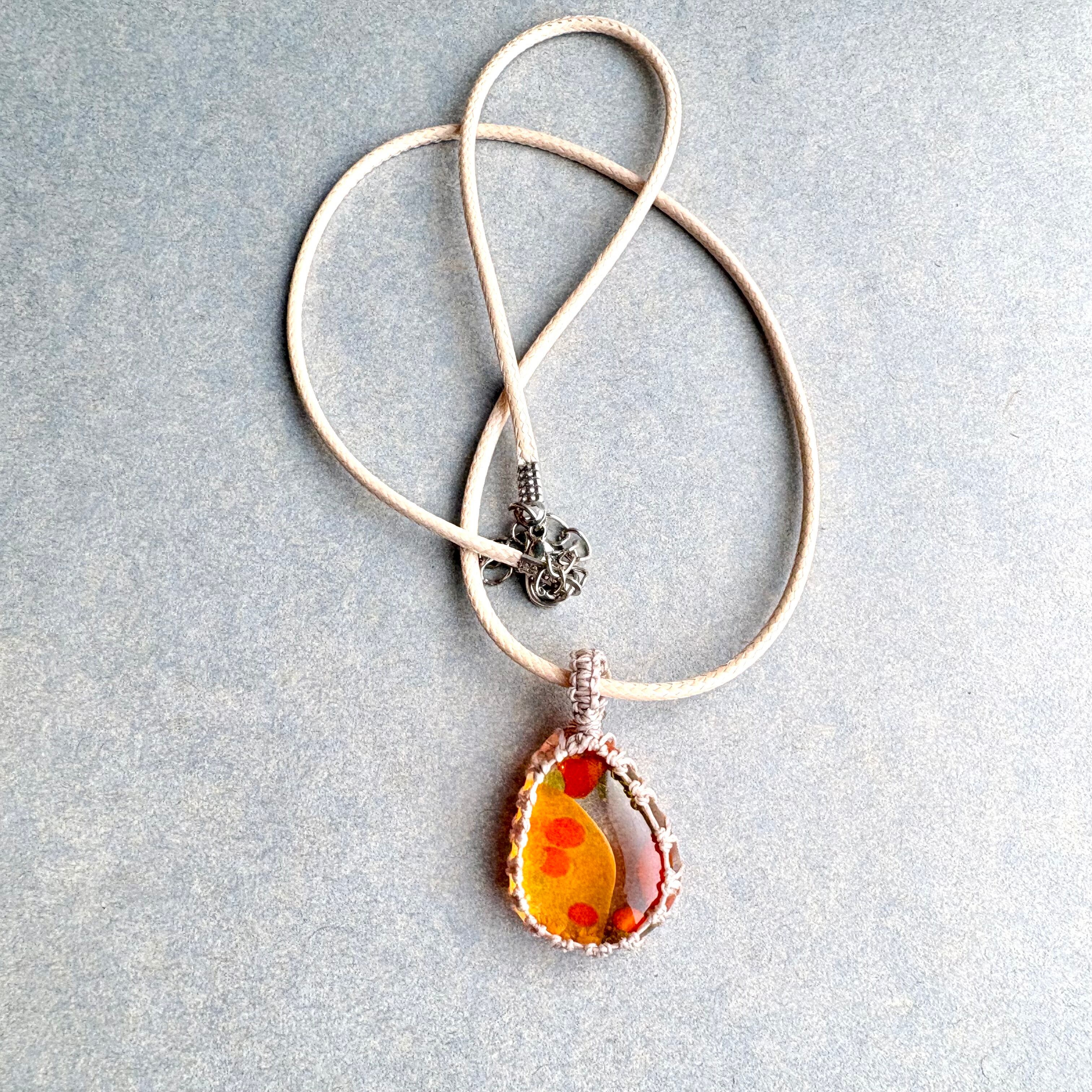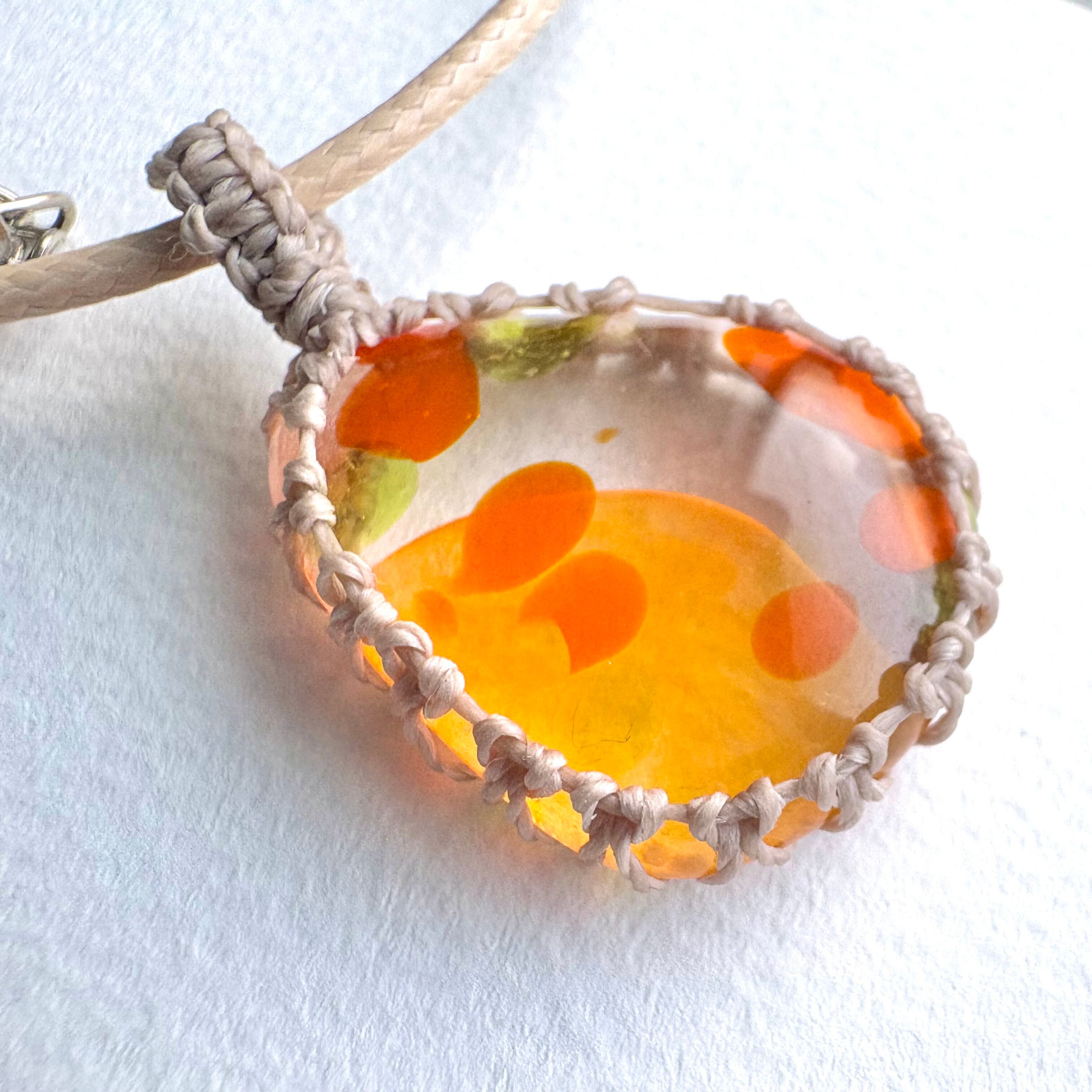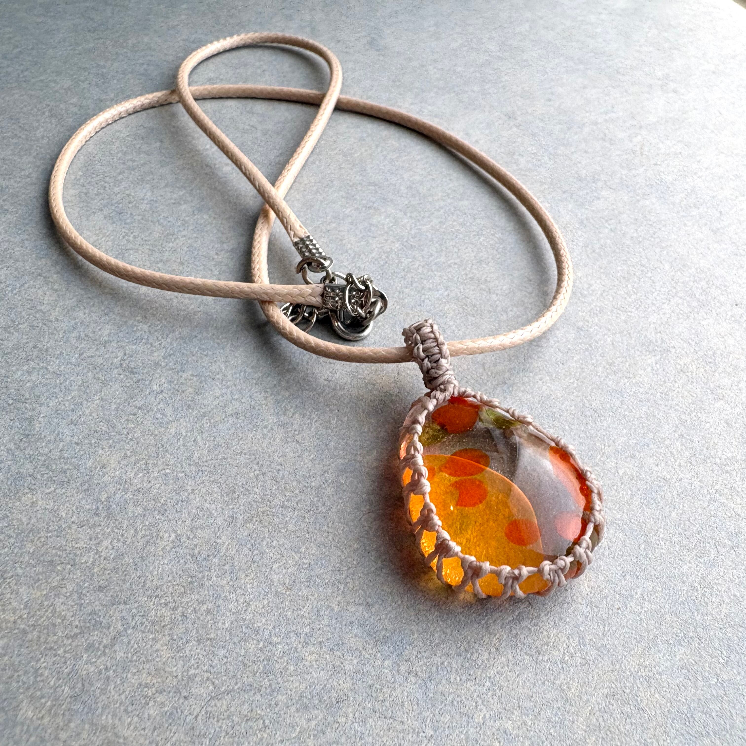 琉球ガラスの個性的な粒をマクラメ編みで包んでペンダントにしました。
