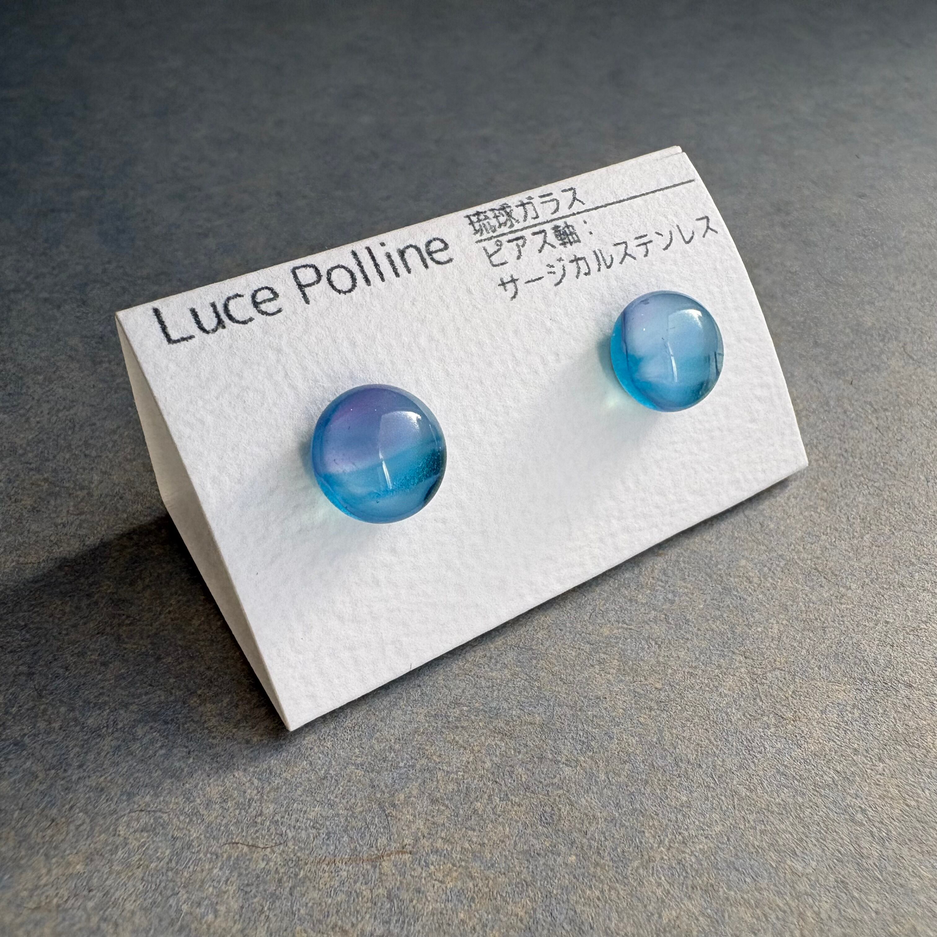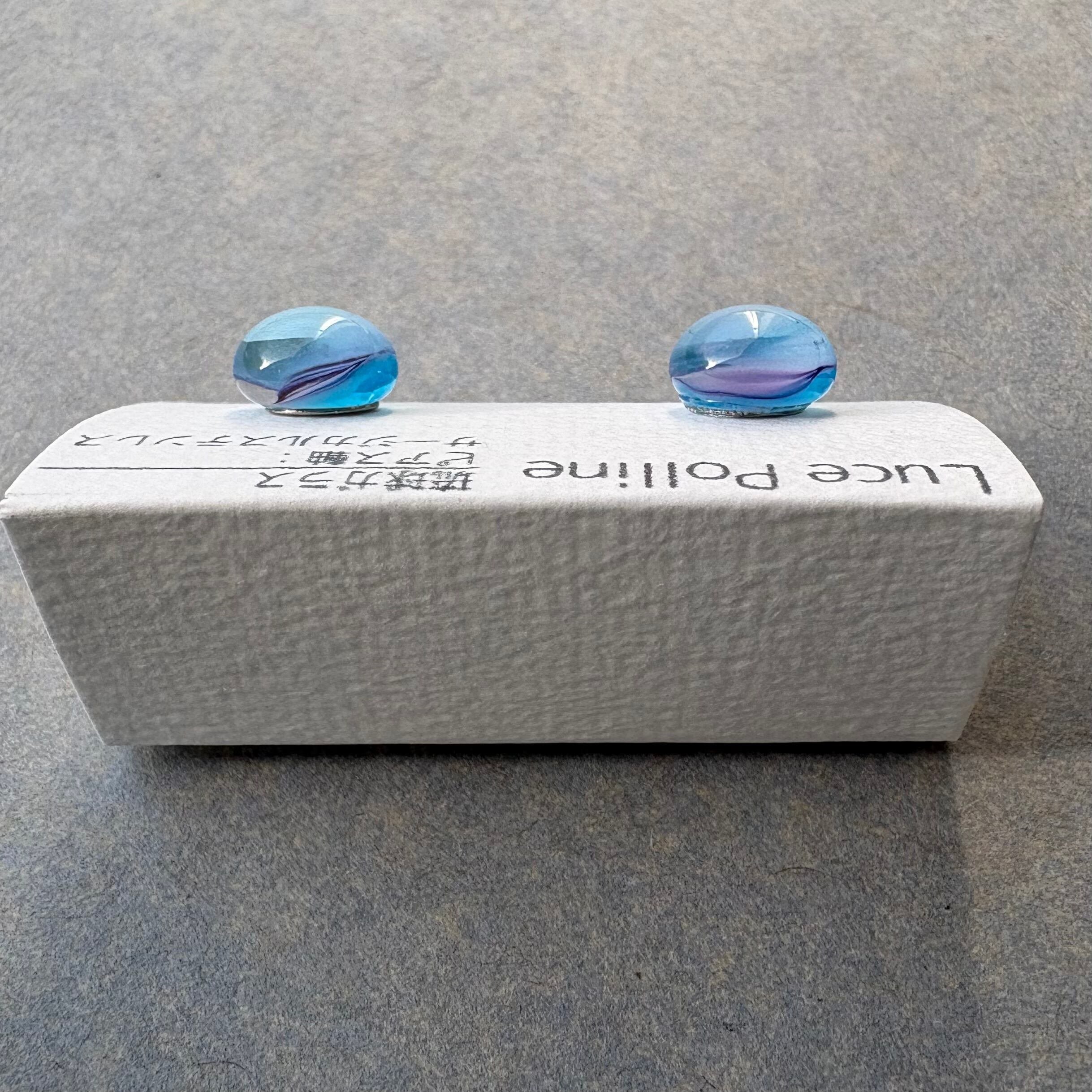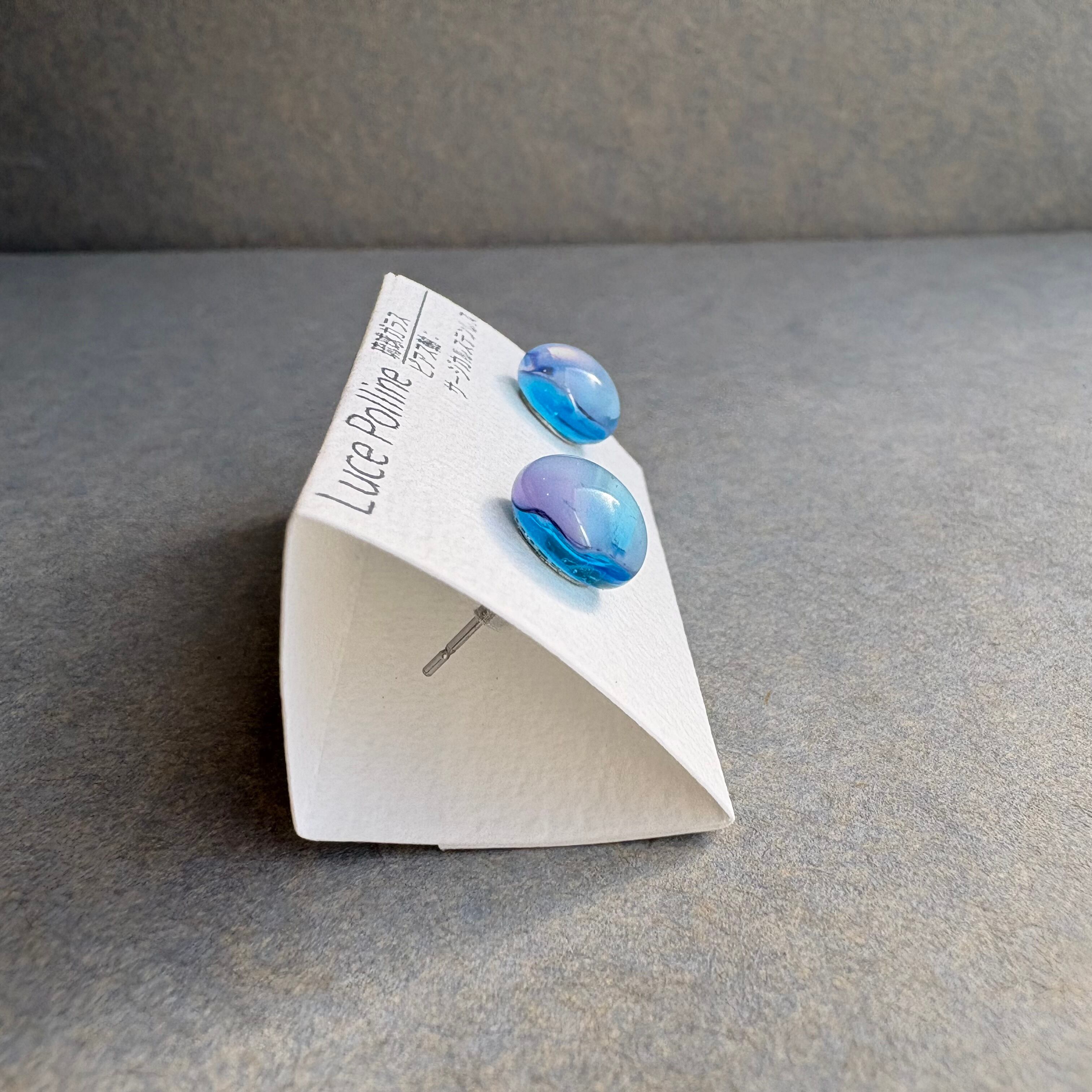 淡い水色と紫色が混じり合い、微睡みの中の夢を見ているような琉球ガラスの粒です