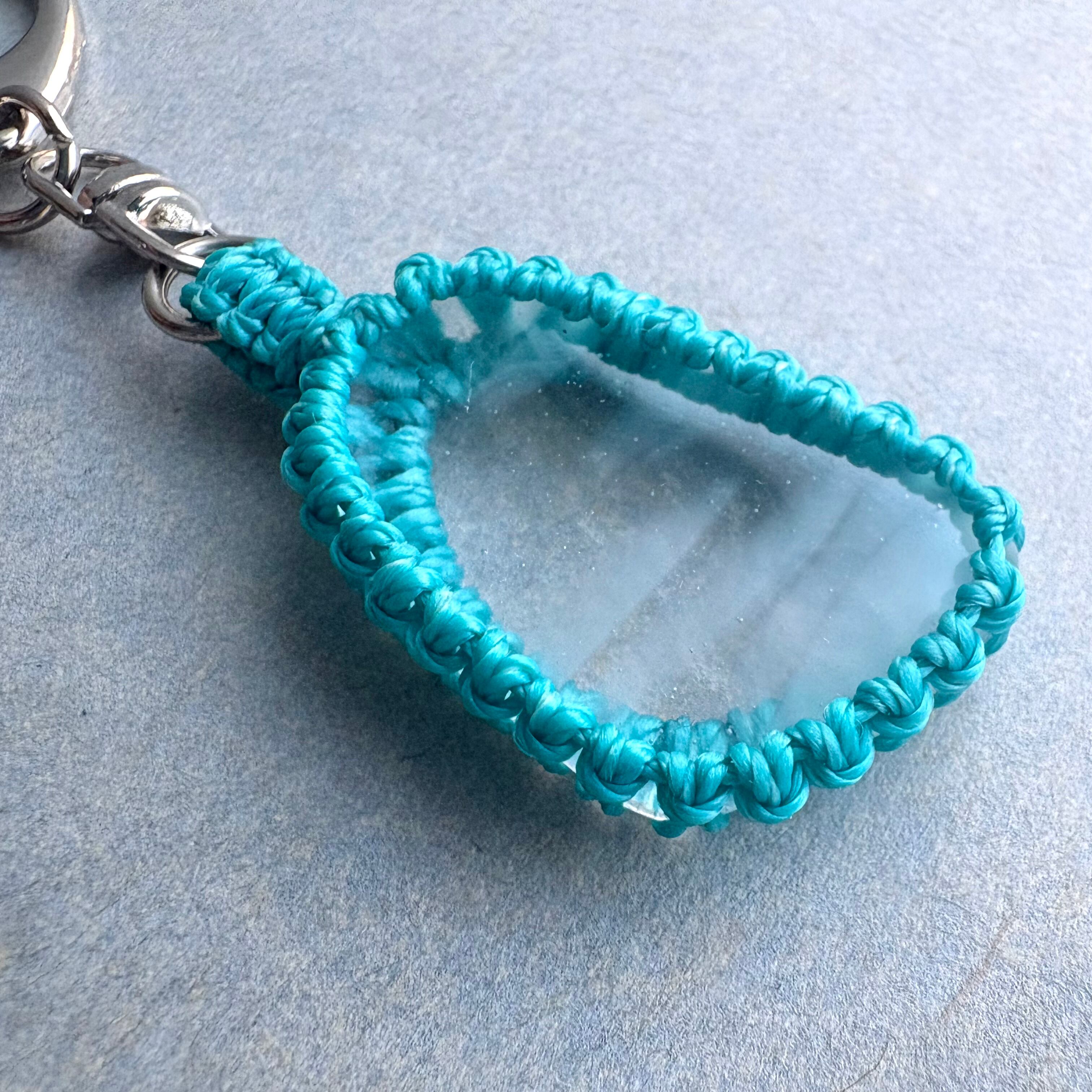 琉球ガラスの個性的な粒をマクラメ編みで包んでチャームにしました。