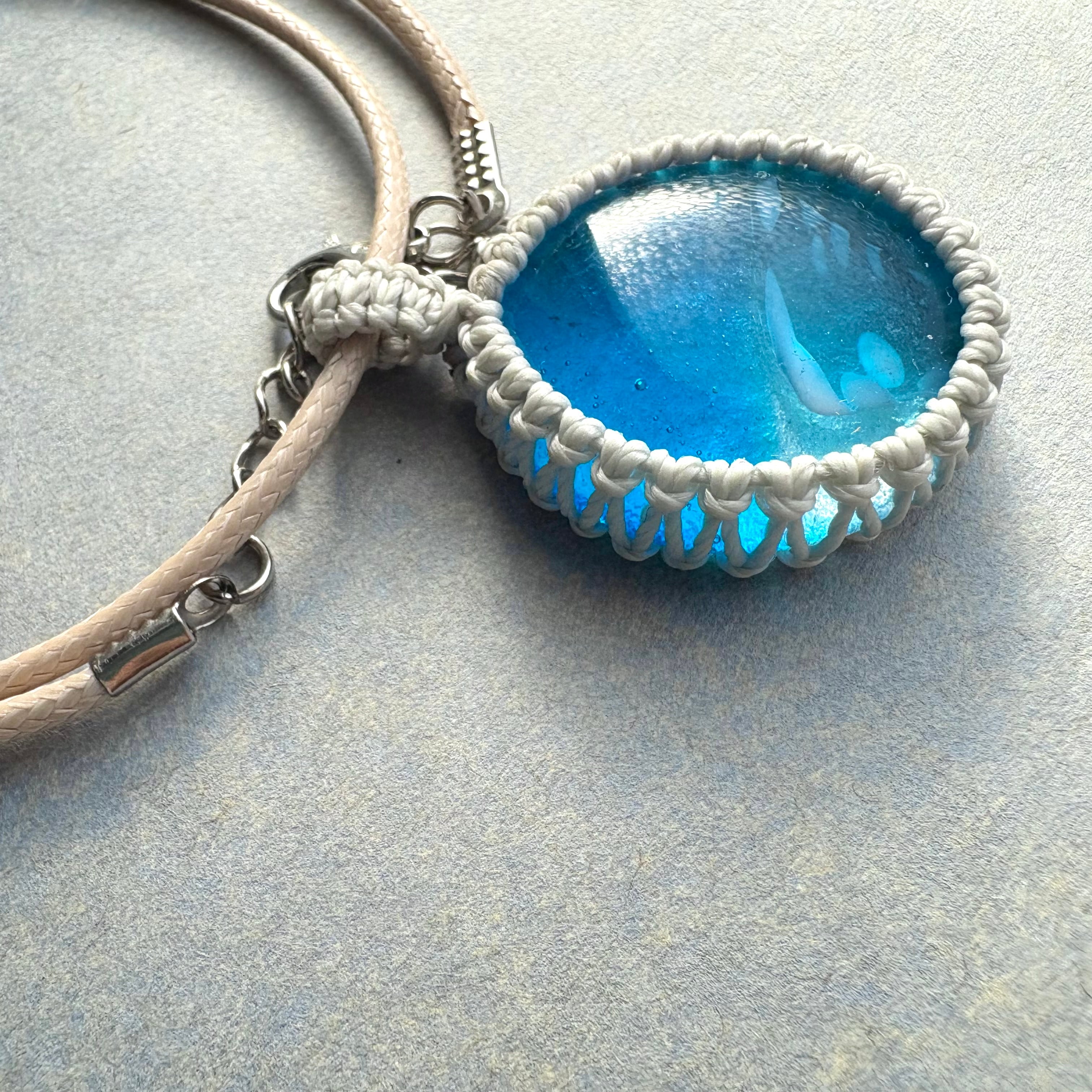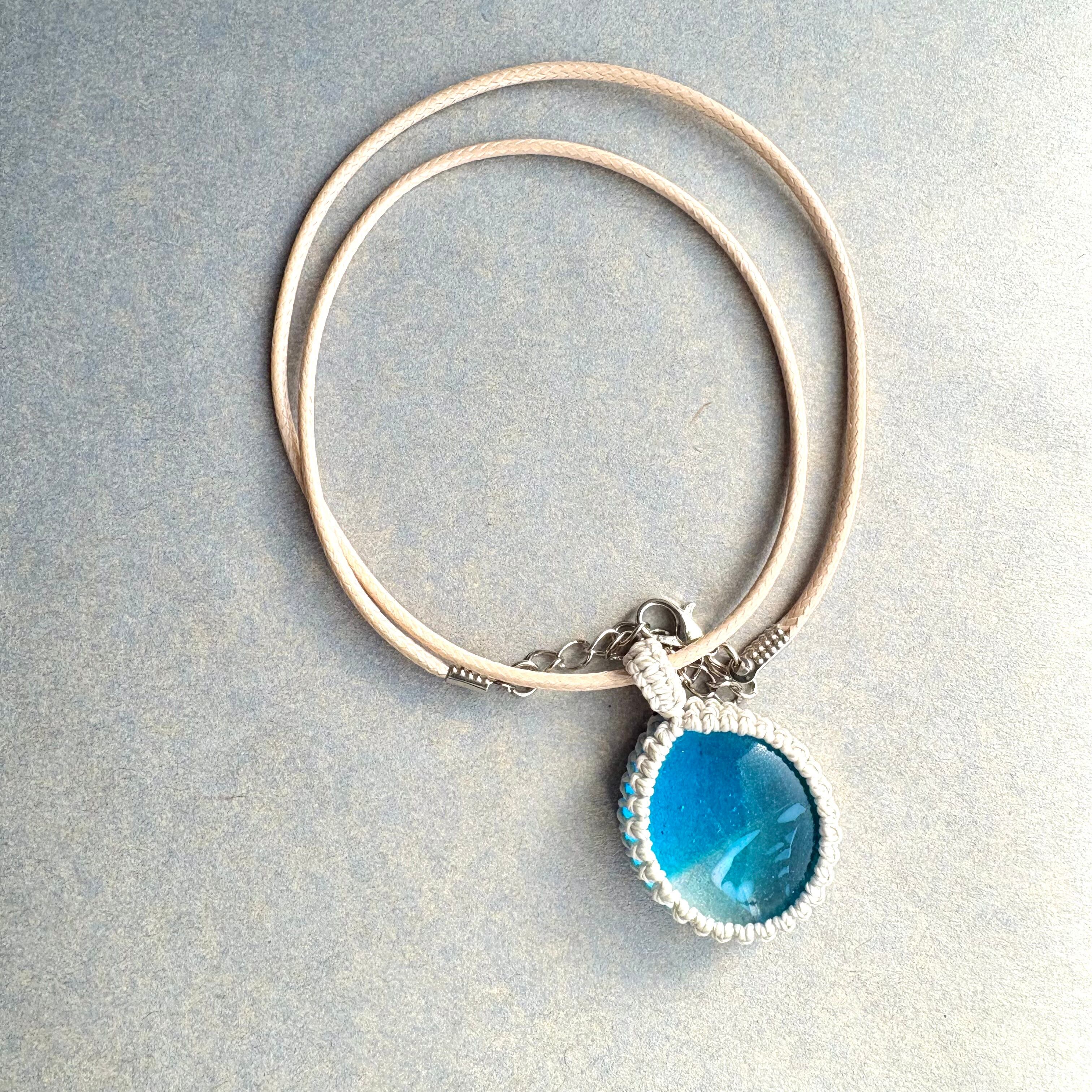 琉球ガラスの個性的な粒をマクラメ編みで包んでペンダントにしました。