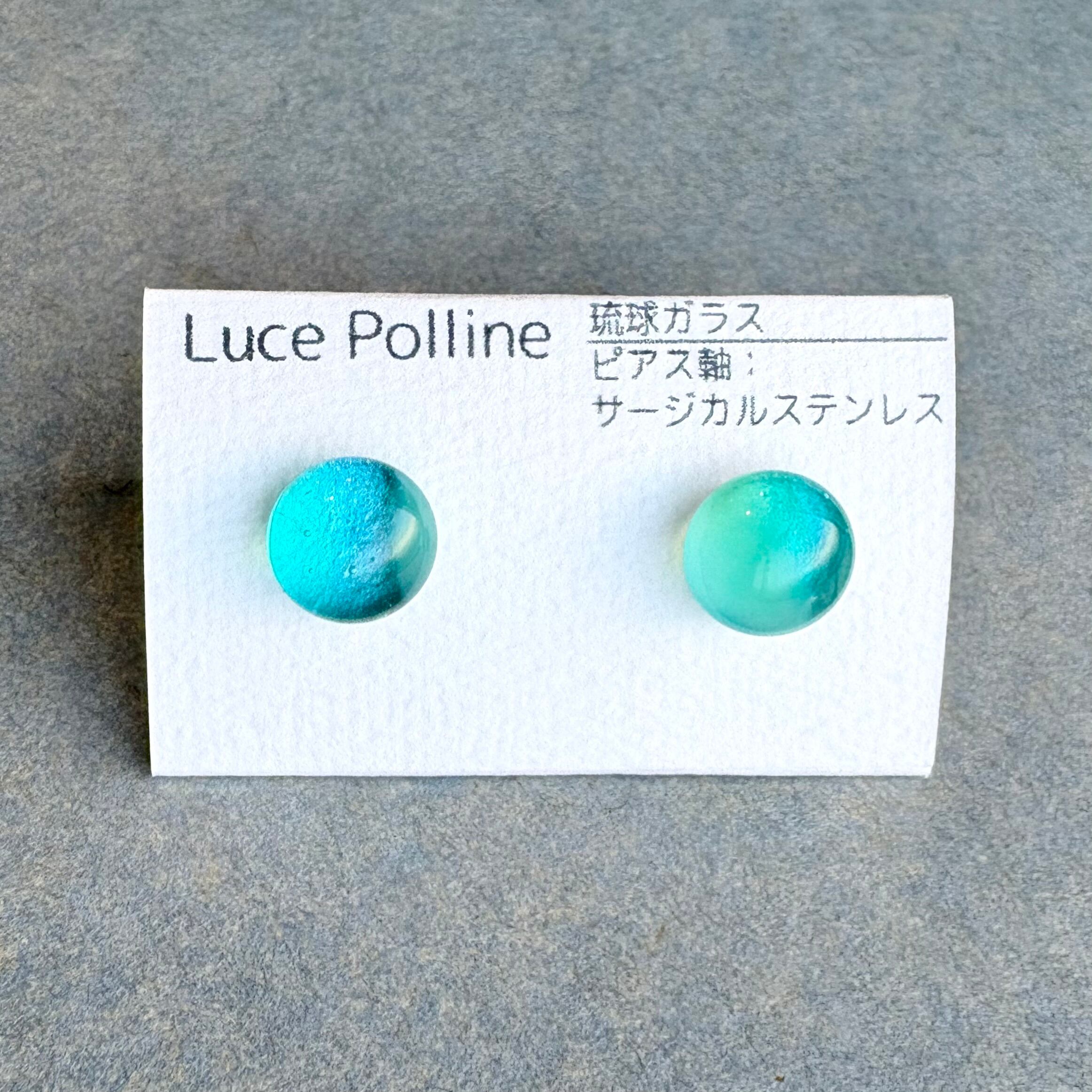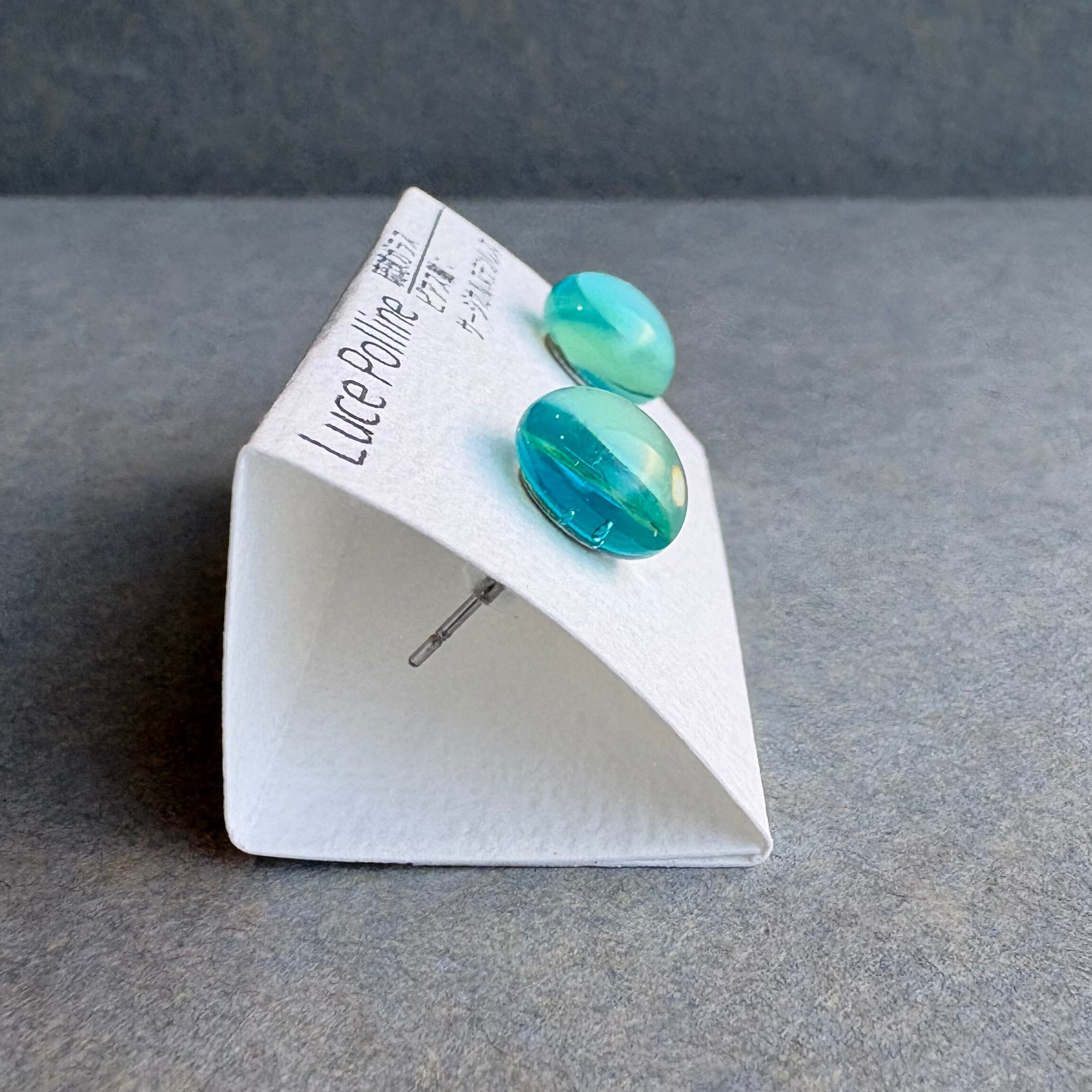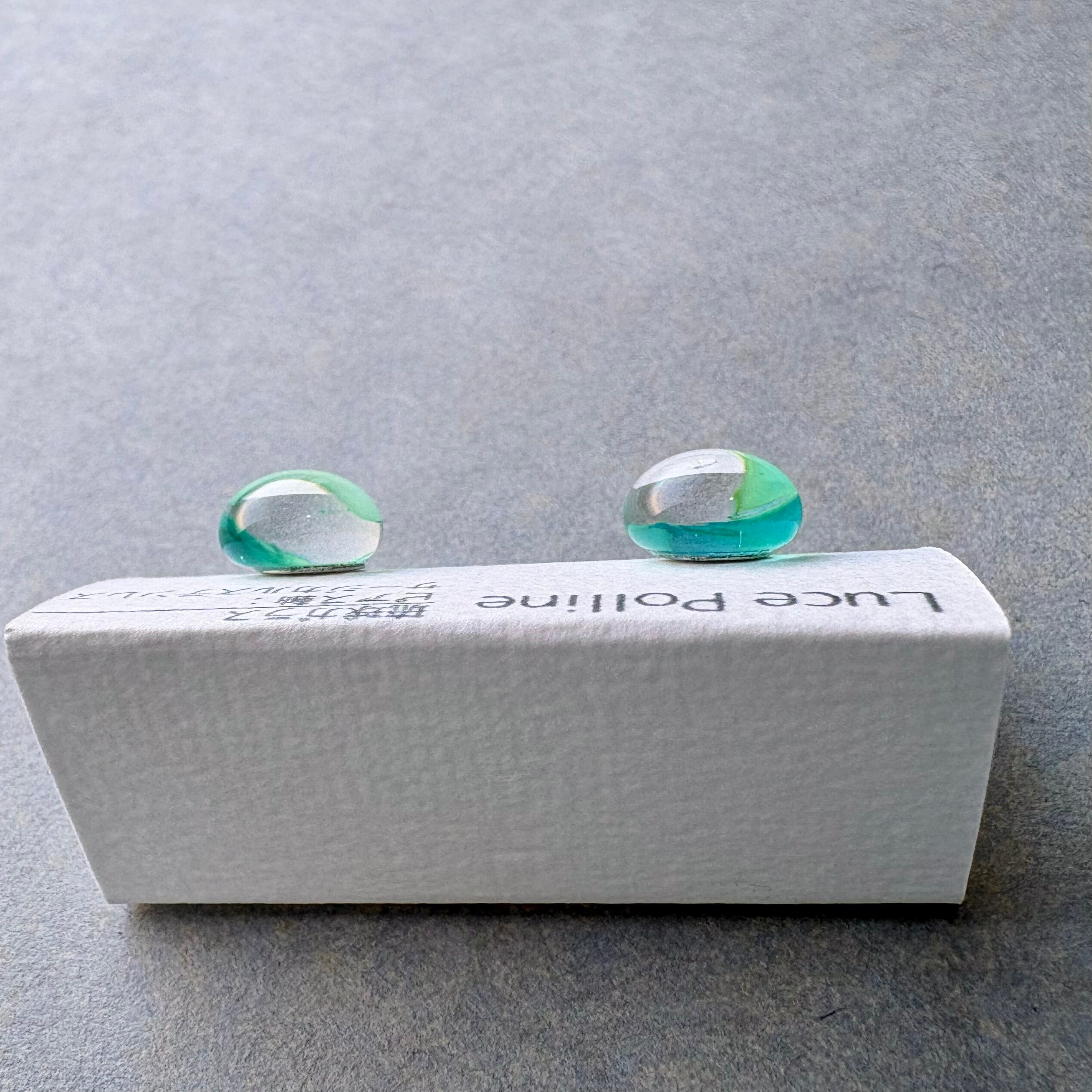透明なガラスと水色のガラスの間に薄く緑がかった層がある琉球ガラスの粒です。