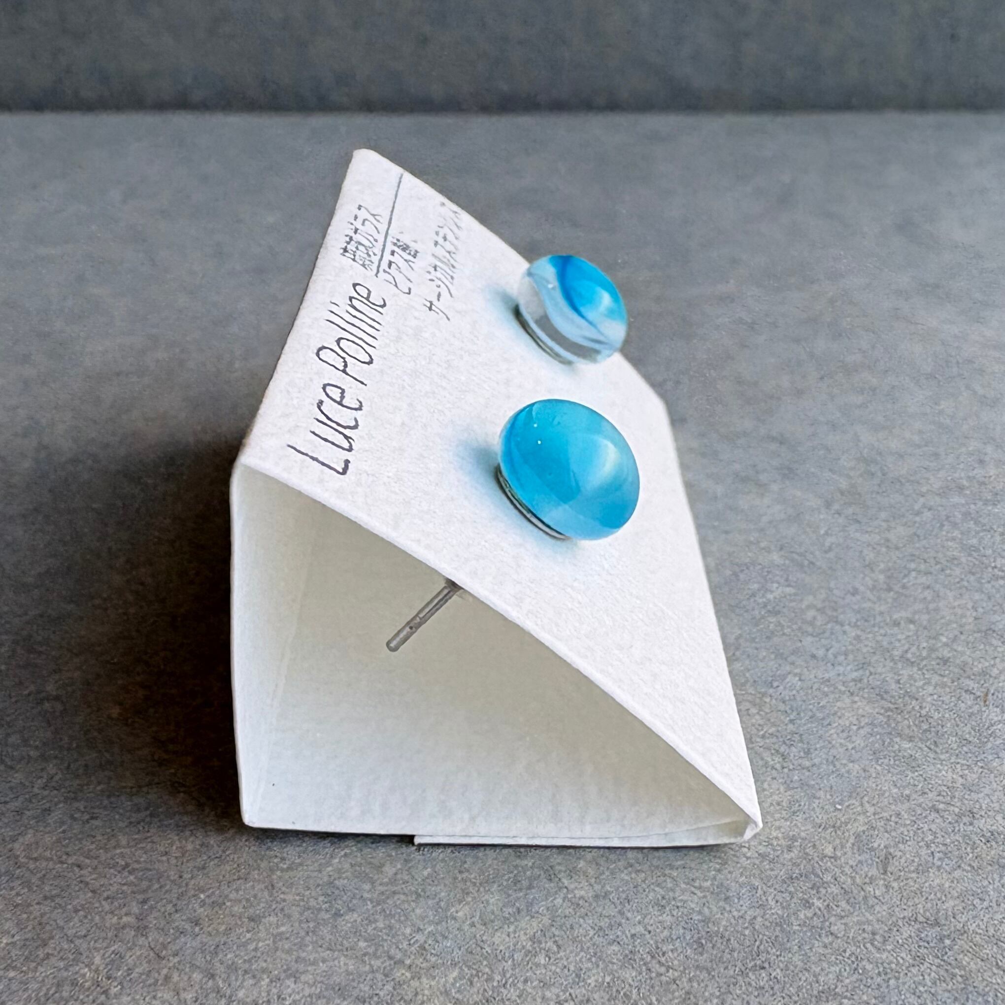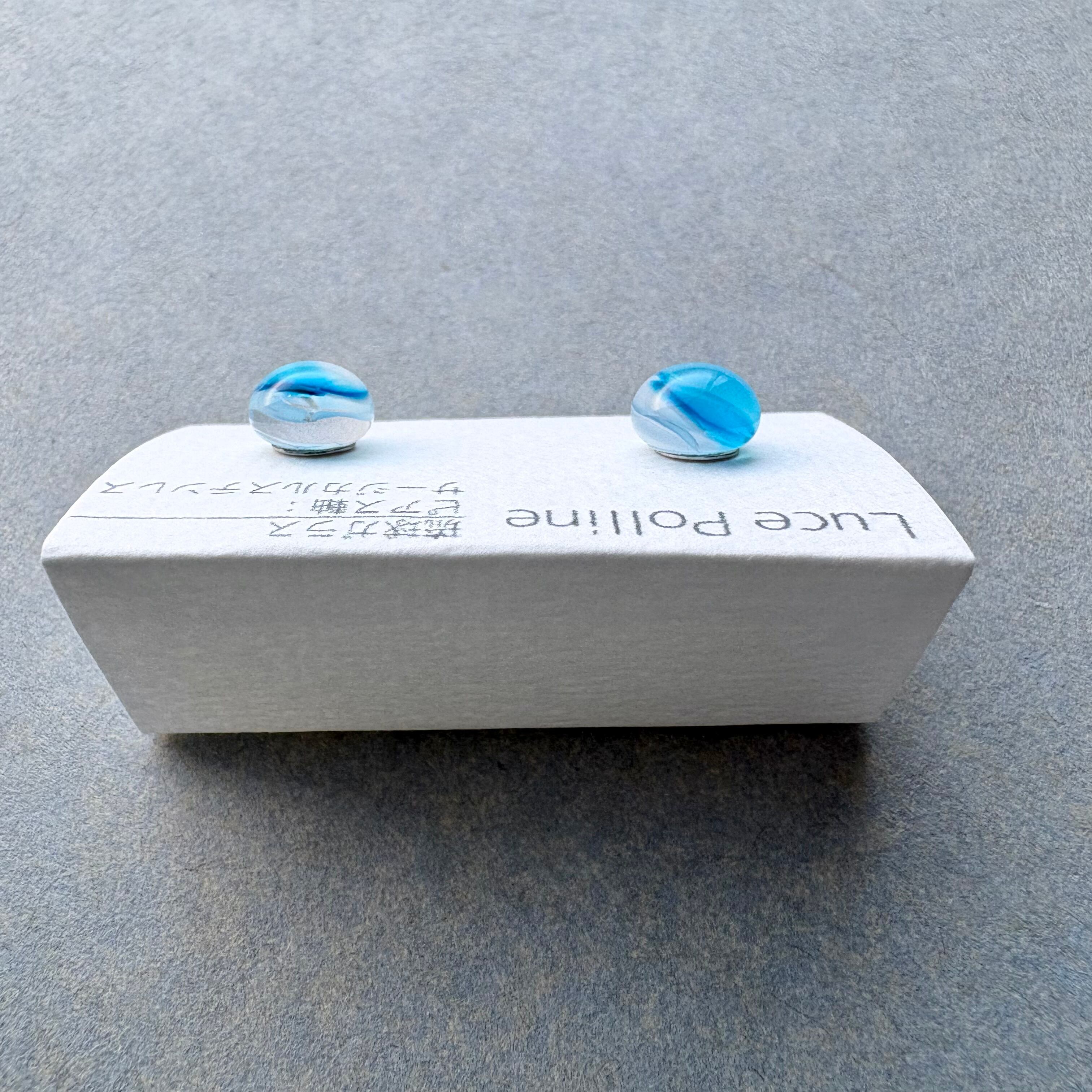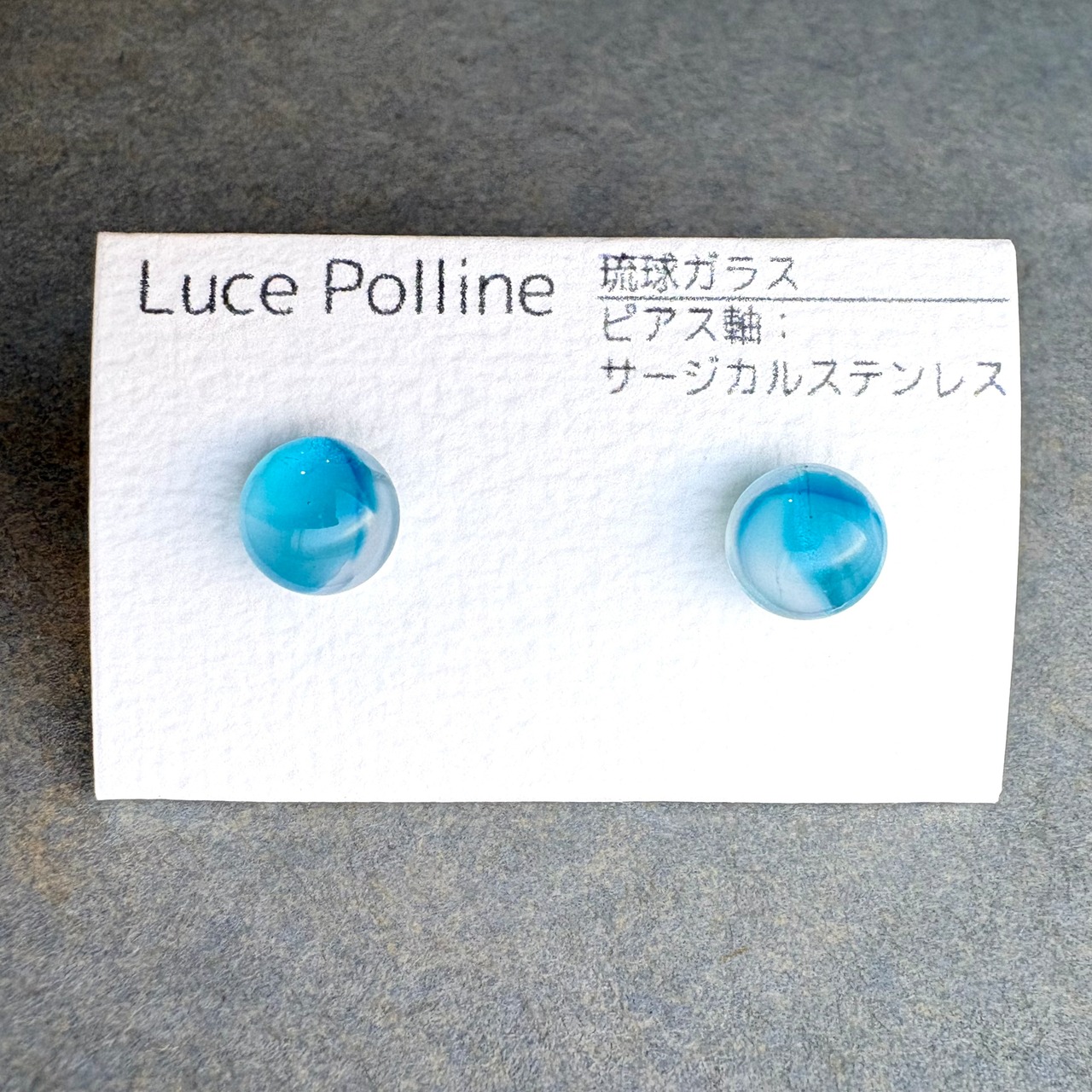 透明と白と明るい水色が層を織りなす琉球ガラスの粒です。