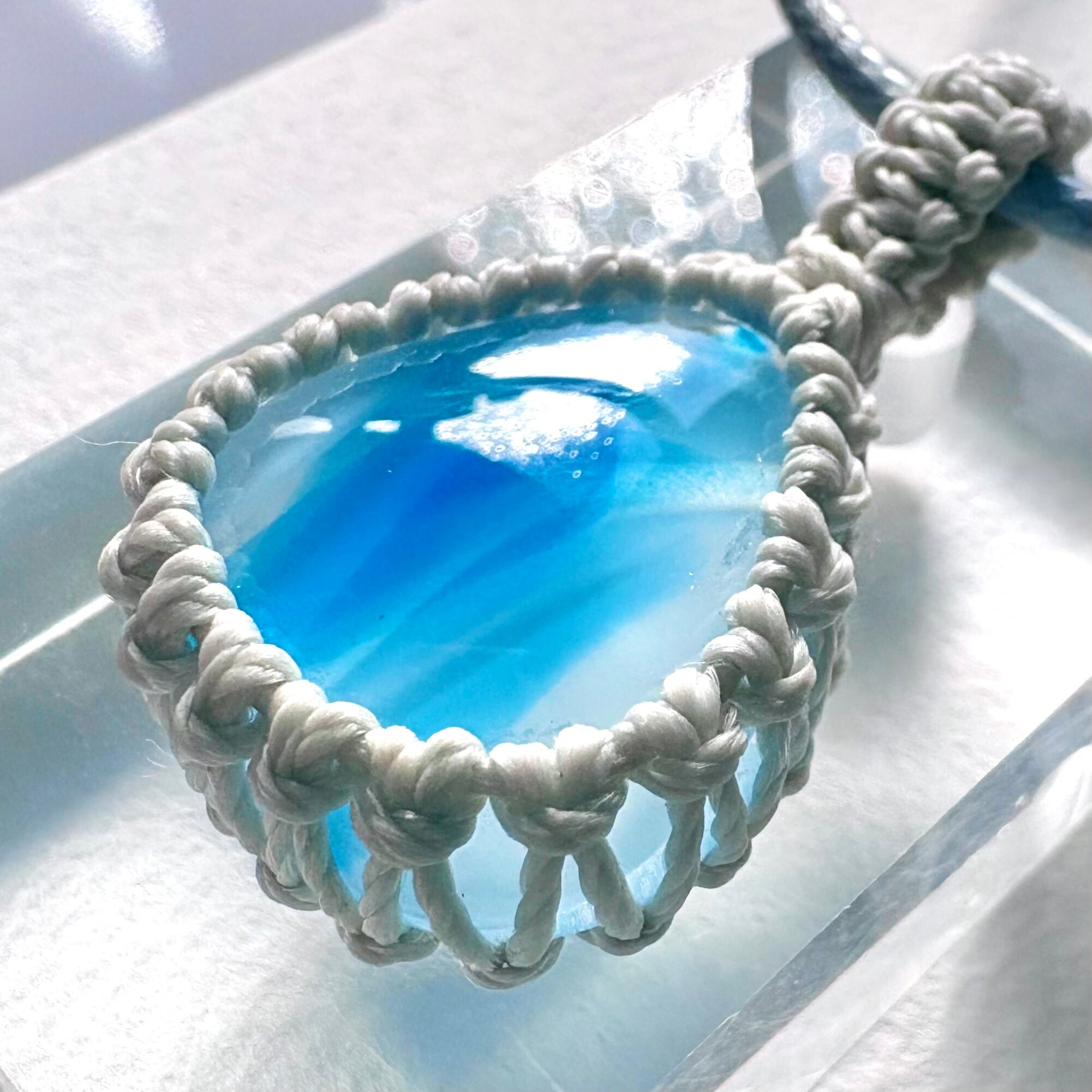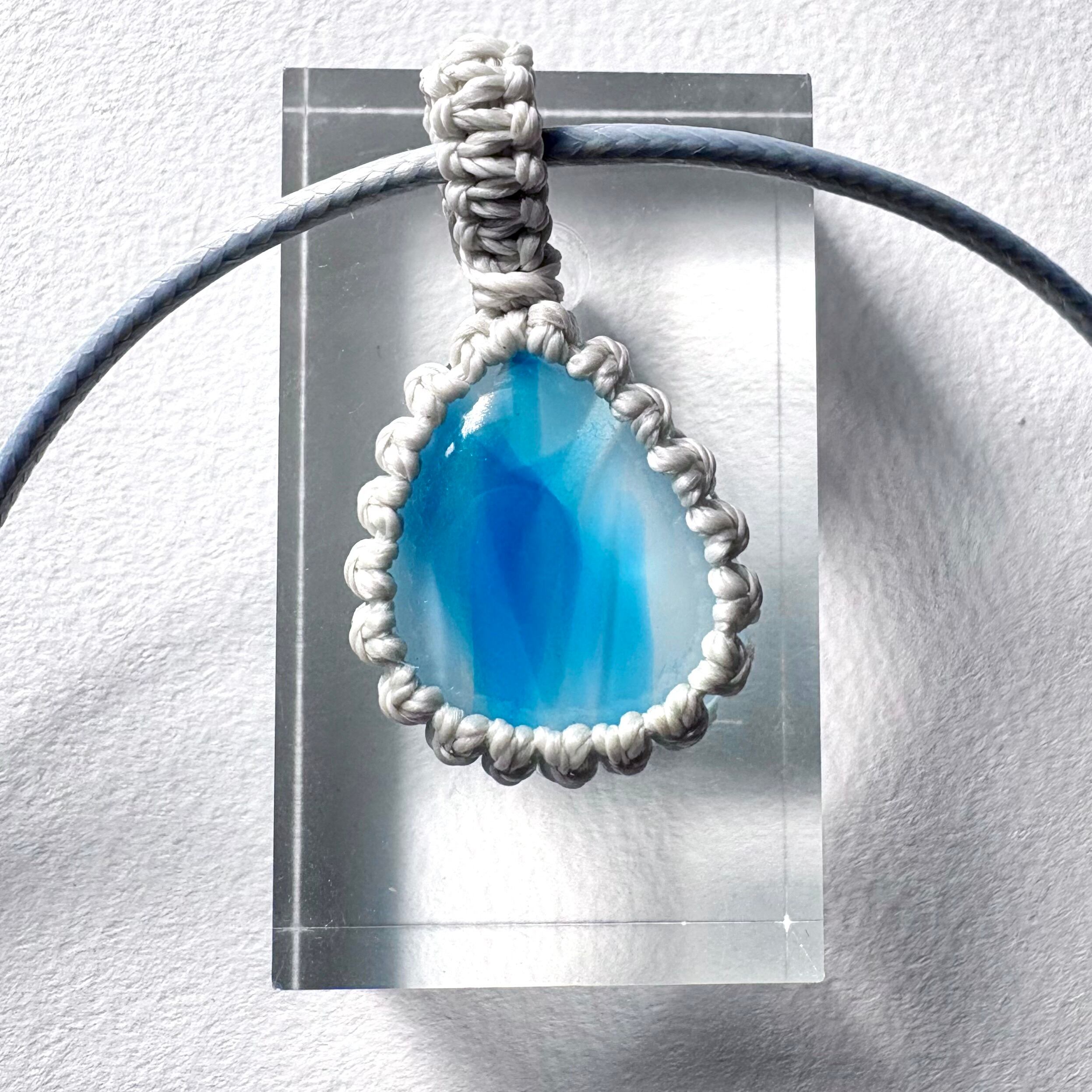 琉球ガラスの個性的な粒をマクラメ編みで包んでペンダントにしました。