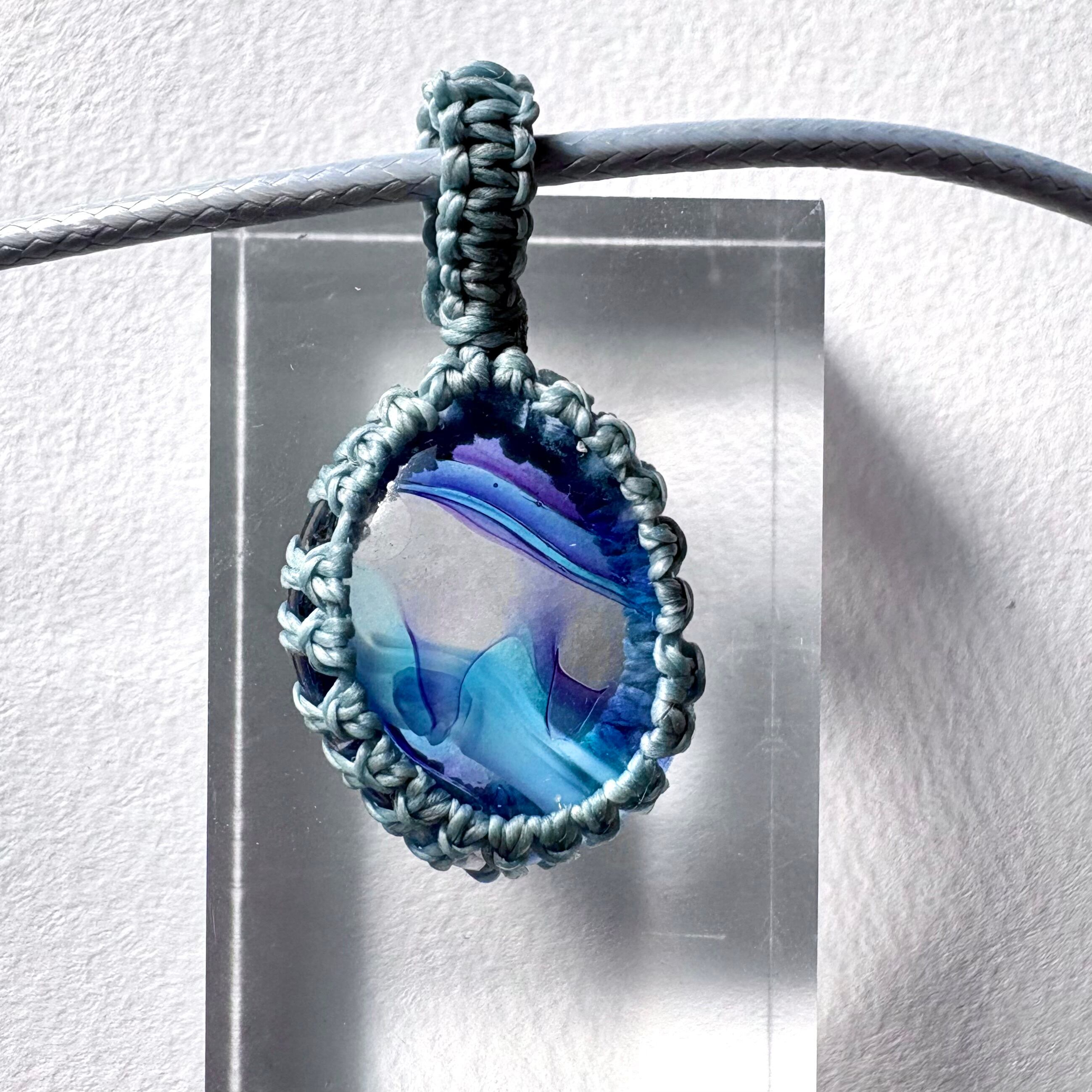 琉球ガラスの個性的な粒をマクラメ編みで包んでペンダントにしました。