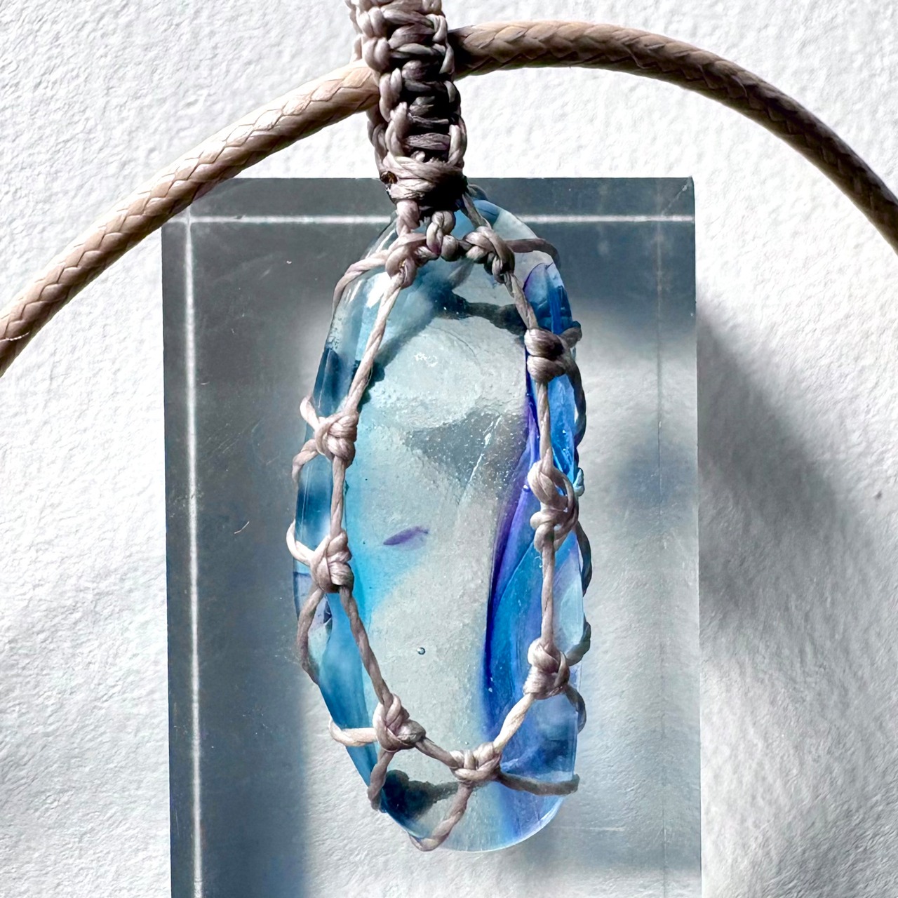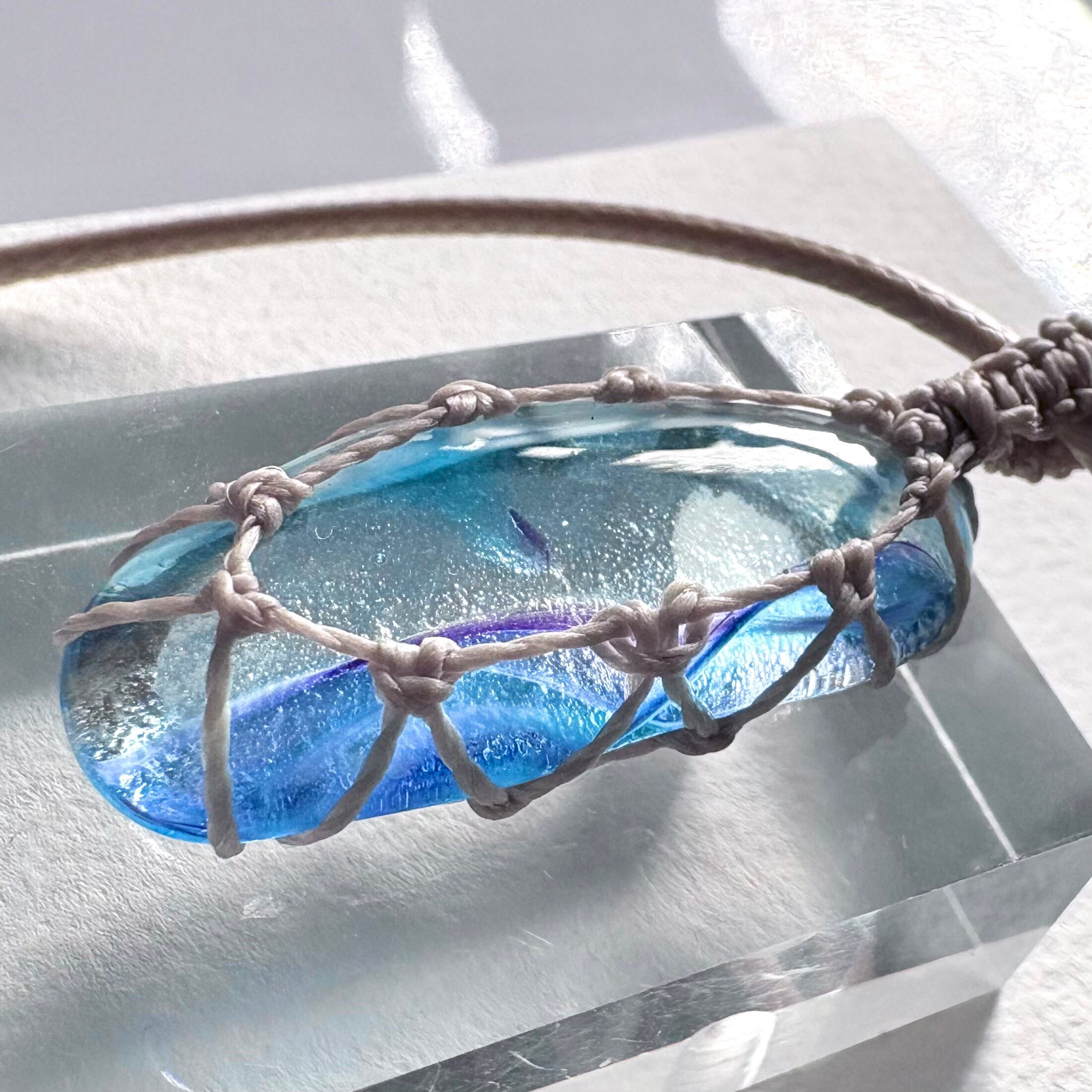 琉球ガラスの個性的な粒をマクラメ編みで包んでペンダントにしました。