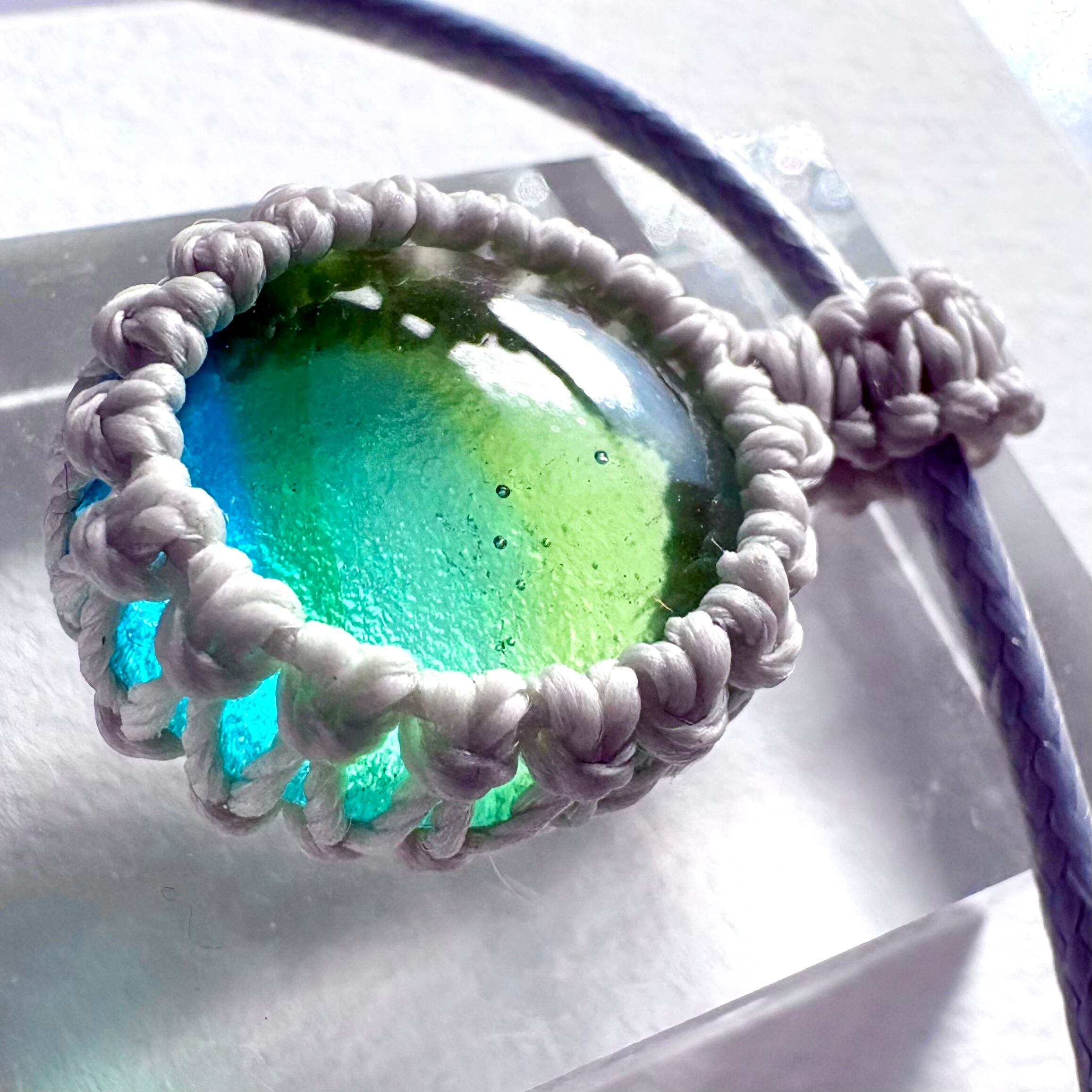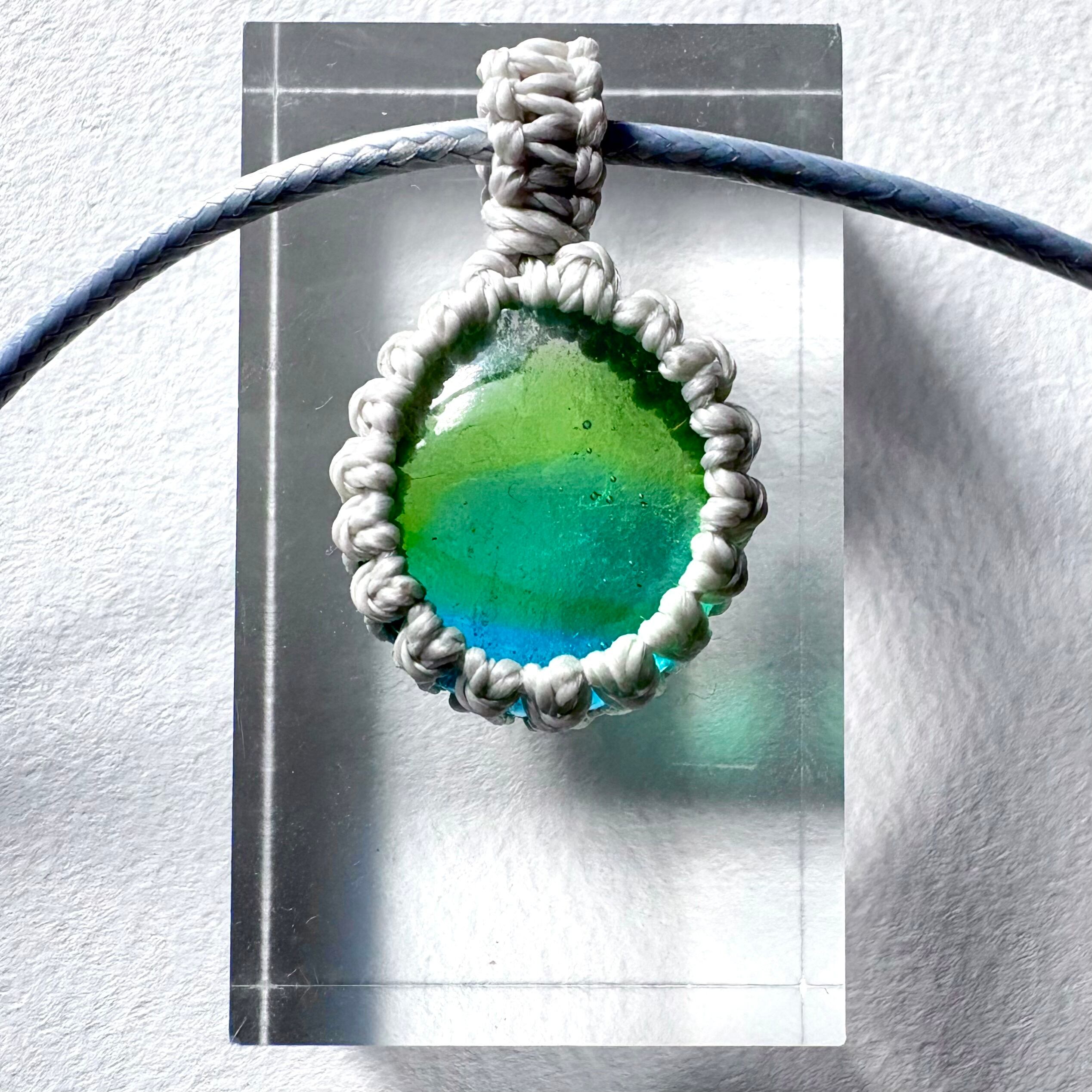 琉球ガラスの個性的な粒をマクラメ編みで包んでペンダントにしました。
